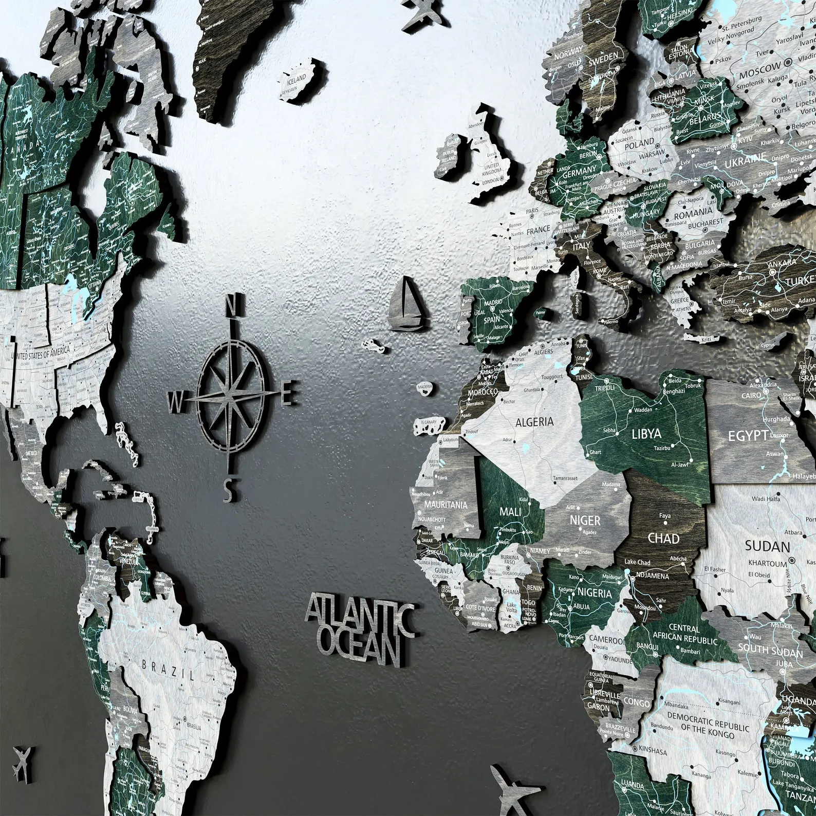 ? Features of the world map: a hidden base under the map creating a floating effect on the wall