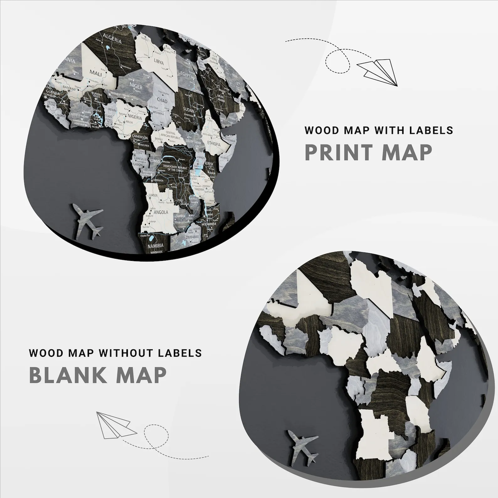 ? Print Map – unique wooden world map with printed inscriptions of countries, capitals, cities, rivers and lakes, roads