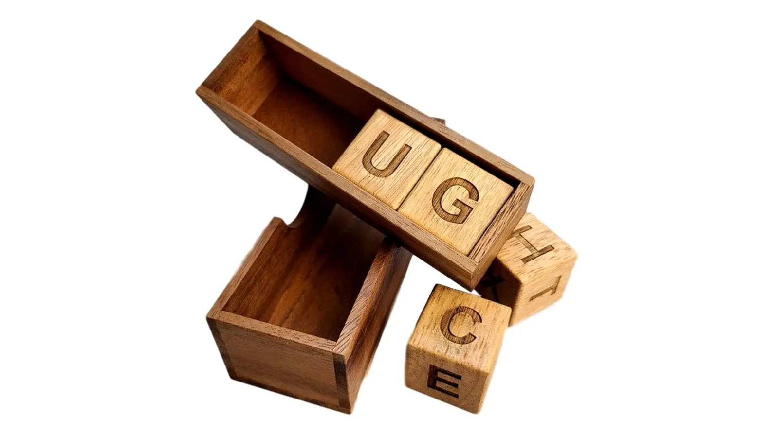Arrange the blocks in a row such that each side shows a four letter word reading left to right. The solution contains words with no proper names allowed. The hardwood blocks are about 1 3/8? cubes with the letter deeply laser engraved into the surface. The cubes come packed with wood box and laser engraved cover.I don?t provide the full solution with the puzzle, but do provide a couple hints that should get you most of the way to the solution. Full solution is available by request either with your order or by email.Our own design ? Creative Crafthouse made in our Florida shop.Note, we can make custom versions of this puzzle where you can define the 4 words to be used. You can contact me for info or I will post a separate listing for this. There will be a reasonable cost adder for the custom work.to view a video of the puzzle, copy and paste this link:https://www.youtube.com/watch?v=ix6UmVlNal0