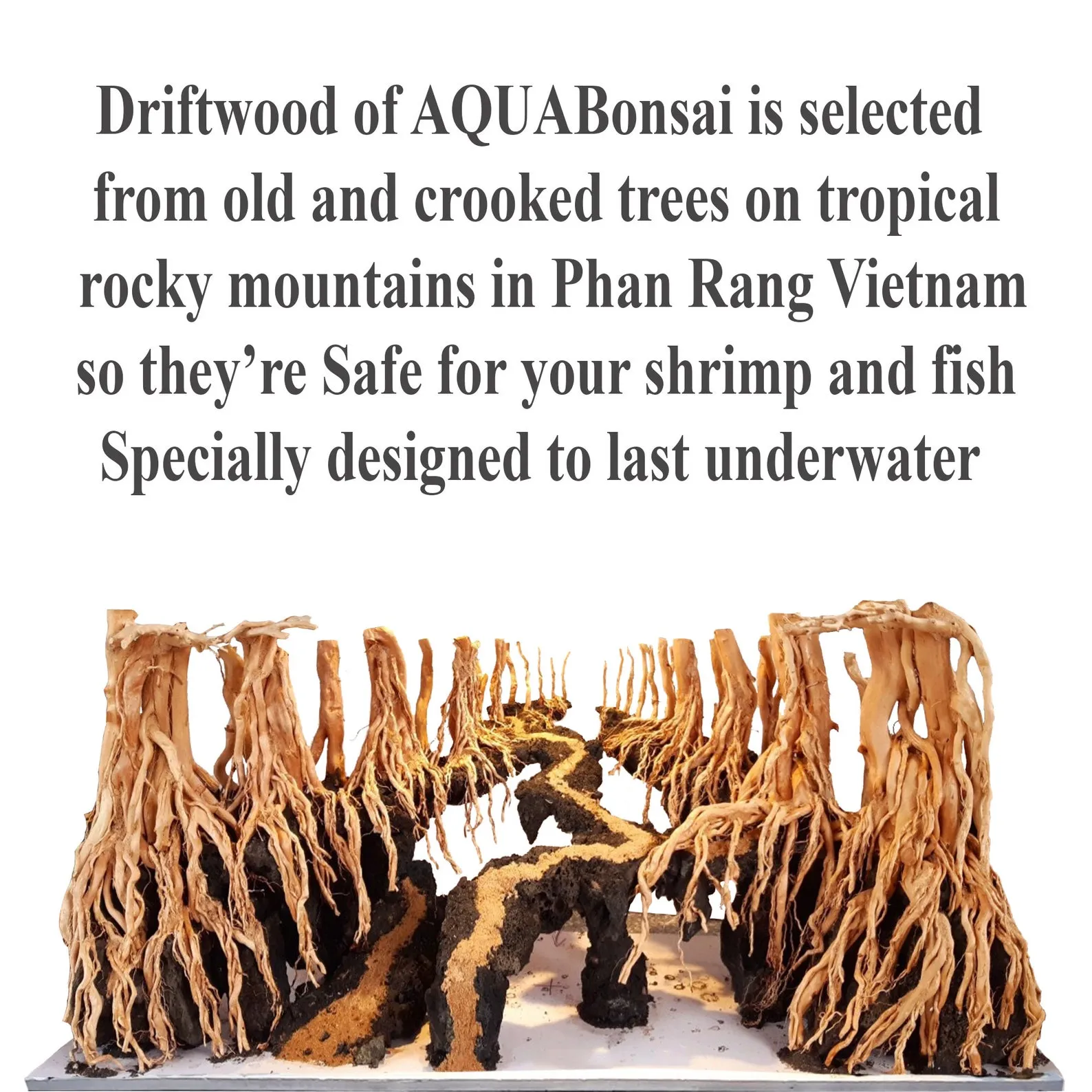 Driftwood Bonsai for fish tank of Aqua Bonsai is carefully selected from hundreds of years old, crooked trees on tropical rocky mountains in Phan Rang Vietnam, and specially designed to last underwater for many many years