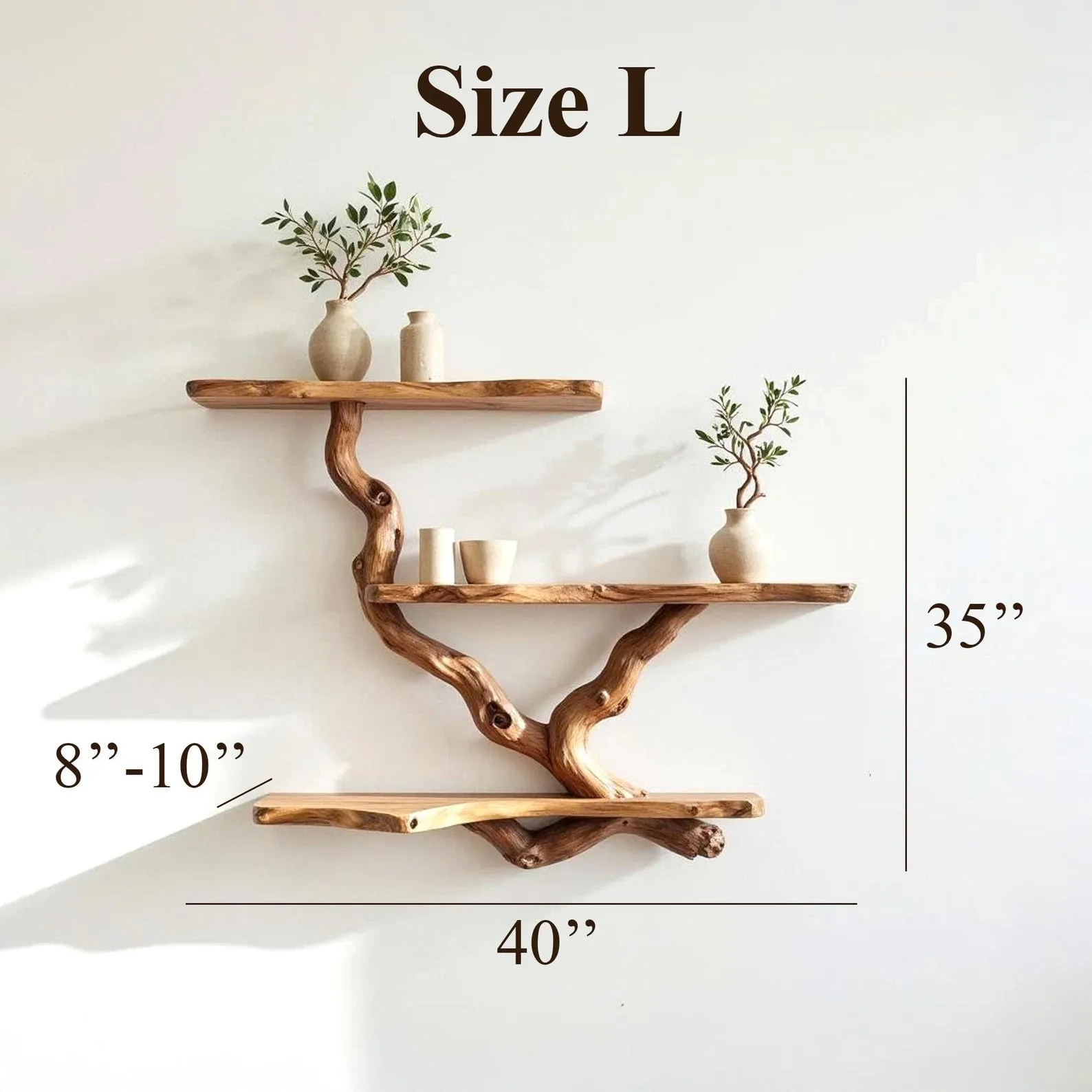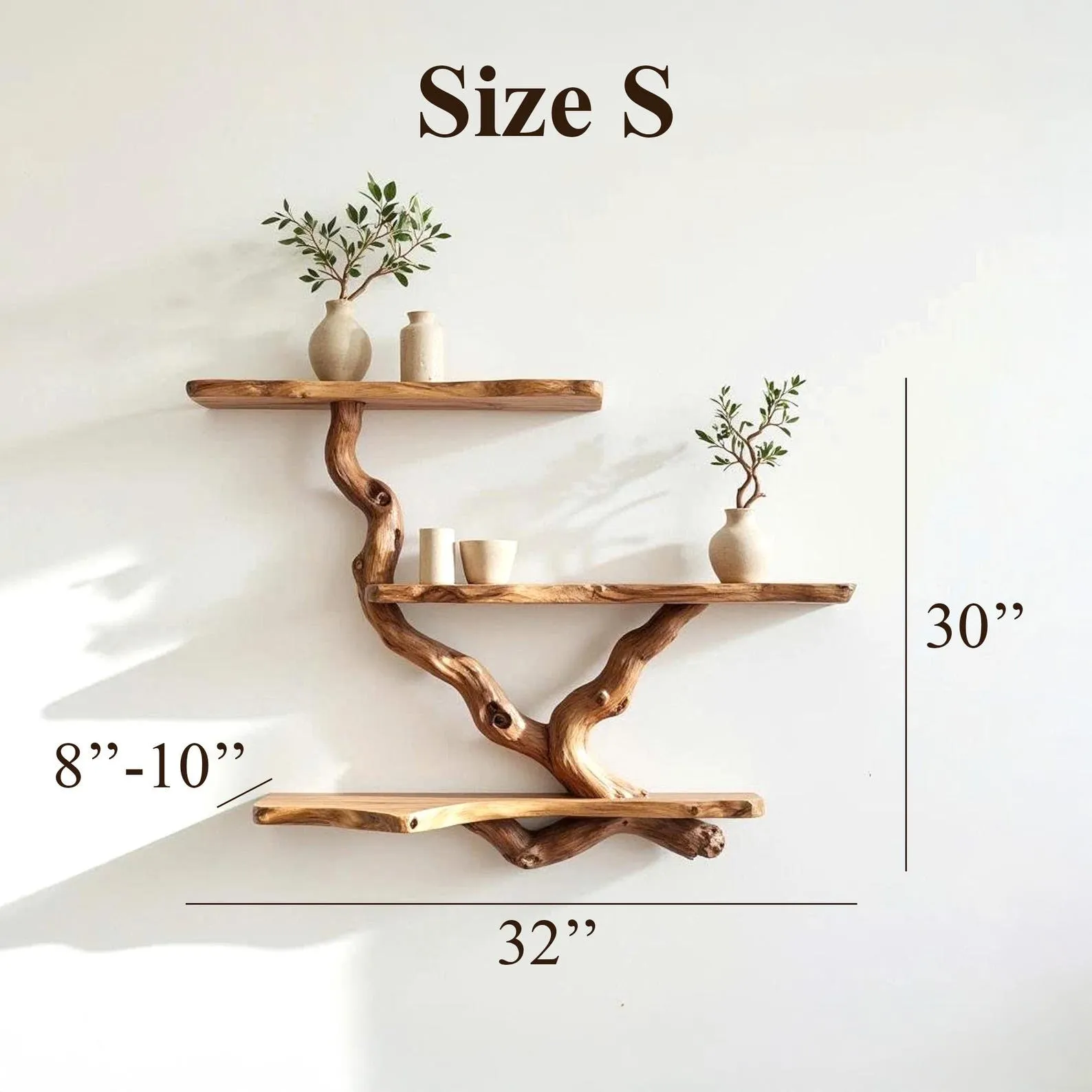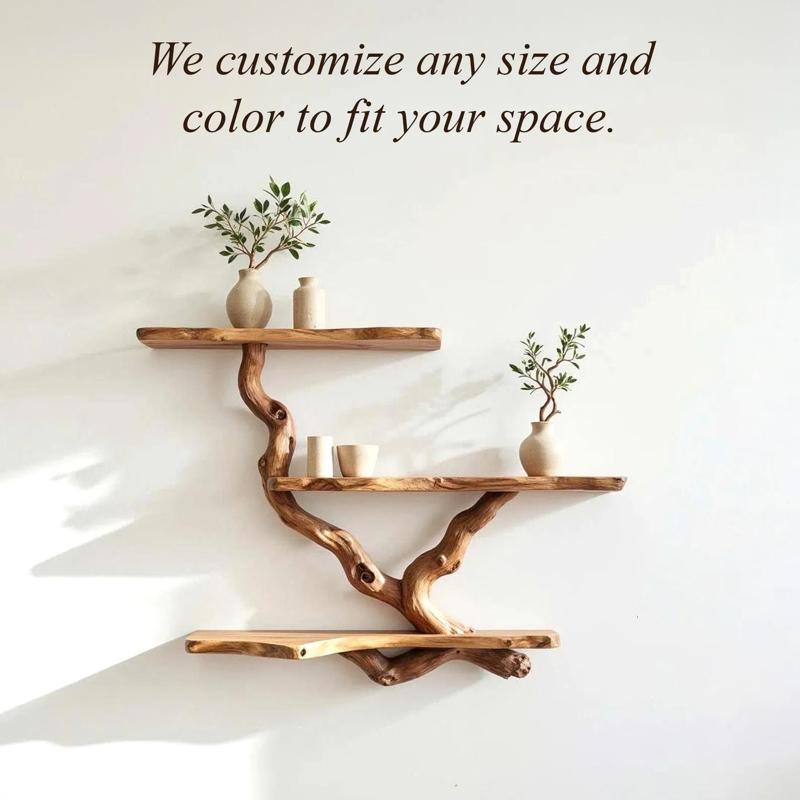 Each tree branch shelf for wall art is made to order, so every piece has its own unique wood patterns. Please check your messages regularly, as we will show you photos at each stage of production to keep you updated and on track. We provide photo updates throughout the process, from shaping the raw wood to finishing and shipping.