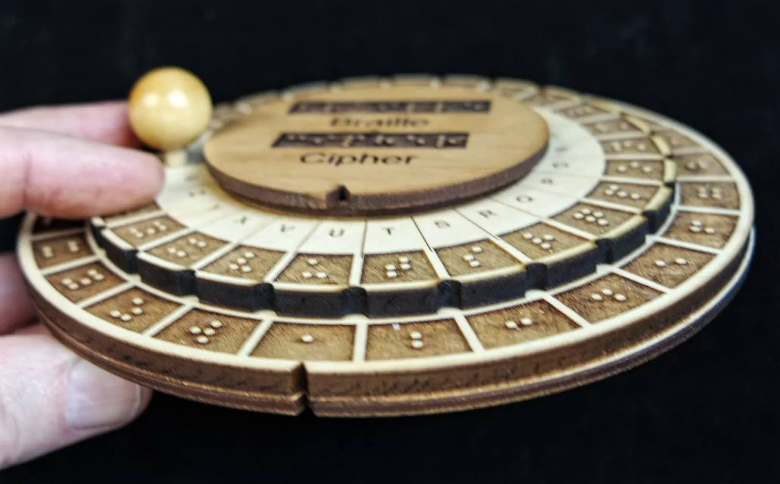 Developed with the aid of both encryption expert Mic Healey and supported blind users, this cipher is a fully functional cipher capable of securely encoding any message. It uses raised Braille dots for the letters. The characters are precisely raised by laser etching away the surrounding wood. The inner wheel has the alphabet clockwise. The outer wheel has the alphabet counterclockwise. As is consistent with the original Braille alphabet, the letter ?W? is at the end, following Z. This was because Braille was originally a French invention and ?W? was little used in that language at the time Braille was created. The ?W? was added later and placed at the end.A detailed introduction to Braille and instructions on how to use the cipher to encode and decode messages are included. It was written by Mr. Healey. Additionally we recommend that you view the video below for a brief tutorial. At this time the instructions are only available in English text (not braille).Operation of the disk and encoding technique is essentially the same as classic wheel ciphers like The Alberti Cipher or the Confederate Army Cipher.The disks may also be useful as a teaching aide in learning Braille.The cipher measures 6.25? in diameter. It is made in Hudson, Florida, copyright 2016 Creative Crafthouse.We recommend you view this video which has more details and a brief tutorial on how to use the device.:https://youtu.be/rX3ItfnbbBQ