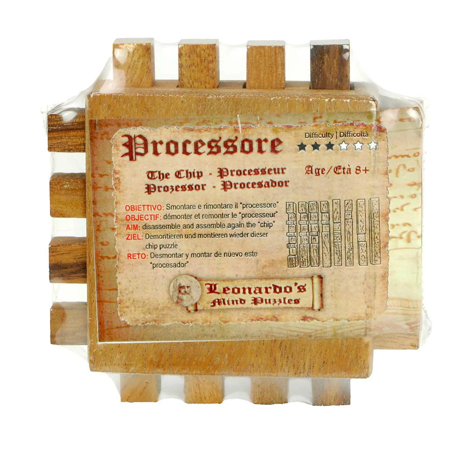 CHALLENGE: Disassemble and assemble again this chip puzzle made of 9 (8 sticks + base) different pieces.Curious brain teaser in wood in the shape of a PC processor.Once disassembled, the difficulty consists in reassembling it.Difficulty: 3/6 HARD. Average solution time: 20 min. – 1 weekDimensions: 9,5 x 9,5 x 2,5 cm / 3.8 x 3.8 x 1 inches.Teak/Samena wood.Handmade in Thailand.PACKED IN SHRINKWRAP WITH COLORED LEONARDO DA VINCI LABEL