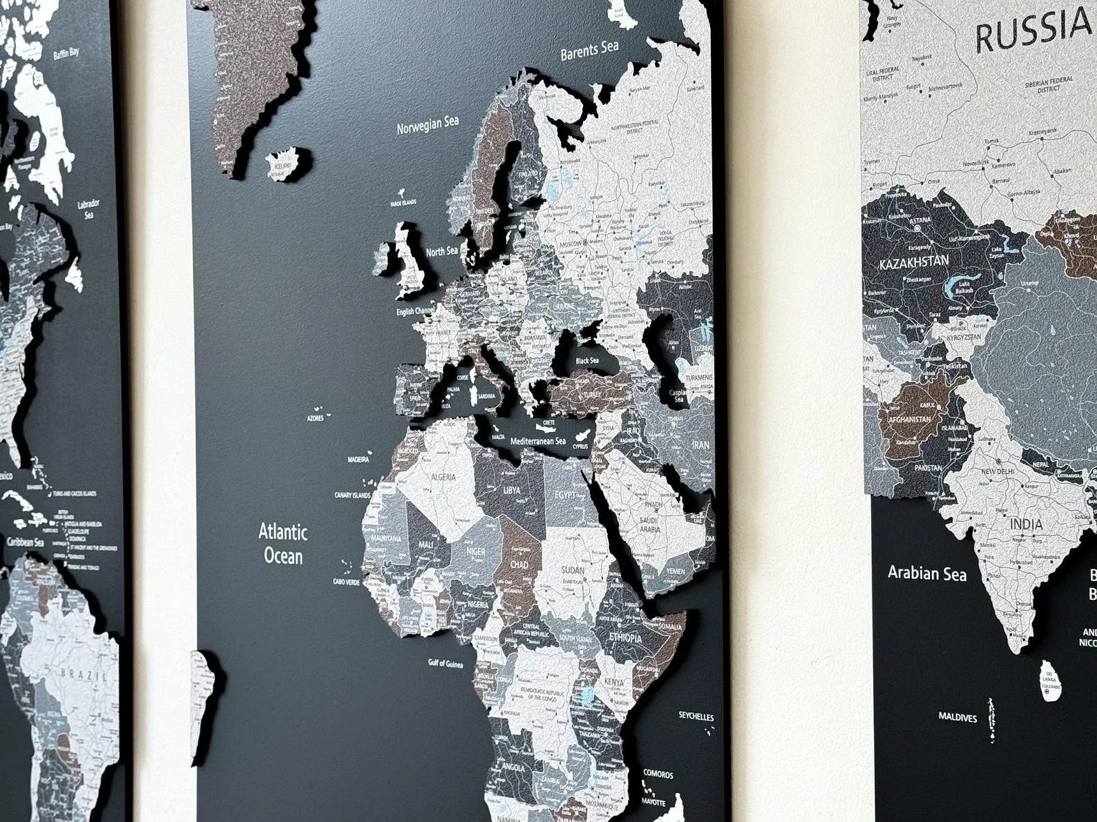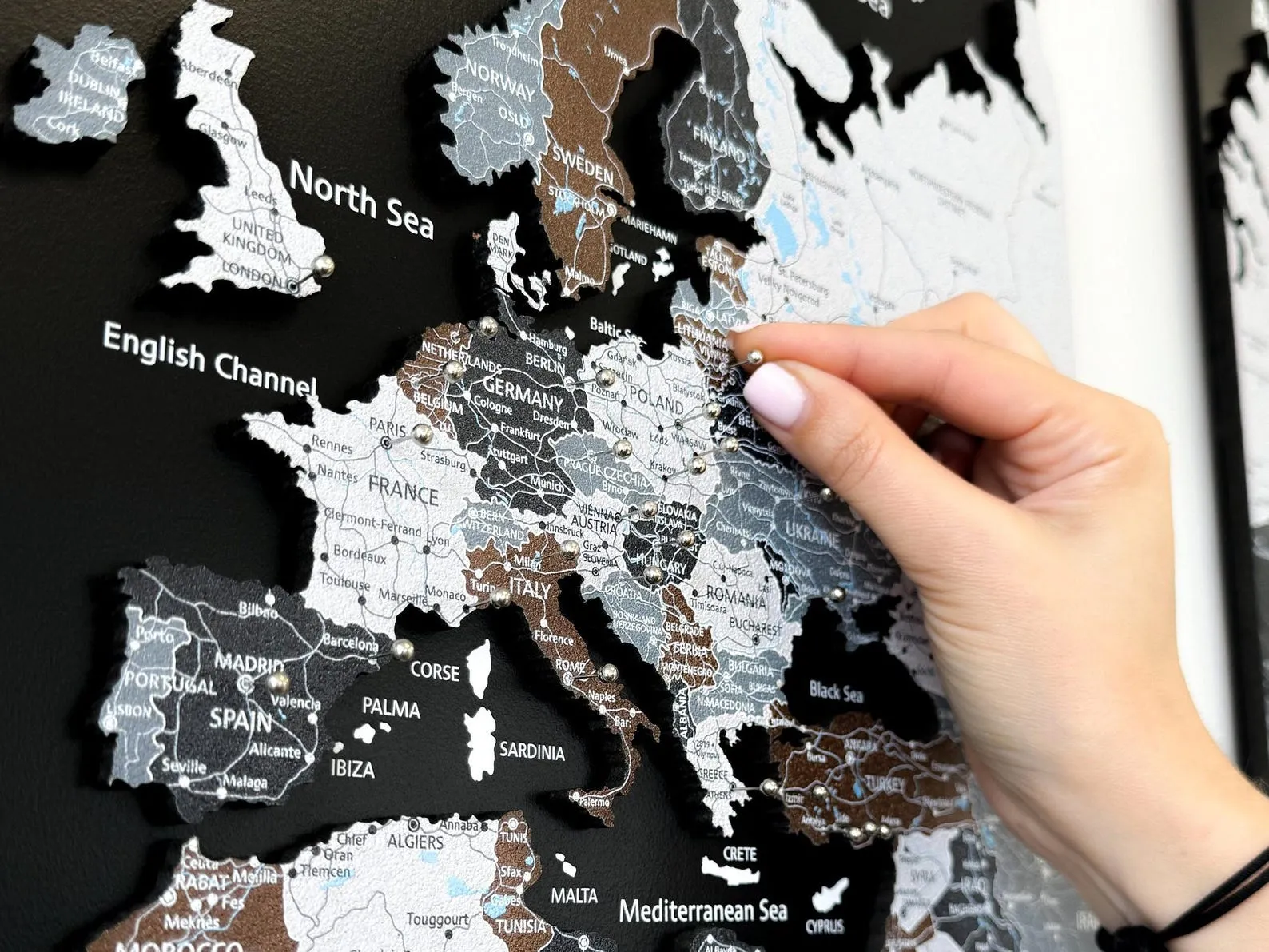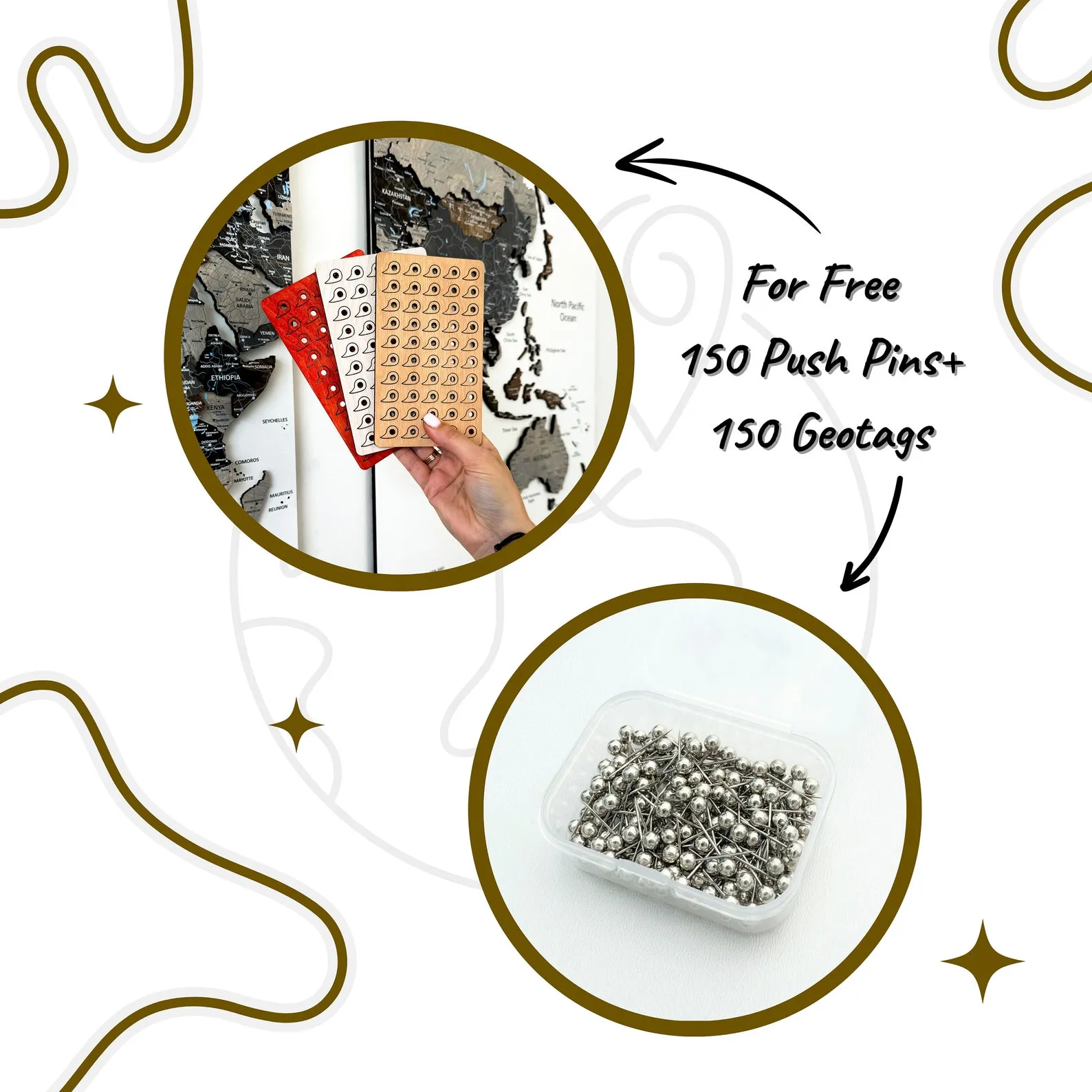 Our cork world map is meticulously crafted with high-quality print on wooden panels, featuring vivid blue rivers and lakes, and an intricate network of roads. The cork material allows you to insert pins into marked cities, making it perfect for creating a personalized map of your travels. Complete with 150 free geotags and pins, this piece is more than just a map?it?s a fun and engaging way to track your adventures.