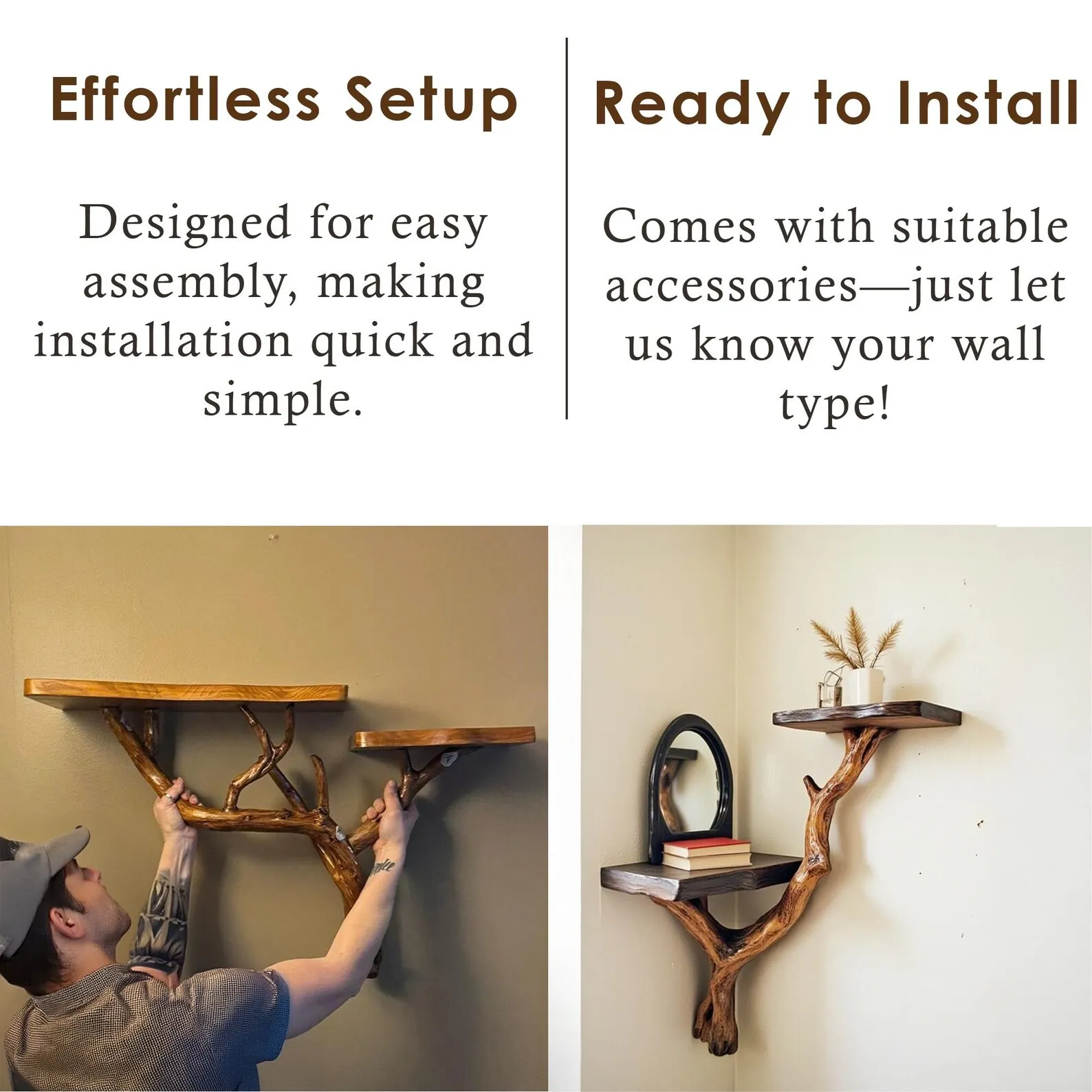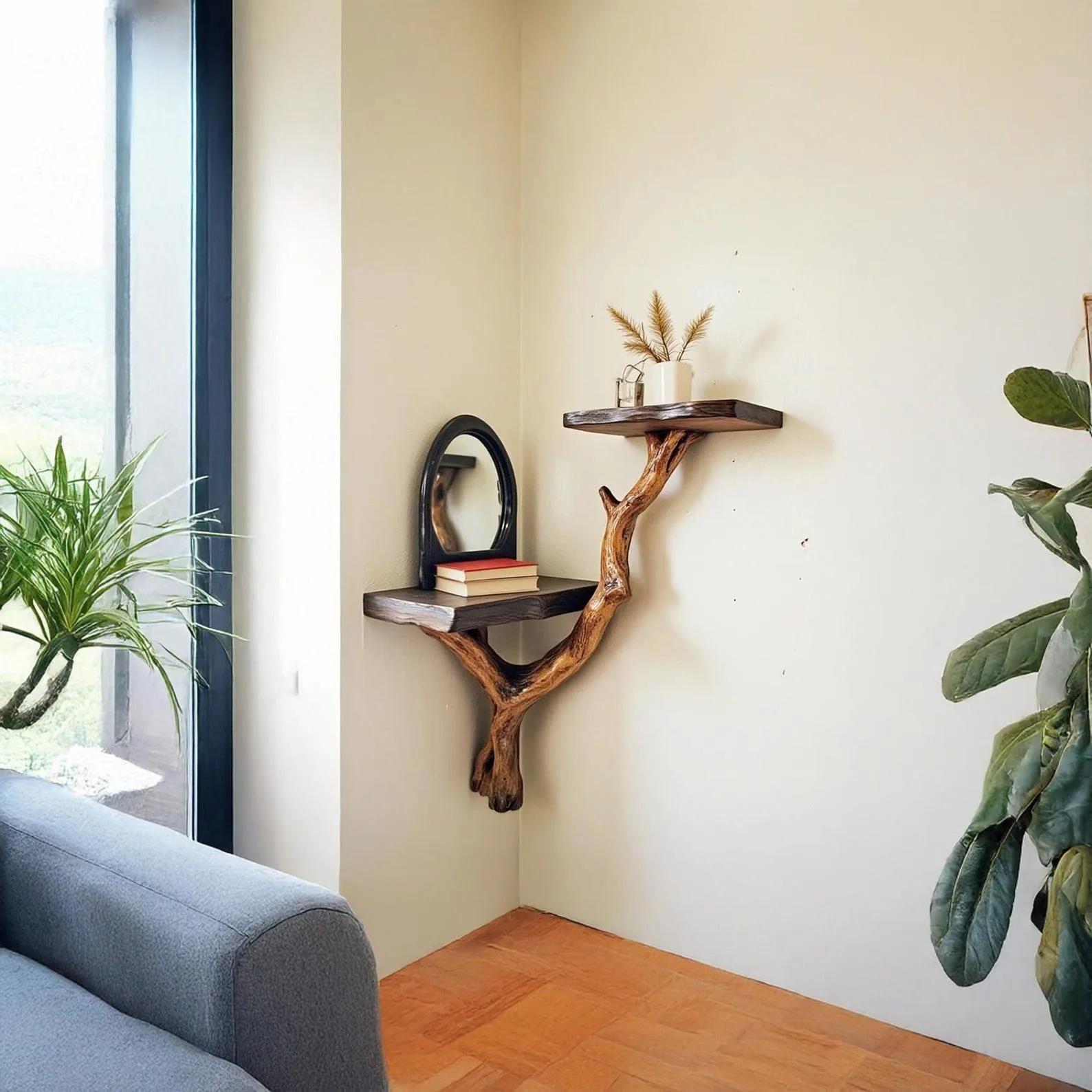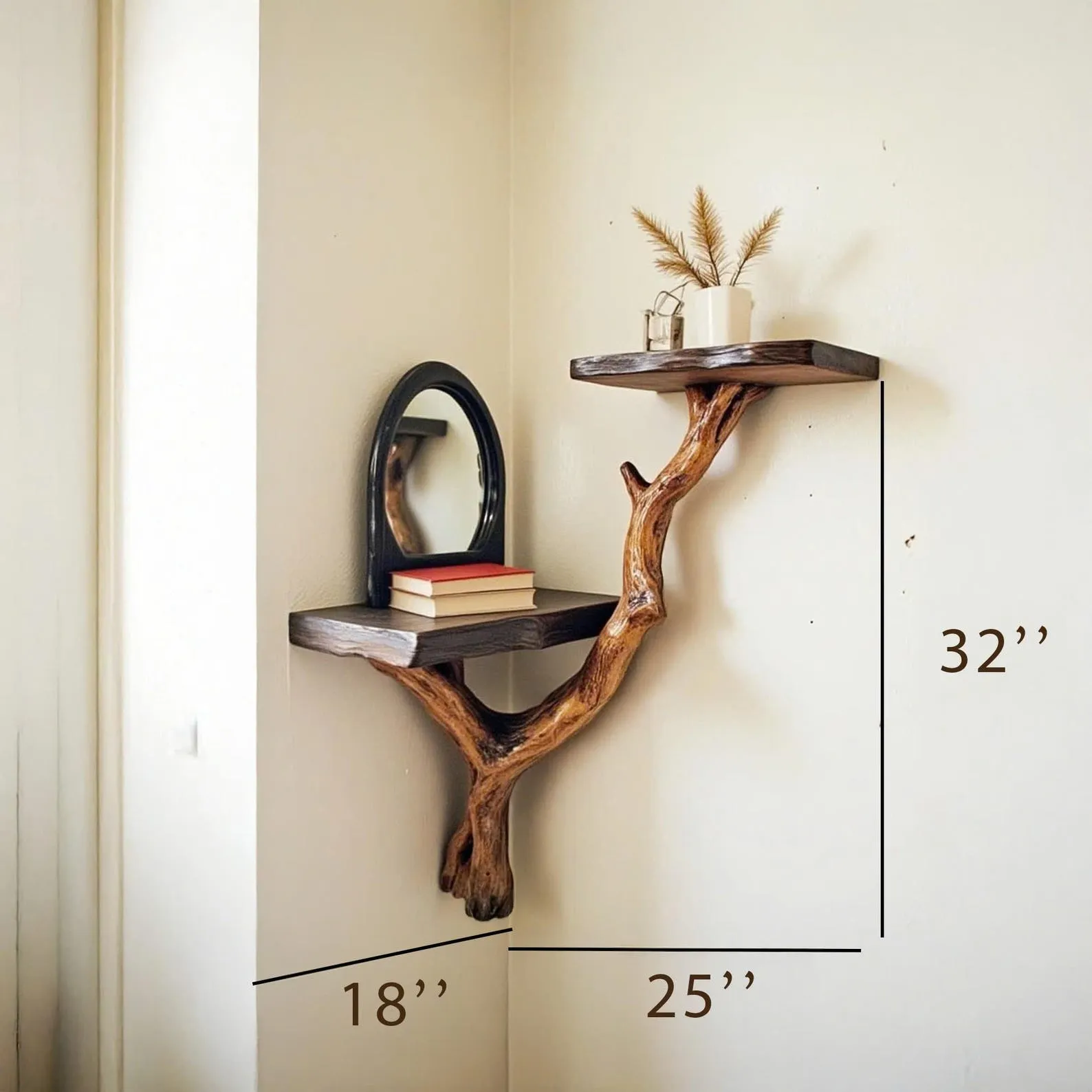Corner floating shelf natural solid wood bookshelf art tree driftwood branch bookshelves unique wall mount handmade furniture home decor