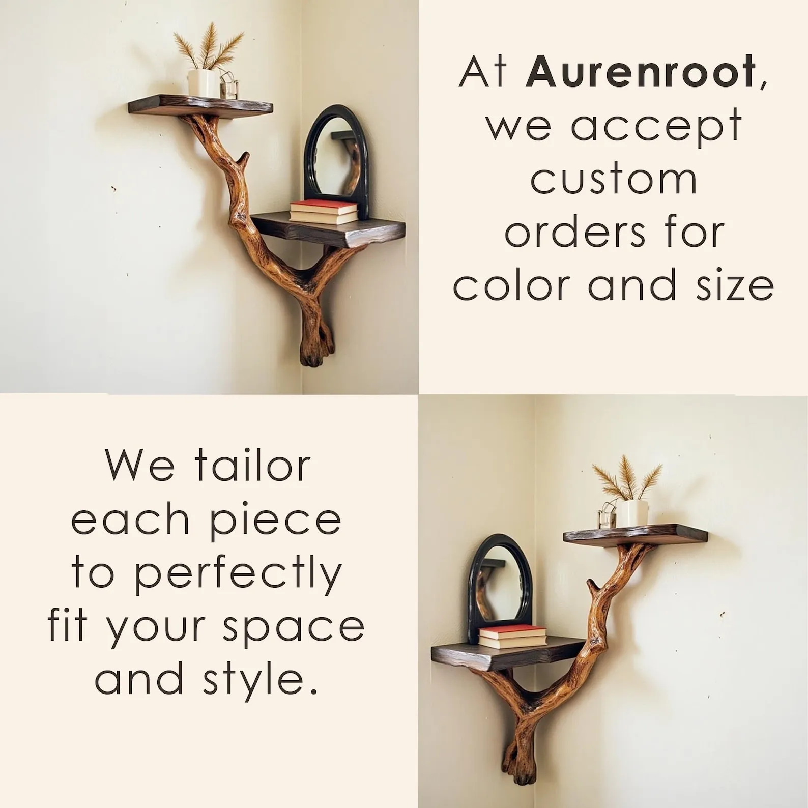 Aurenroot made this Coner Tree Floating Book Shelf from handcarved solid wood, with the branch crafted from natural driftwood branch and the shelves are made from natural solid wood. This natural wood bookshelf is a stunning example of handmade furniture, designed to bring the beauty of nature into your home. Each piece is meticulously handmade, ensuring no two bookshelves are exactly the same every tree branch shelving unit features its own unique natural characteristics.We offer customizable sizes and colors, so just share your idea with us, and we’ll bring it to life. Need help selecting the right accessories for your wall type? Message us, and we’ll guide you through the options.After your purchase, please check your email and messages, as we may send a photo of your custom piece before shipping to ensure it meets your expectations.Looking forward to serving you, we cherish the opportunity to create something as unique and special as your home.