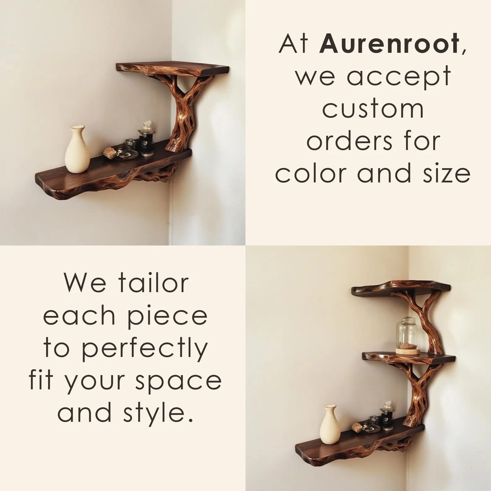 Aurenroot made this Corner Floating Bookshelf from handcarved solid wood, with the branch crafted from natural driftwood branch and the shelves are made from natural solid wood. This natural wood bookshelf is a stunning example of handmade furniture, designed to bring the beauty of nature into your home. Each piece is meticulously handmade, ensuring no two Wall Mount Bookcase are exactly the same every tree branch shelving unit features its own unique natural characteristics.We offer customizable sizes and colors, so just share your idea with us, and we’ll bring it to life. Need help selecting the right accessories for your wall type? Message us, and we’ll guide you through the options.After your purchase, please check your email and messages, as we may send a photo of your custom piece before shipping to ensure it meets your expectations.Looking forward to serving you, we cherish the opportunity to create something as unique and special as your home.