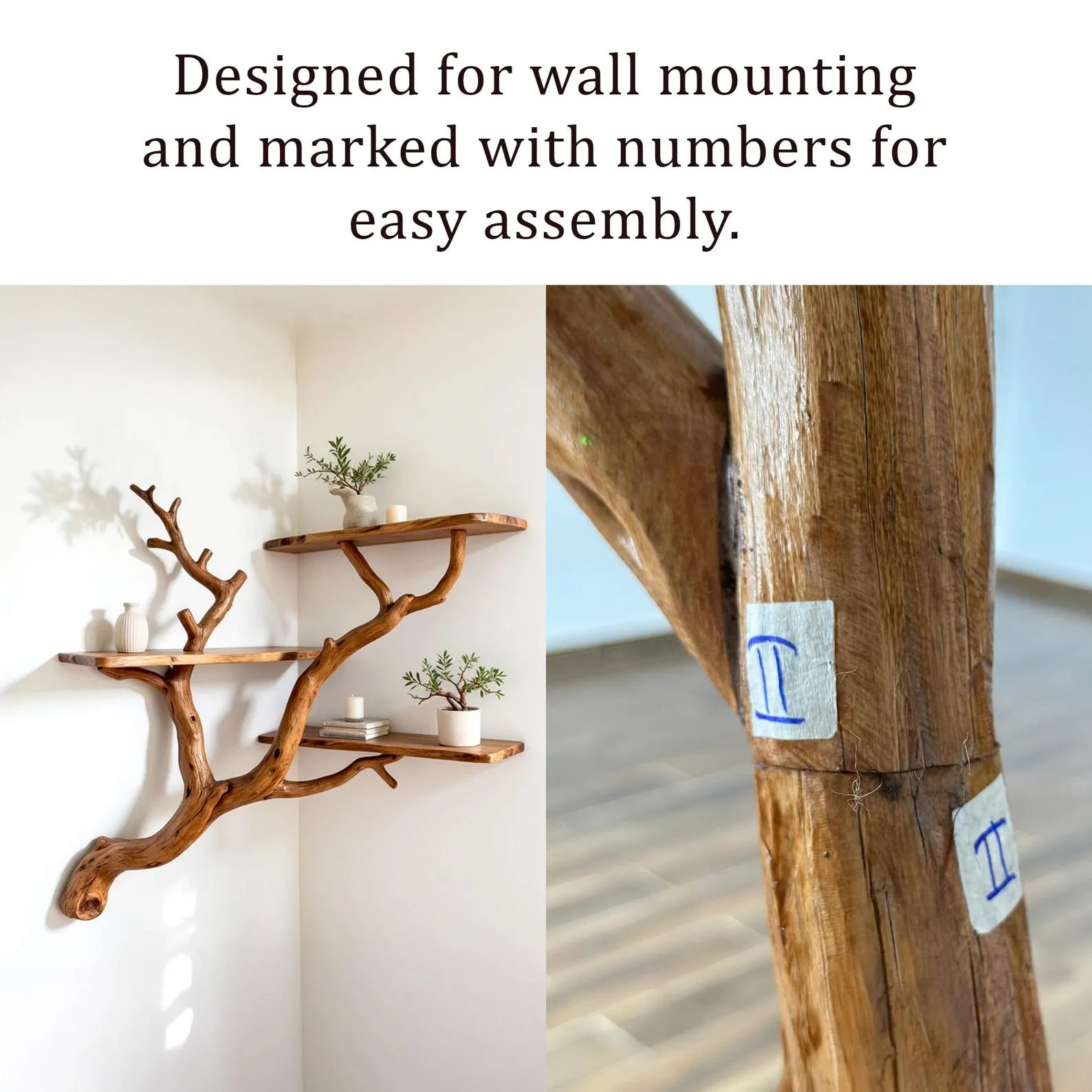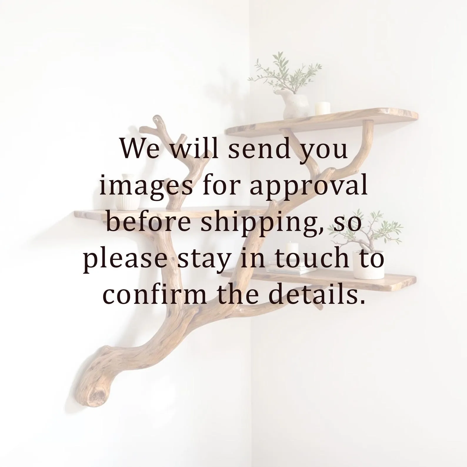 We carefully select driftwood branches from the high mountains of Vietnam to craft unique tree bookshelves like this. Each branch is handcarved by skilled artisans, highlighting the natural wood grain and distinctive organic curves. Because of this meticulous craftsmanship, every shelf is truly one of a kind, bringing a rustic yet elegant accent to your home Decor.Customizable Size & Shape:We understand that every space is different. That’s why we offer customization options for the size and shape of the live edge shelf, ensuring a perfect fit for your room and style preferences.’Easy Wall Mounting & Assembly:Designed for convenient wall mounting, each part of the shelf is marked with numbers to simplify the assembly process. Whether you’re experienced with DIY projects or prefer a straightforward setup, you’ll find installation hassle-free.Natural Variation:As this bookshelf is made from natural driftwood, please allow a size variation of 3 to 5 inches. These variations add to the authentic charm and uniqueness of your piece, making it truly special.Approval Before Shipping:We want you to be completely satisfied with your purchase. Before shipping, we will send you detailed images of your specific bookshelf for your review and confirmation. Please stay in touch so we can make any adjustments needed and ensure the final product meets your expectations.This driftwood bookshelf is more than just functional storage ‘ it’s a natural work of art that enhances any corner or wall. Perfect for displaying books, plants, or decorative accents, it brings warmth, character, and the beauty of nature into your living space.