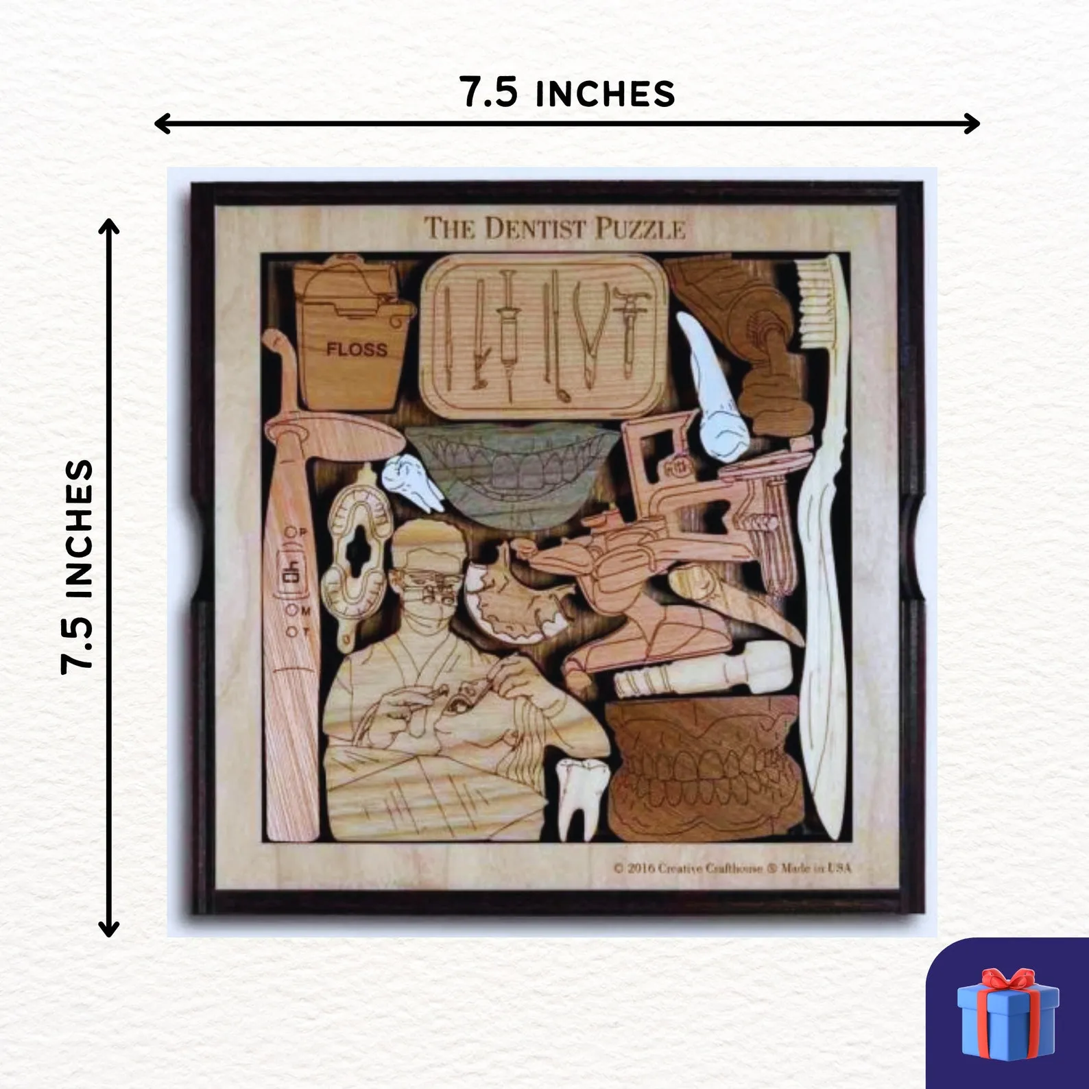 Can you fit all the dental related items back into the frame?Very challenging! The 16 pieces are precision laser engraved and cut. They include some teeth, smiles, dental tools, toothpaste, tooth brush, floss, dental chair, and more. You can have your choice also of either a male or a female dentist. Let me know your choice. If you don?t specify we will use the male figure.At least 4 different woods are used in the puzzle, and may include Cherry, Mahogany, Alder, Maple, Oak, Hickory, Walnut & others. Comes with base and cover. Measures about 7.5 inches across in the cover.We can personalize this for you (choose the engraving option) with a name in the lower left corner of the frame or a longer message on the cover.Original artwork by our own Alexandra Plummer? 2016 Creative Crafthouse ? Made in Hudson, FLTo view a video of this puzzle, please cut and paste this link:https://youtu.be/XLomsFfE62Q