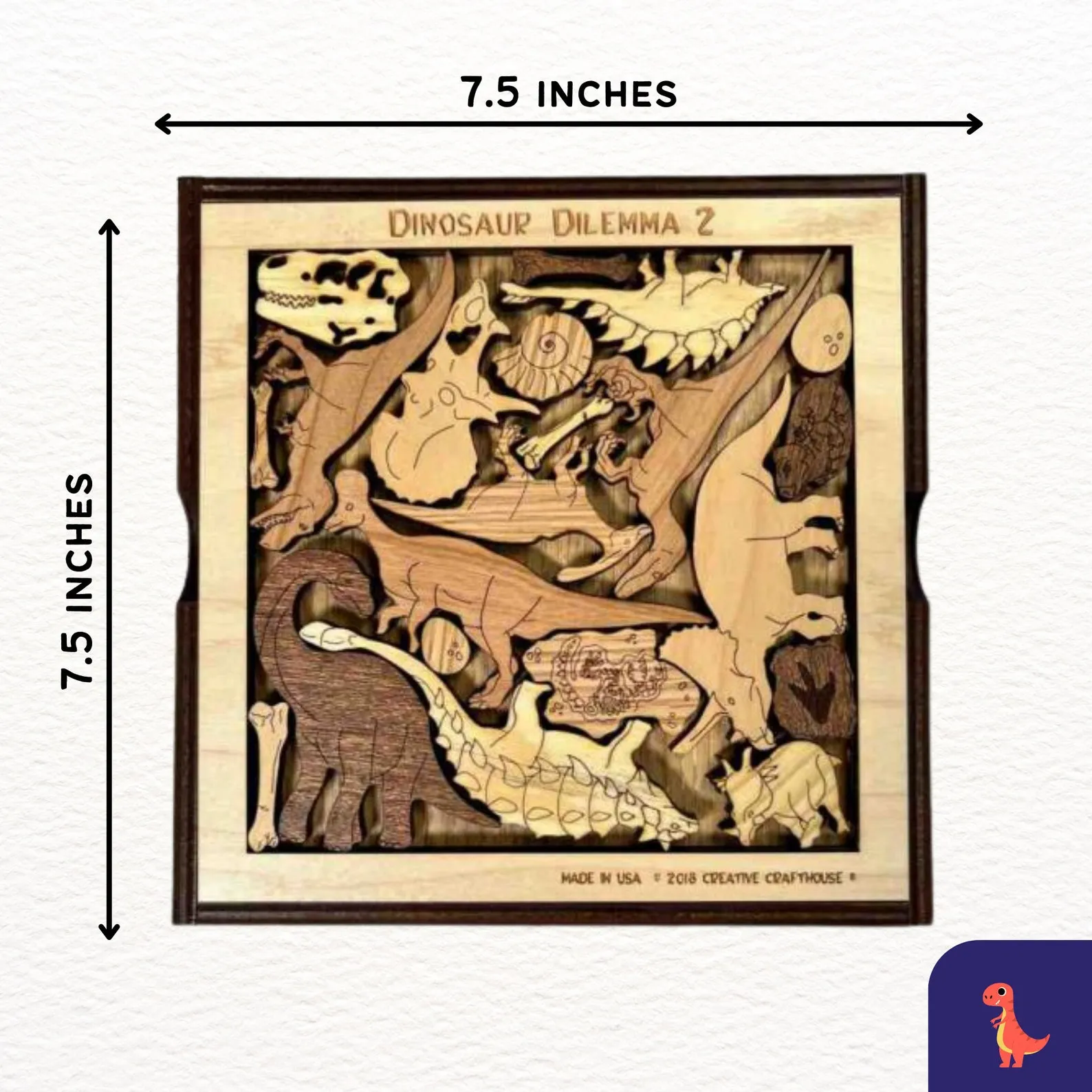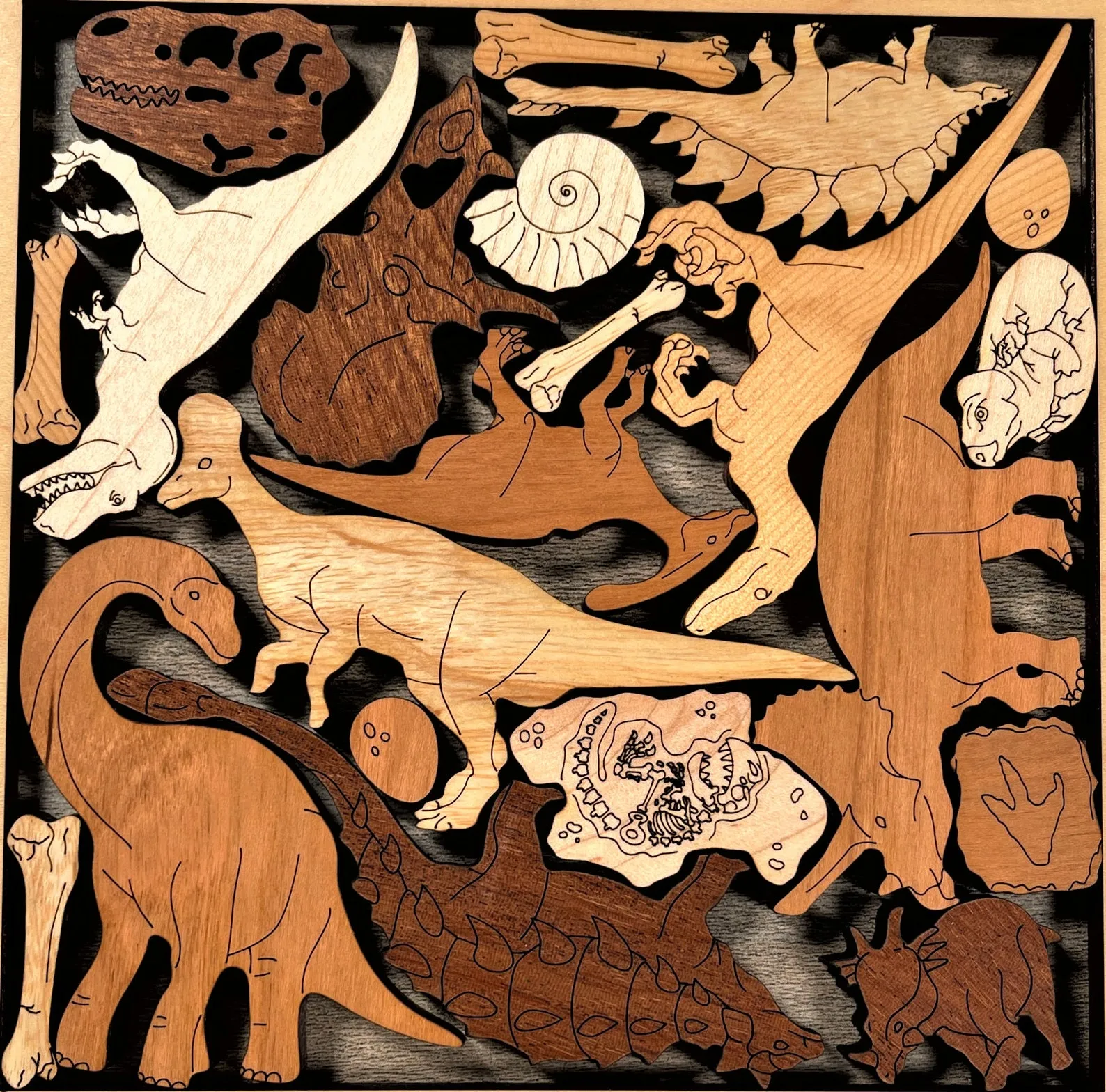 Can you fit all the dinosaurs and fossils into the frame? Very challenging! 19 pieces are precision laser engraved and cut. They include; Ankylosaurus, Velociraptor, Coryhosaurus, Brontosaurus, Triceratops, Paraaurlophus, bones, skulls, ammonite, and more.At least 4 different woods are used in the puzzle, and may include Cherry, Mahogany, Alder, Maple, Oak, Hickory, Walnut & others.Original artwork by our own Alexandra Plummer?2016 Creative Crafthouse ? Made in Hudson, FLLevel of Difficulty: Level 4