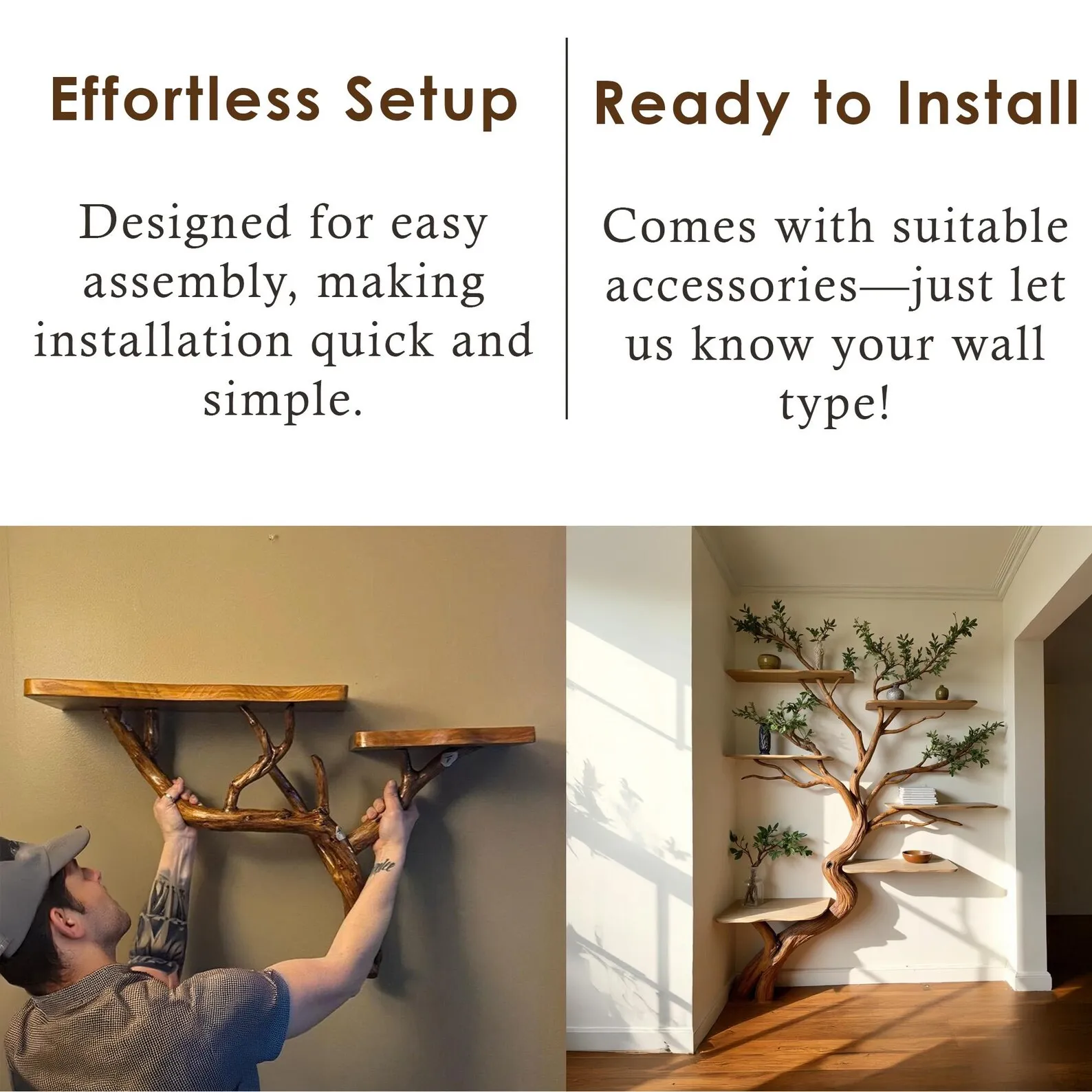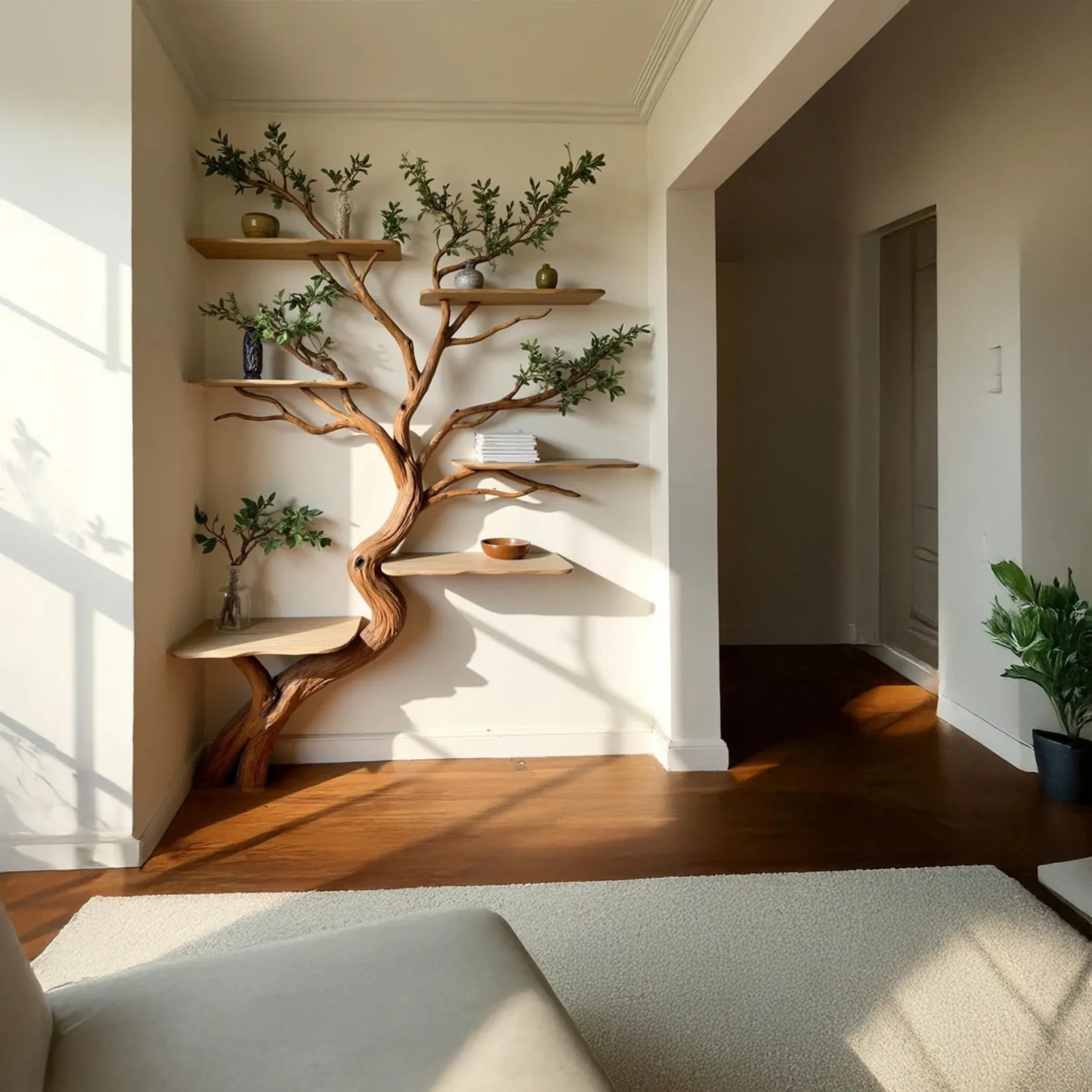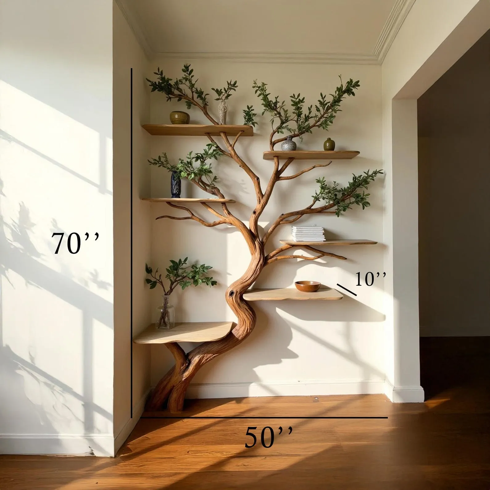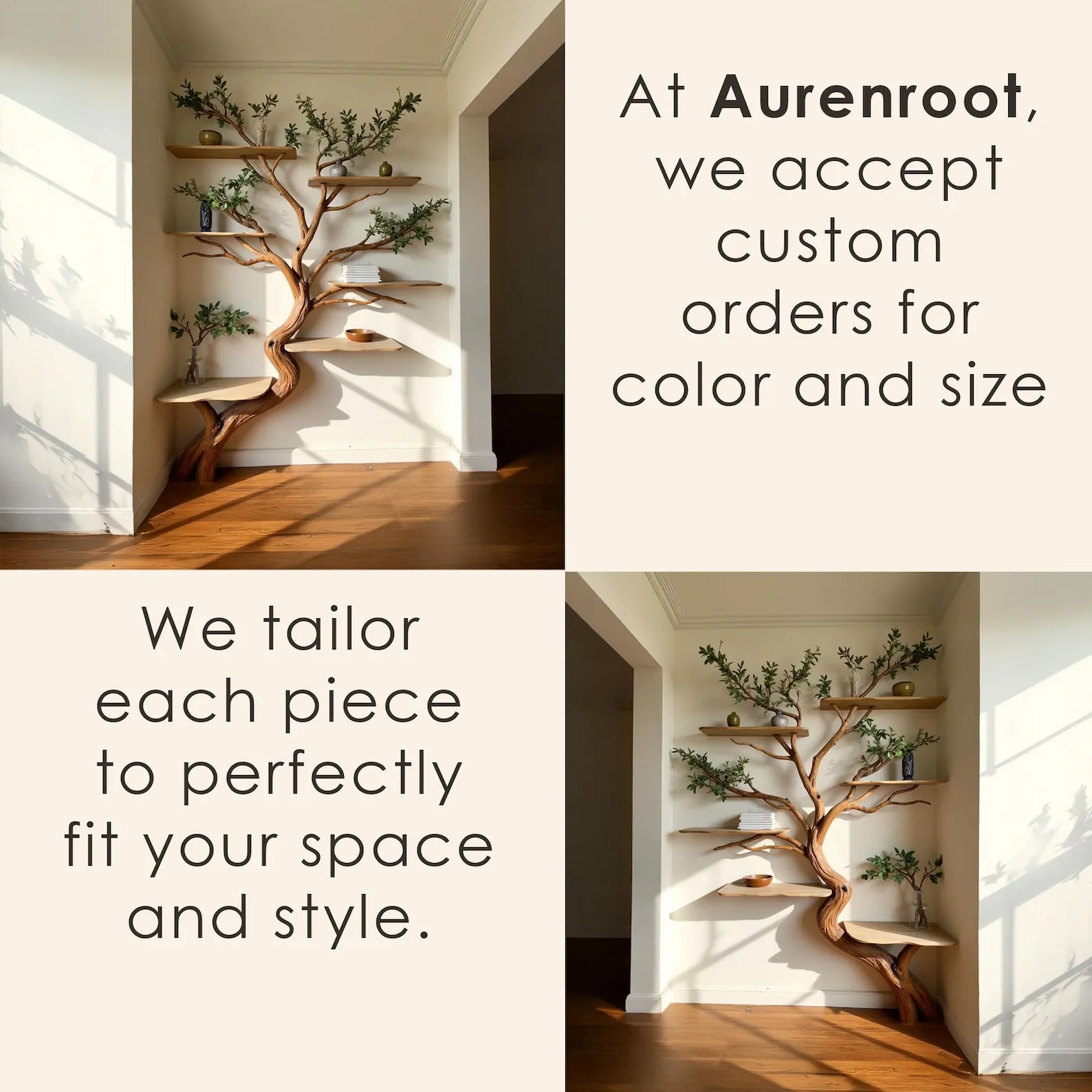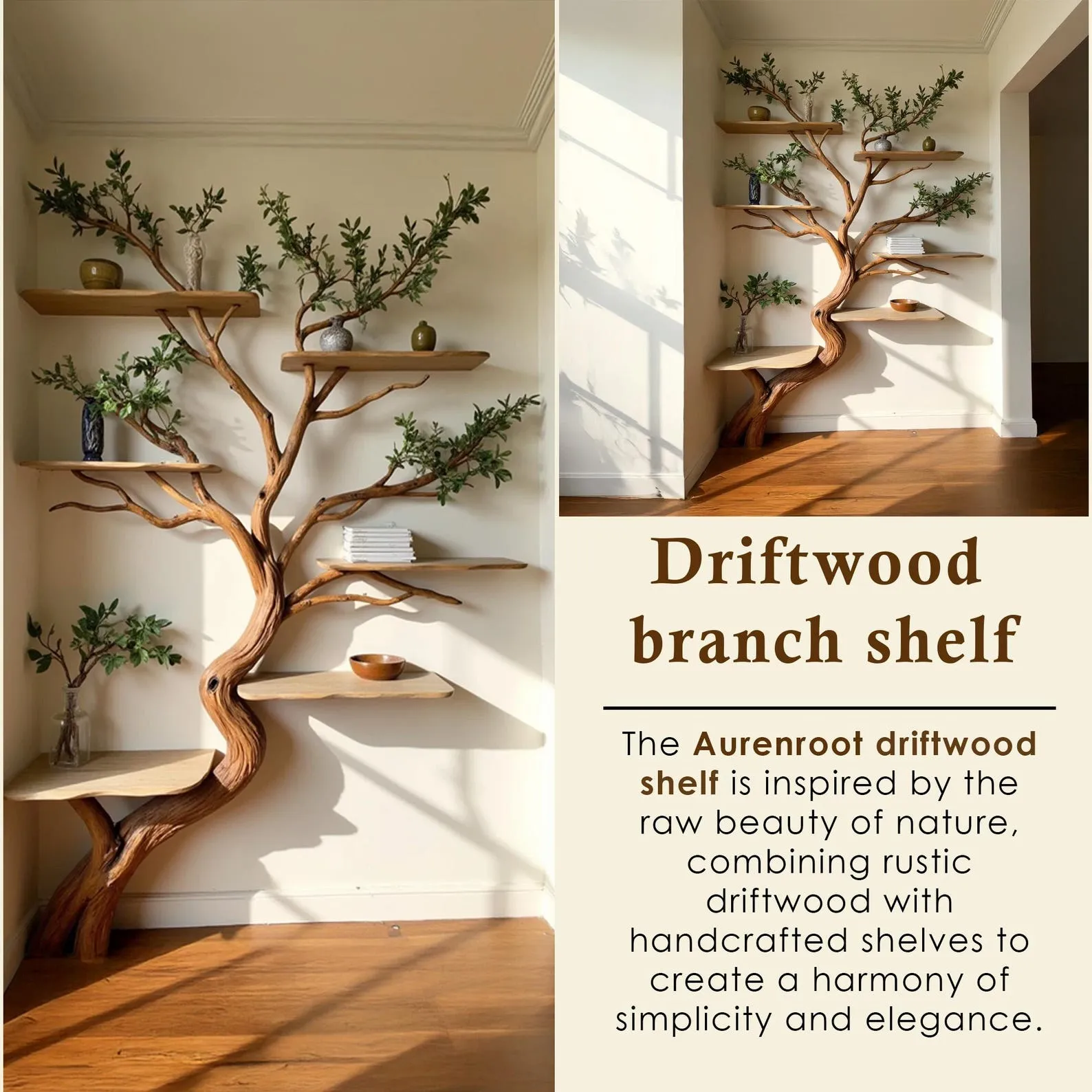 Aurenroot made this Corner Tree Branch Bookshelf from handcarved solid wood, with the branch crafted from natural driftwood branch and the shelves are made from natural solid wood. This natural wood bookshelf is a stunning example of handmade furniture, designed to bring the beauty of nature into your home.Each piece is meticulously handmade, ensuring no two bookshelves are exactly the same every tree branch shelving unit features its own unique natural characteristics.We offer customizable sizes and colors, so just share your idea with us, and we’ll bring it to life. Need help selecting the right accessories for your wall type? Message us, and we’ll guide you through the options.After your purchase, please check your email and messages, as we may send a photo of your custom piece before shipping to ensure it meets your expectations.Looking forward to serving you, we cherish the opportunity to create something as unique and special as your home.
