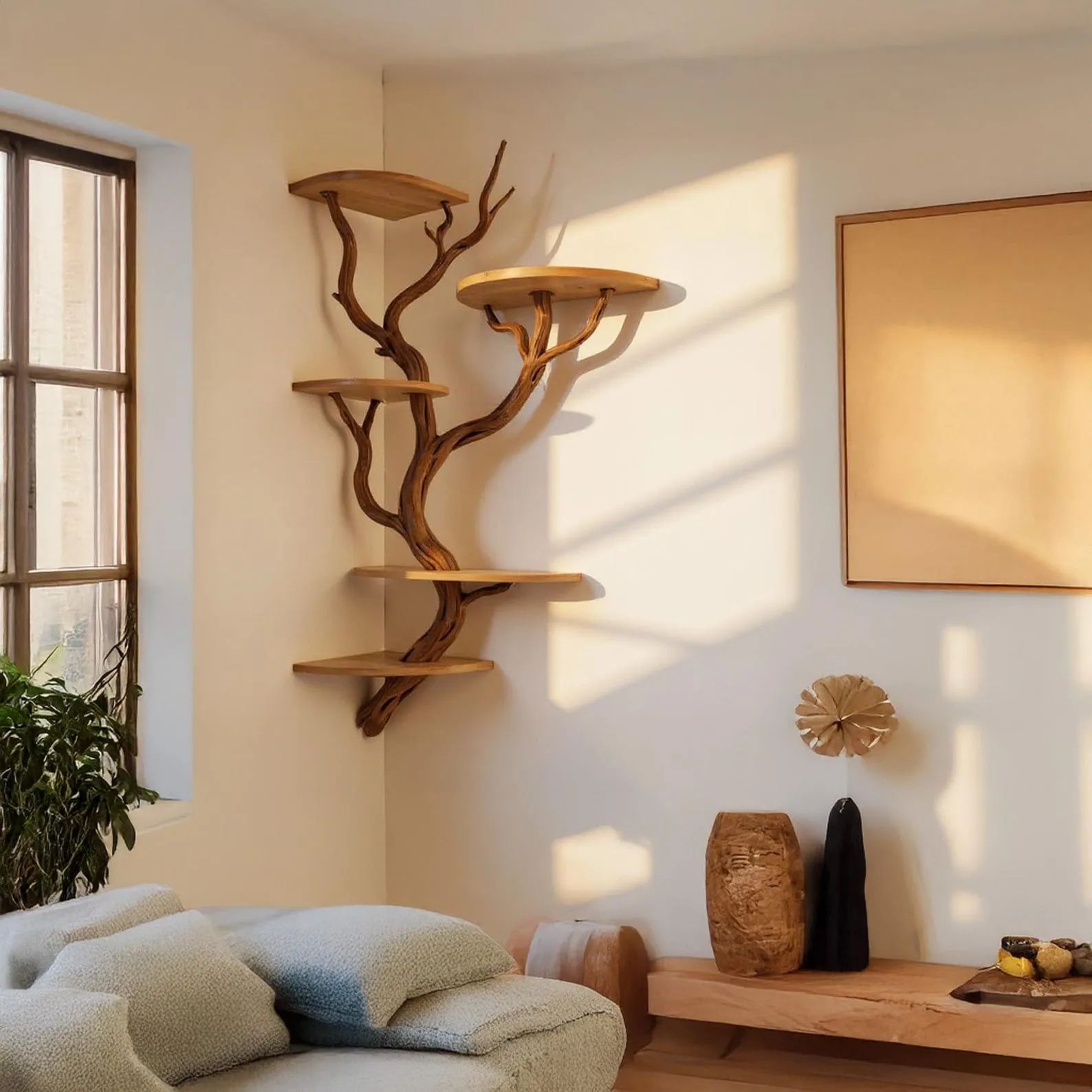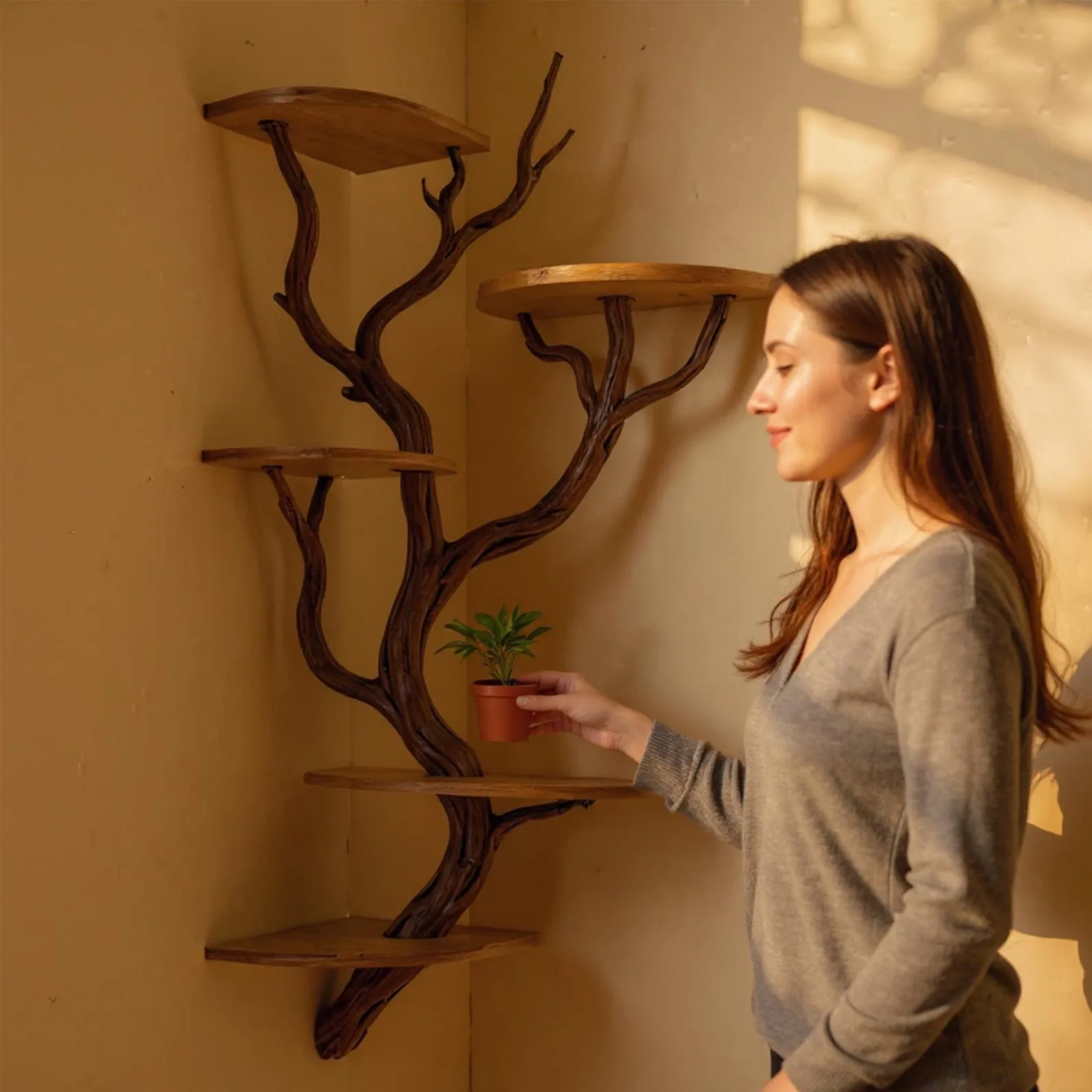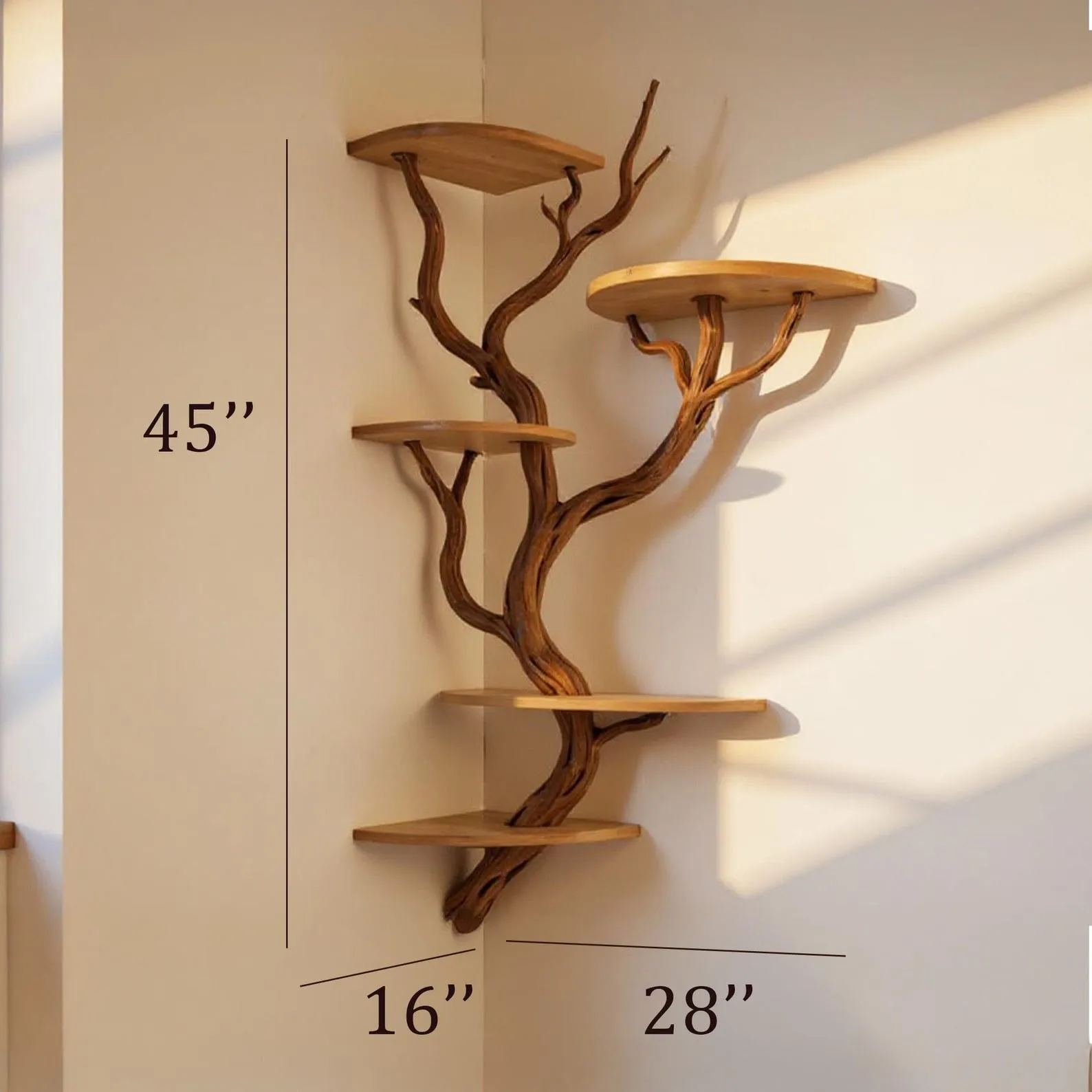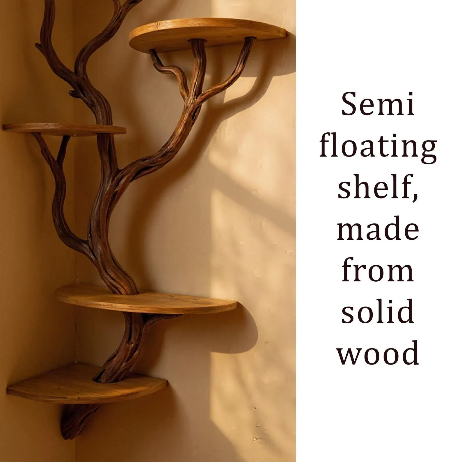 Driftwood corner tree branch bookshelf semi floating corner shelf solid wood bookcase wall mount plant shelf display shelving decoration