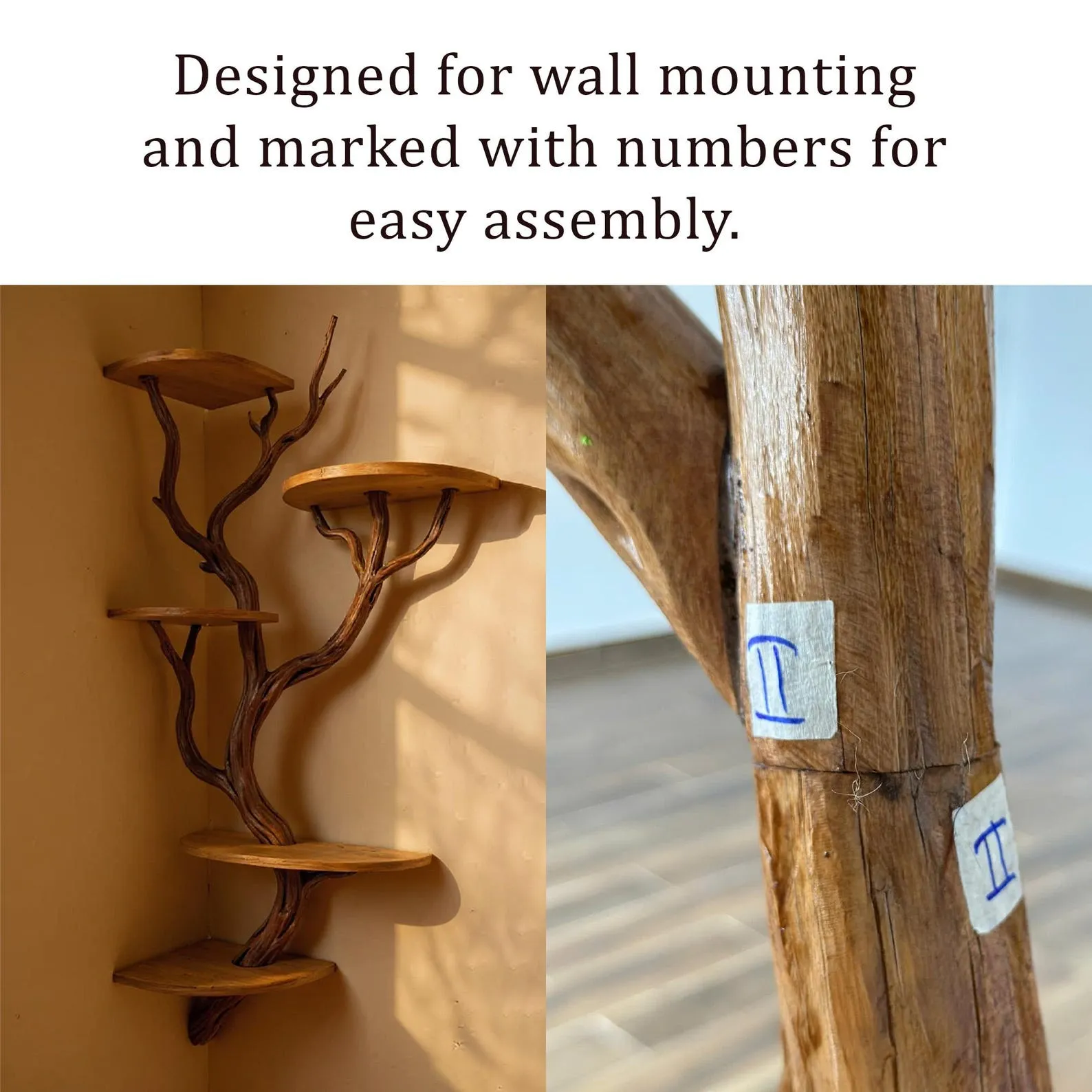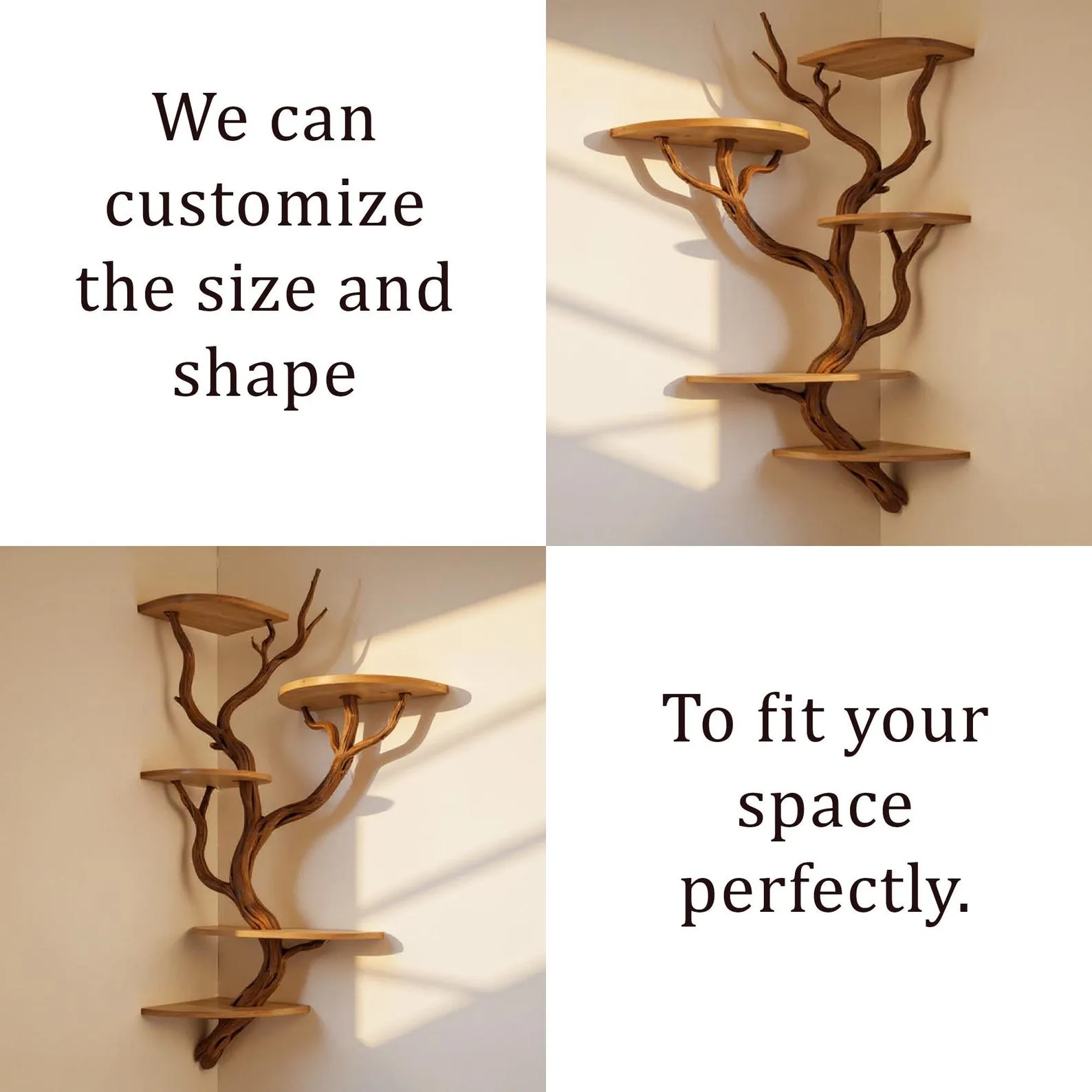 We carefully select driftwood branches from the high mountains of Vietnam to craft this semi corner tree shelf wall mount like this. Each branch is handcarved by skilled artisans, highlighting the natural wood grain and distinctive organic curves. Because of this meticulous craftsmanship, every shelf is truly one of a kind, bringing a rustic yet elegant accent to your home Decor.Customizable Size & Shape:We understand that every space is different. That’s why we offer customization options for the size and shape of the tree bookshelf, ensuring a perfect fit for your room and style preferences.’Easy Wall Mounting & Assembly:Designed for convenient wall mounting, each part of the shelf is marked with numbers to simplify the assembly process. Whether you’re experienced with DIY projects or prefer a straightforward setup, you’ll find installation hassle-free.Natural Variation:As this bookshelf is made from natural driftwood, please allow a size variation of 3 to 5 inches. These variations add to the authentic charm and uniqueness of your piece, making it truly special.Approval Before Shipping:We want you to be completely satisfied with your purchase. Before shipping, we will send you detailed images of your specific bookshelf for your review and confirmation. Please stay in touch so we can make any adjustments needed and ensure the final product meets your expectations.This driftwood bookshelf is more than just functional storage ‘ it’s a natural work of art that enhances any corner or wall. Perfect for displaying books, plants, or decorative accents, it brings warmth, character, and the beauty of nature into your living space.