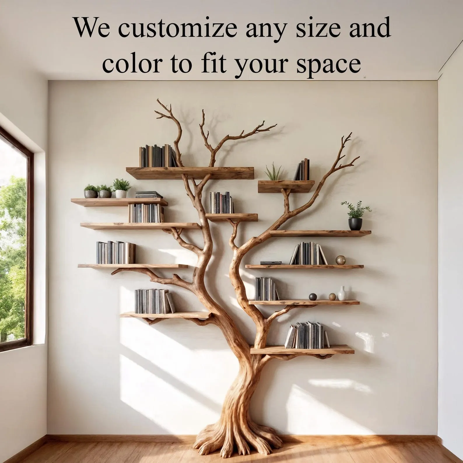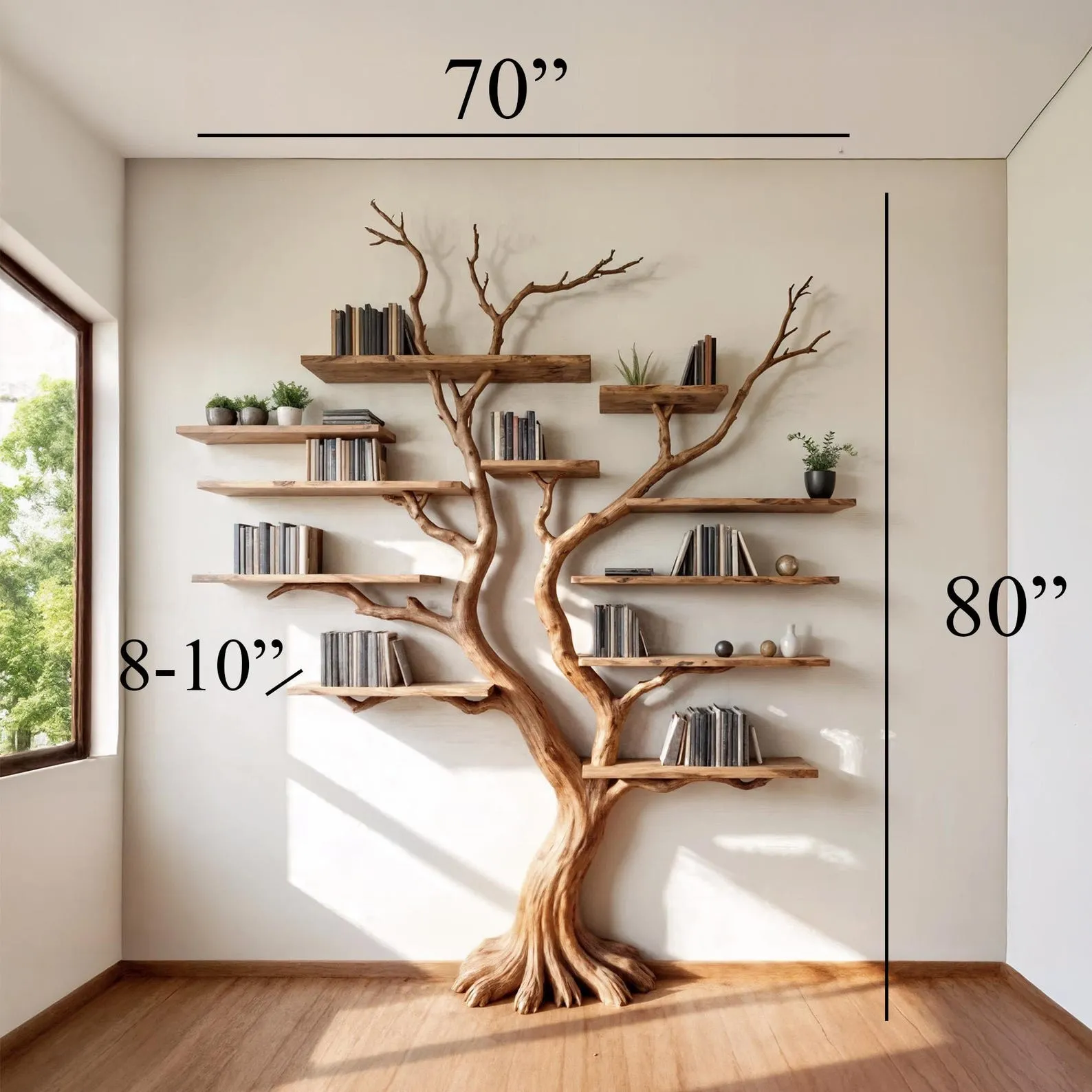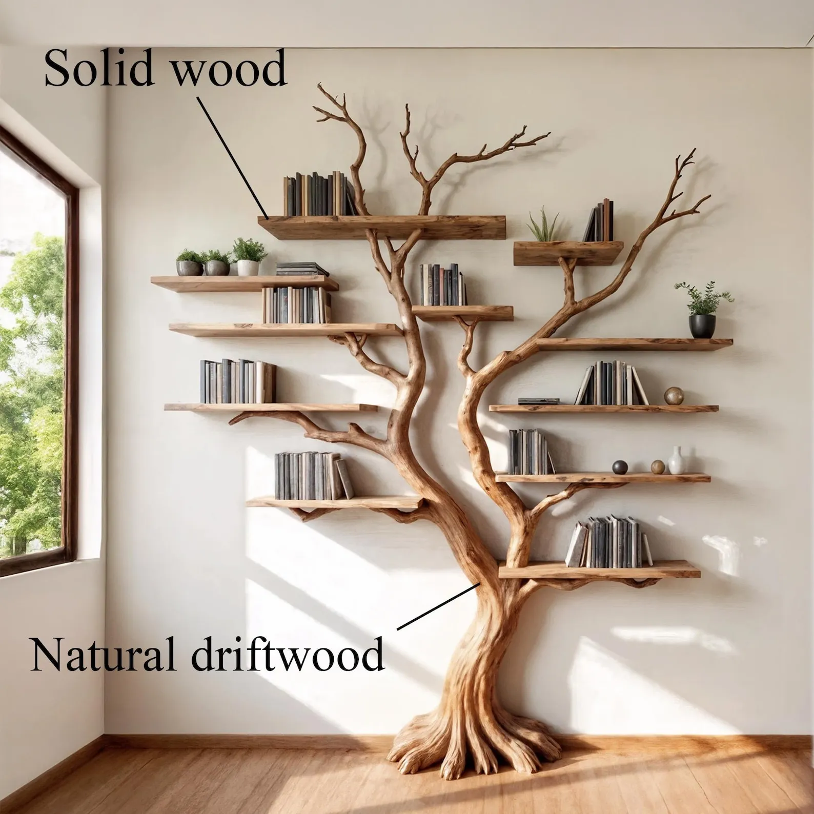 The driftwood branches we use are collected from rocky mountain areas, chosen for their unique shape, grain, and texture. The natural wood is durable, termite-resistant, and truly one of a kindevery shelf is different, just like a real tree.