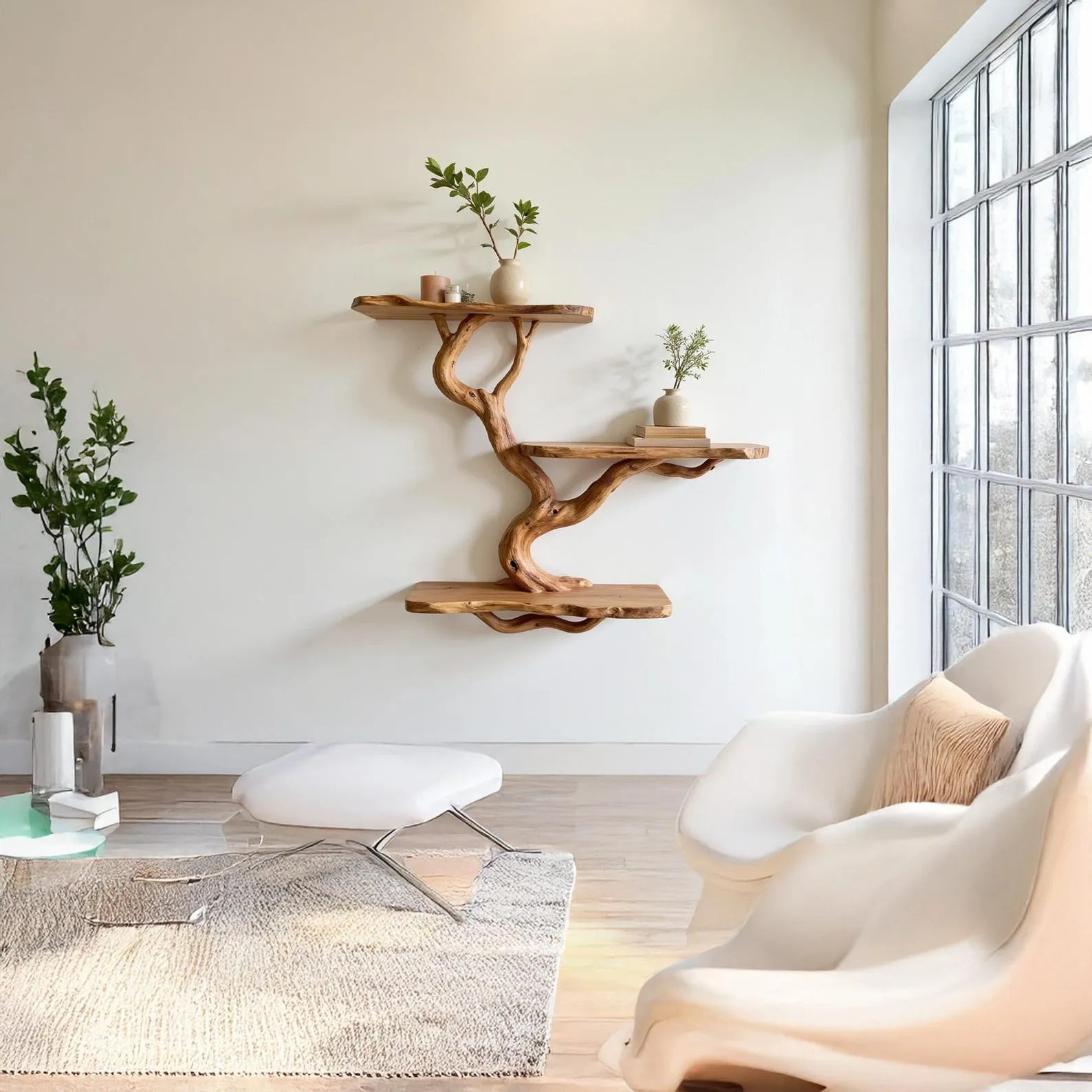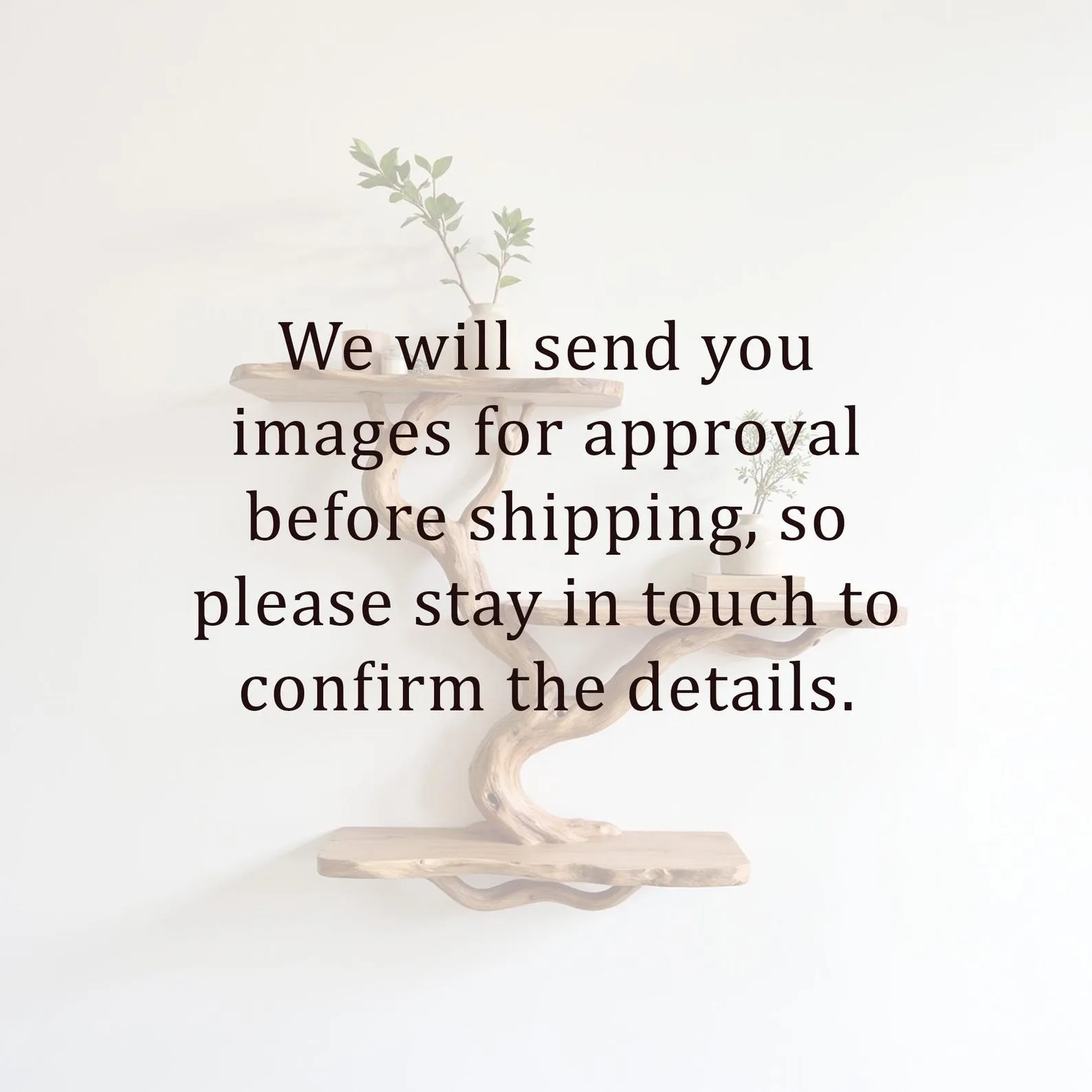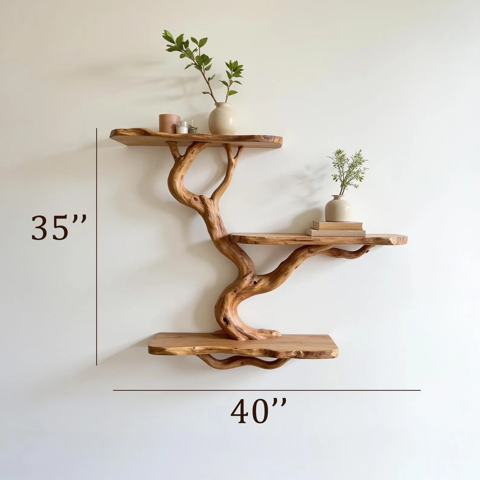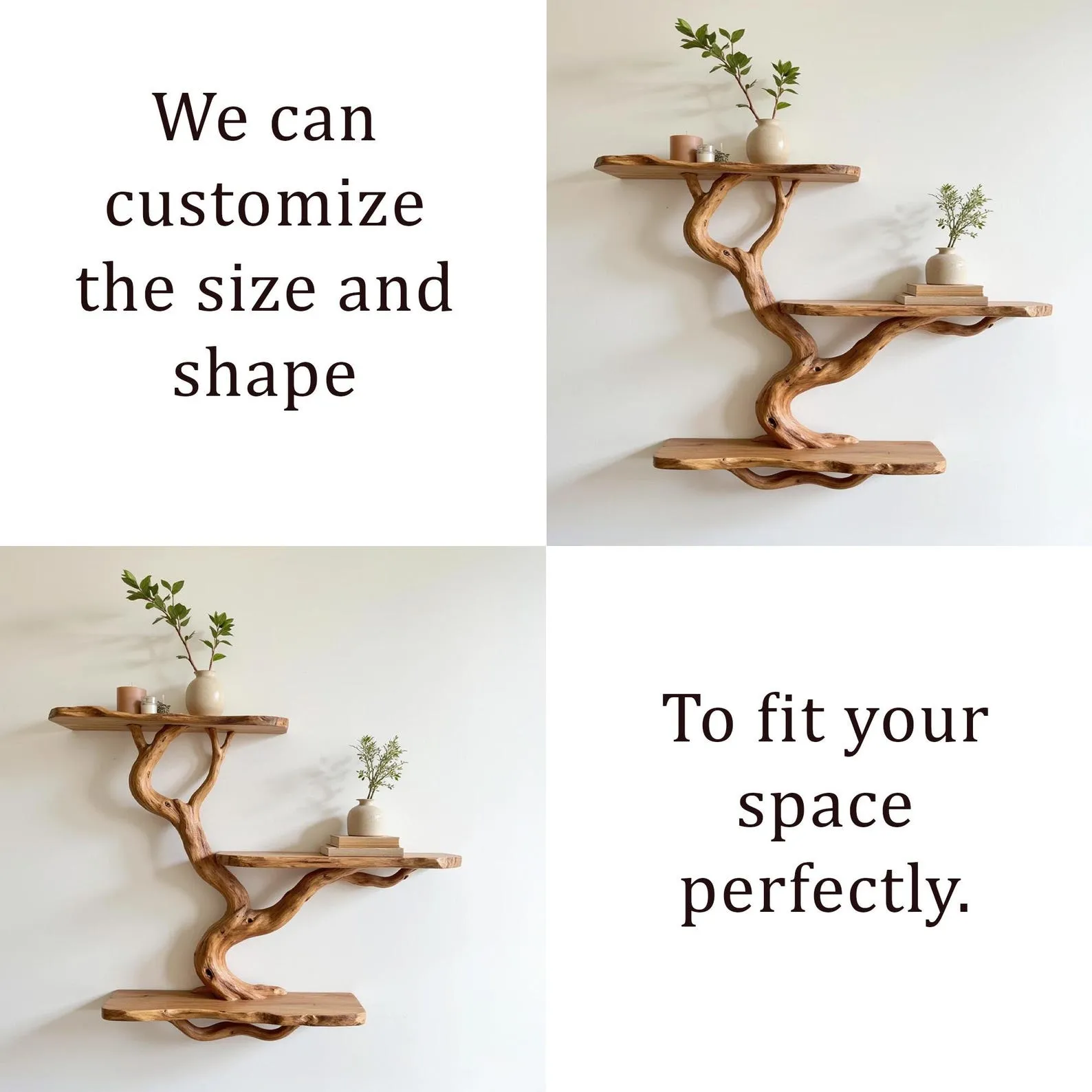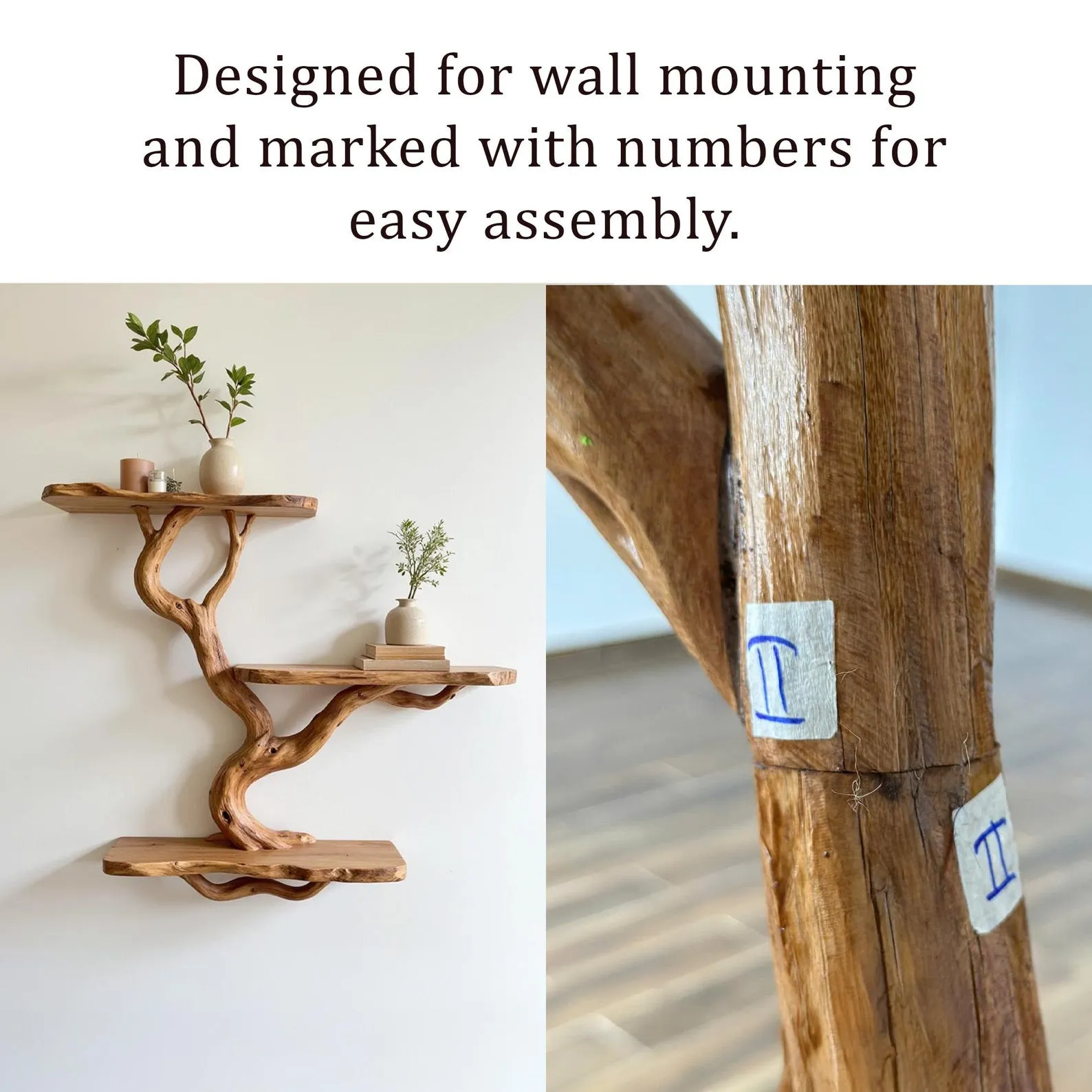 We carefully select driftwood branches from the high mountains of Vietnam to craft unique tree shelf wall mount like this. Each branch is handcarved by skilled artisans, highlighting the natural wood grain and distinctive organic curves. Because of this meticulous craftsmanship, every shelf is truly one of a kind, bringing a rustic yet elegant accent to your home Decor.Customizable Size & Shape:We understand that every space is different. That’s why we offer customization options for the size and shape of the live edge shelf, ensuring a perfect fit for your room and style preferences.’Easy Wall Mounting & Assembly:Designed for convenient wall mounting, each part of the shelf is marked with numbers to simplify the assembly process. Whether you’re experienced with DIY projects or prefer a straightforward setup, you’ll find installation hassle-free.Natural Variation:As this bookshelf is made from natural driftwood, please allow a size variation of 3 to 5 inches. These variations add to the authentic charm and uniqueness of your piece, making it truly special.Approval Before Shipping:We want you to be completely satisfied with your purchase. Before shipping, we will send you detailed images of your specific bookshelf for your review and confirmation. Please stay in touch so we can make any adjustments needed and ensure the final product meets your expectations.This driftwood bookshelf is more than just functional storage ‘ it’s a natural work of art that enhances any corner or wall. Perfect for displaying books, plants, or decorative accents, it brings warmth, character, and the beauty of nature into your living space.