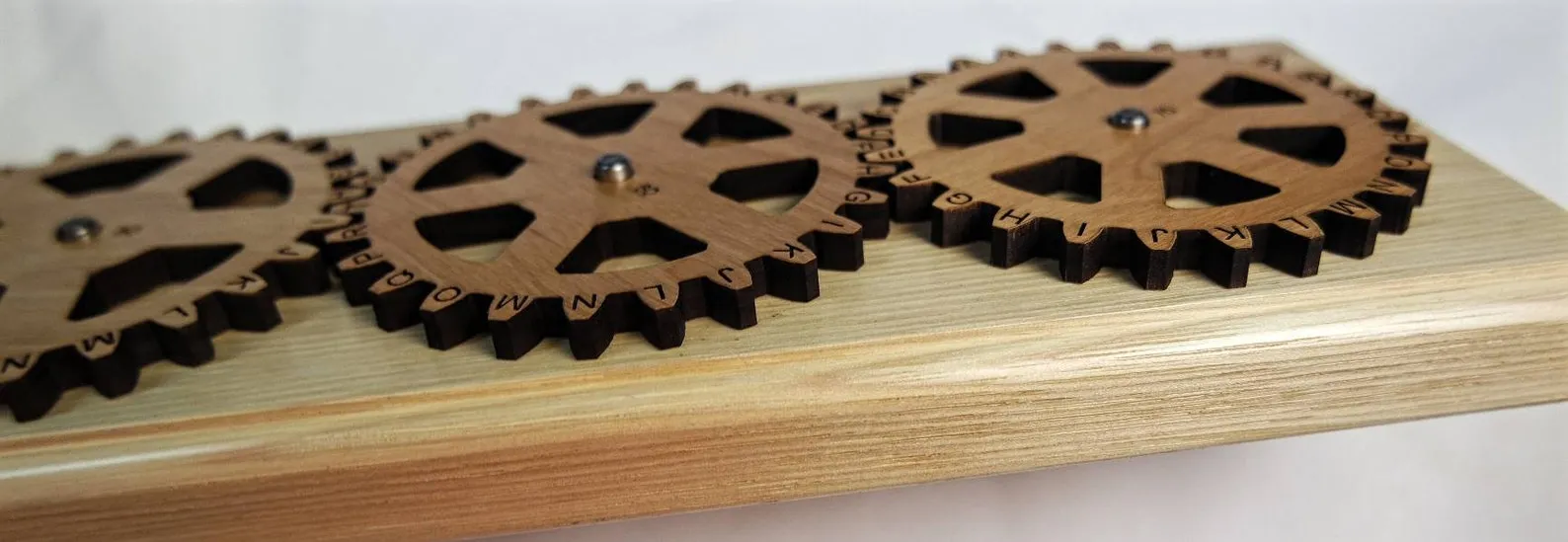 This is an encryption machine that will allow you to encrypt your own messages and in addition we have provided 8 secret messages for you to try and solve. A series of hints and finally full solutions are provided for the 8 secret messages.The machine can be used to encode your own secret messages. Send and receive secret messages to anyone who has a machine. its quite easy to use but creates messages that are not easy to decode. Complete instructions on how to use the machine are provided. Hardwood construction with gears cut from ?? thick wood. All letters and text are deeply laser engraved into the wood. The gears turn on alloy steel pins. Made in USA and designed to last a lifetime.Available in 2 different sizes. This listing is for the size large which measures approx. 12.75? x 4.5? x 1?. Each gear is approx. 3.7? in diameter. The base is beautifully finished hickory.Also available on a different listing is a smaller size. It measures 9.4? x3.2? x 1?. ? Creative Crafthouse Made in FloridaTo view a video on this items, copy and paste this link: (note is has older style base in a different wood)http://youtu.be/hiOjqskDlS0To encode a message:1. Define the gear order such as 7 (spokes) – 6 – 5 as shown above2. Create a 3 letter key word and put gears on pins with letters of keyword at each respective arrow. In the example above the keyword would be ZCK.3. The 3rd gear (right side) is the Output Wheel, or the gear that defines the unencoded letter. Turn this gear such that the first letter to be encoded is at the arrow.4. Record the encoded letter on the 1st gear at the top arrow. In the example above the letter ?K? would encode to ?Z?5. Turn the Output Wheel to the next letter to be encoded. 6. Record the encoded letter on the 2nd gear (middle gear) at the top arrow.7. Repeat this process going back and forth between the 1st and 2nd gears.Note that encoded messages are commonly grouped in blocks of 4 letter with no regard for word spacing or punctuation. Once the letters are decoded it is relatively easy to see the words. 8. OPTIONAL: you can make your message even more secure if you change your Key code during the course of the message. There are many ways to do this. For example you might have a key phrase that contains 3 key words. (such as ?Pet the Dog?)Then after every 12th letter you change the wheels to match the next key word. The first key setting would be PET, then THE, then DOG. Repeat this process moving through the key words and then starting over. It greatly increases the security of the message.