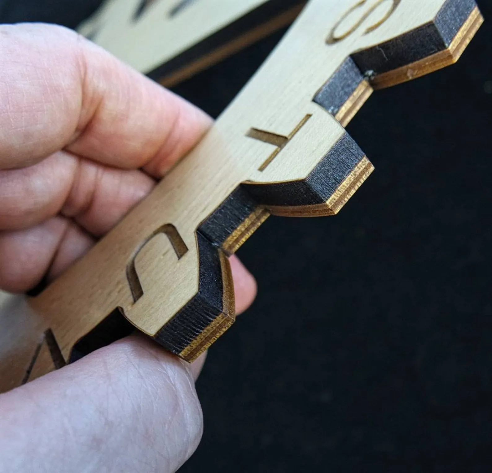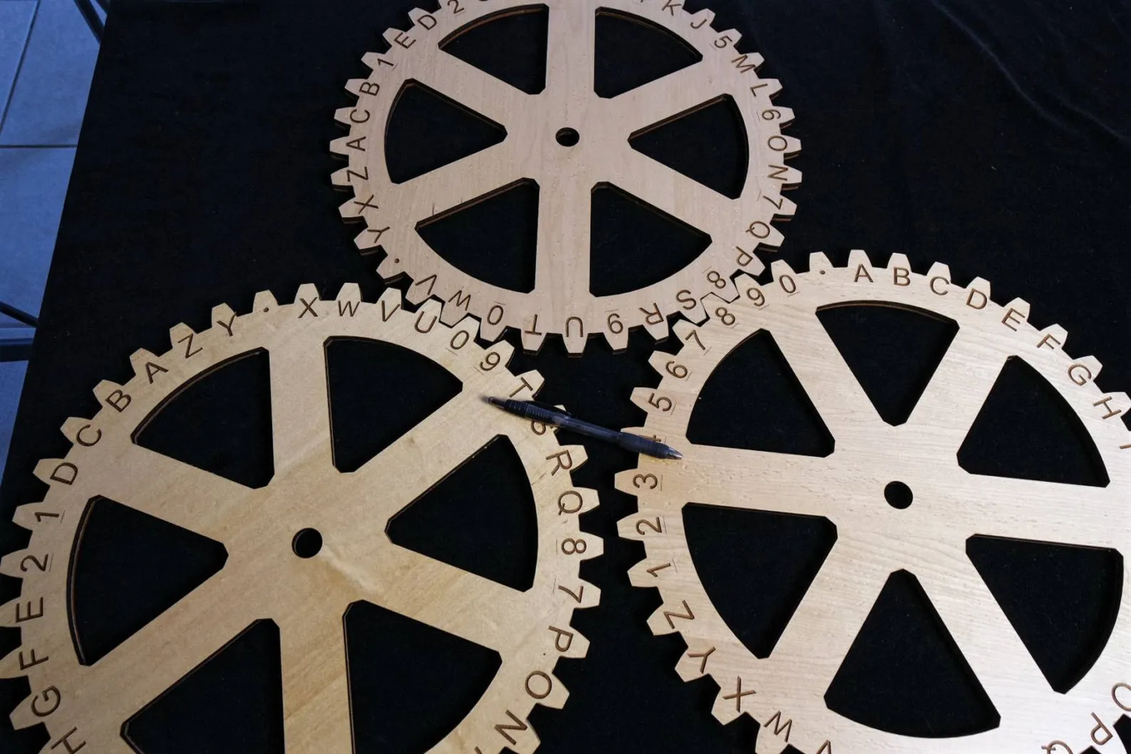 We made these giant cipher gears following a request from an Escape Room in the UK. They came out so well that I thought they may be something others could find creative uses for. The listing is for 1 Gear and you can string together as many as you like. The gear is 15.75? in diameter. The material is layered, with top layer being a ?? thick fine maple veneer with MDF core. The back layer is 1/8? Baltic birch plywood that adds strength and rigidity. The gears have 37 teeth. Each letter of the alphabet is contained along with 10 digits and a period or decimal point. Thus there is great flexibility in setting clues that may need letters, numbers, or both.The gears are sold individually. If you are creative it may be possible to use a single gear to provide clues if you combine it with some other object. Each gear you order will have a different orientation of letters and numbers, unless you want them to be exactly the same. You can string 2 or 3 or even more wheels in any pattern where one wheel will turn the others.There are many potential ways to use the wheels, but here is the most obvious perhaps: By setting one as the start wheel with a marker point on the wall; as that wheel turns the marker point could be aligned to a particular letter that you supply as a clue. The resulting letter or number on the other gear(s) could be the answer. A key word or phrase could be supplied that when dialed in one letter at a time, results in a secret message being revealed.For a modest fee, we could also customize the text on the gear teeth. They could have any characters, vector artwork, or a language other than English. We could also add text or artwork to the spokes or body of the gear. Please contact us separately for this custom work.If you want us to create a mounting backboard for each wheel, with a center dowel fixed into position we could provide that also, please contact us at DJ51 [!at] aol.com 352-346-5953To view a video on this item, please copy and paste this link:https://www.youtube.com/watch?v=G0f8MFiR29c