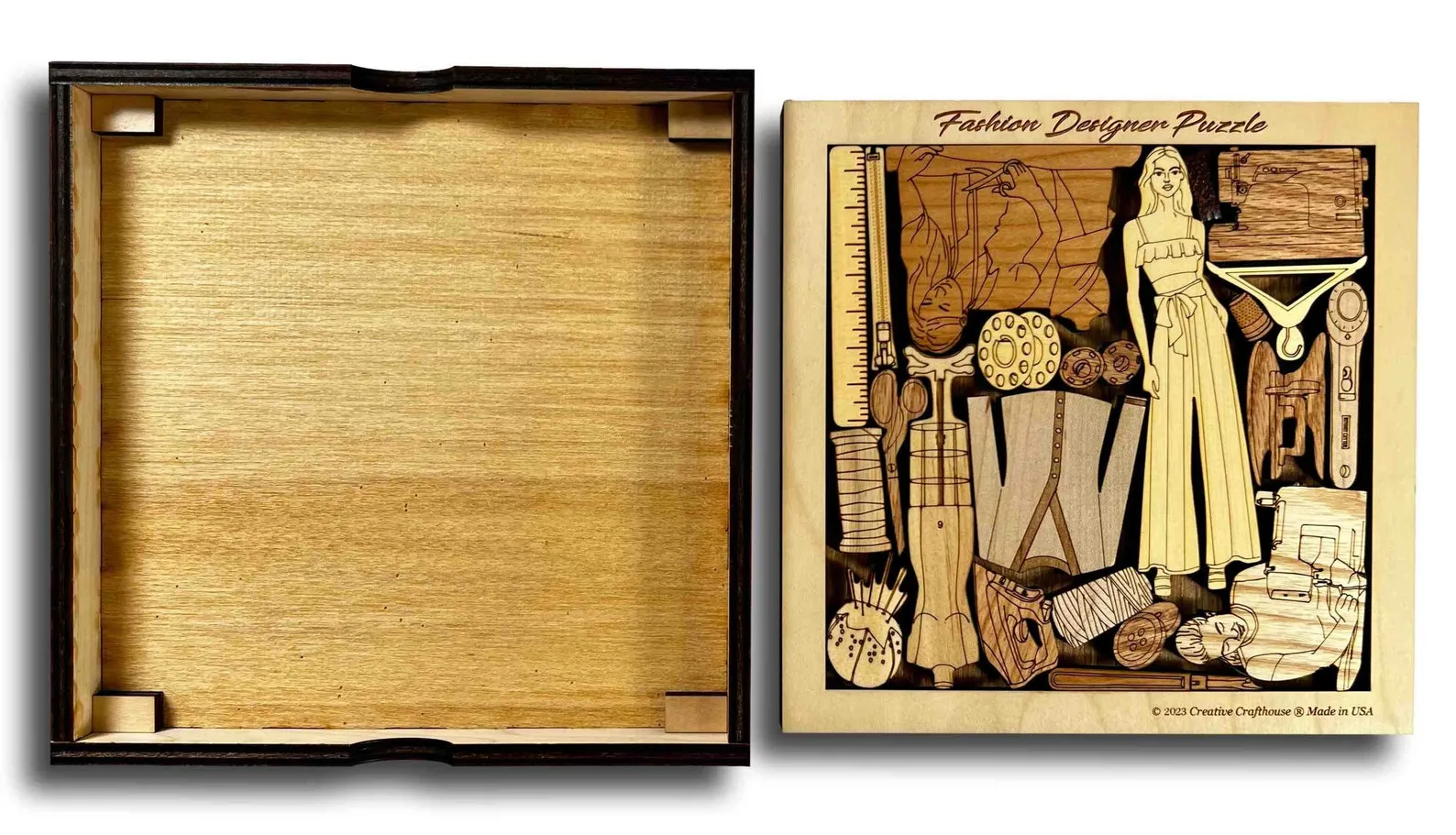 A challenging and artistic puzzle for the fashion designer or sewing expert. Not quite as difficult as creating a fashion masterpiece, but maybe close:)22 items associated with the clothes making profession are to be inserted in the frame. Pieces are precision laser etched and cut. This is one of our most detailed puzzles in the picture frame series of puzzles.Base frame is about 7″ square and comes with full cover to protect all the pieces. Made from at least 4 different hardwoods at 1/4″ thickNote: This version comes with a Female fashion designer piece. A separate listing will include a Male version of the same piece.?2019 Creative Crafthouse ? original artwork by Original artwork by Anjali RaniLevel of Difficulty: Level 4