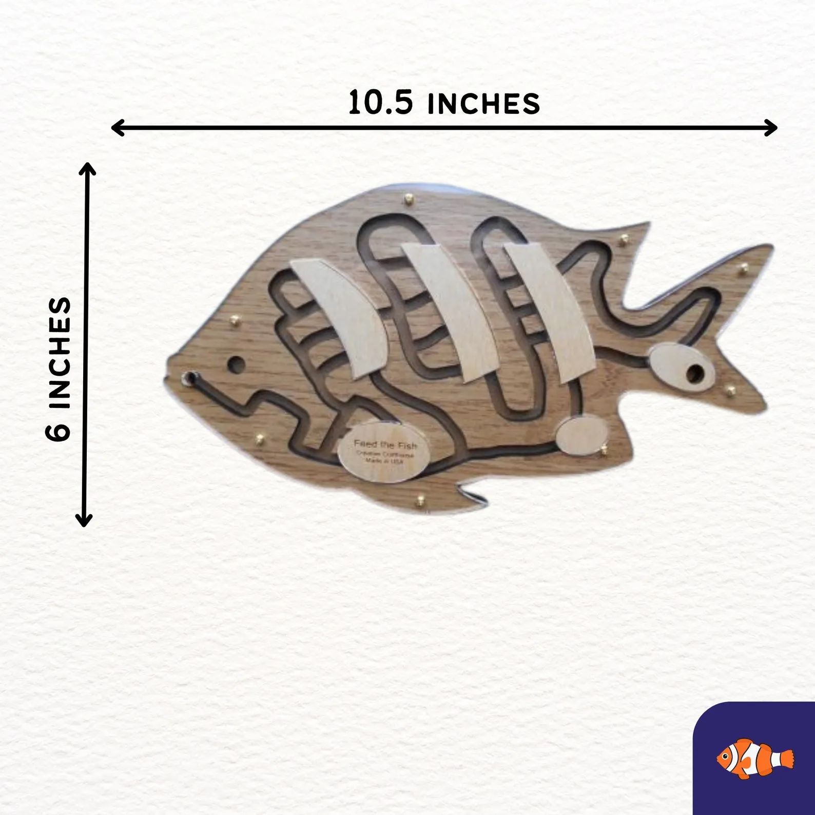 Move the ?Fish food? from mouth entrance to tail exit. Quite tricky as there are places within the maze that are blocked from view. It is of a moderate degree of difficulty, appropriate for ages 8 to adult.Ruggedly made from floorboard base and maze with acrylic top.Measures about 10.5? x 6? x ?? thick. The puzzle will stand up on its own and displaces nicely. The colors or shades of the floorboard material used may vary.Comes with organza bag containing 12+ steel balls. If you lose them, use readily available BB?s.An original CreativeCrafthouse design, Made in USA.See also our ?Feed the Dog? and ?Feed the Cat? designs available on different listing.To view a video on the fish puzzle, cut and paste this link:https://www.youtube.com/watch?v=RzSdzDzO5j0