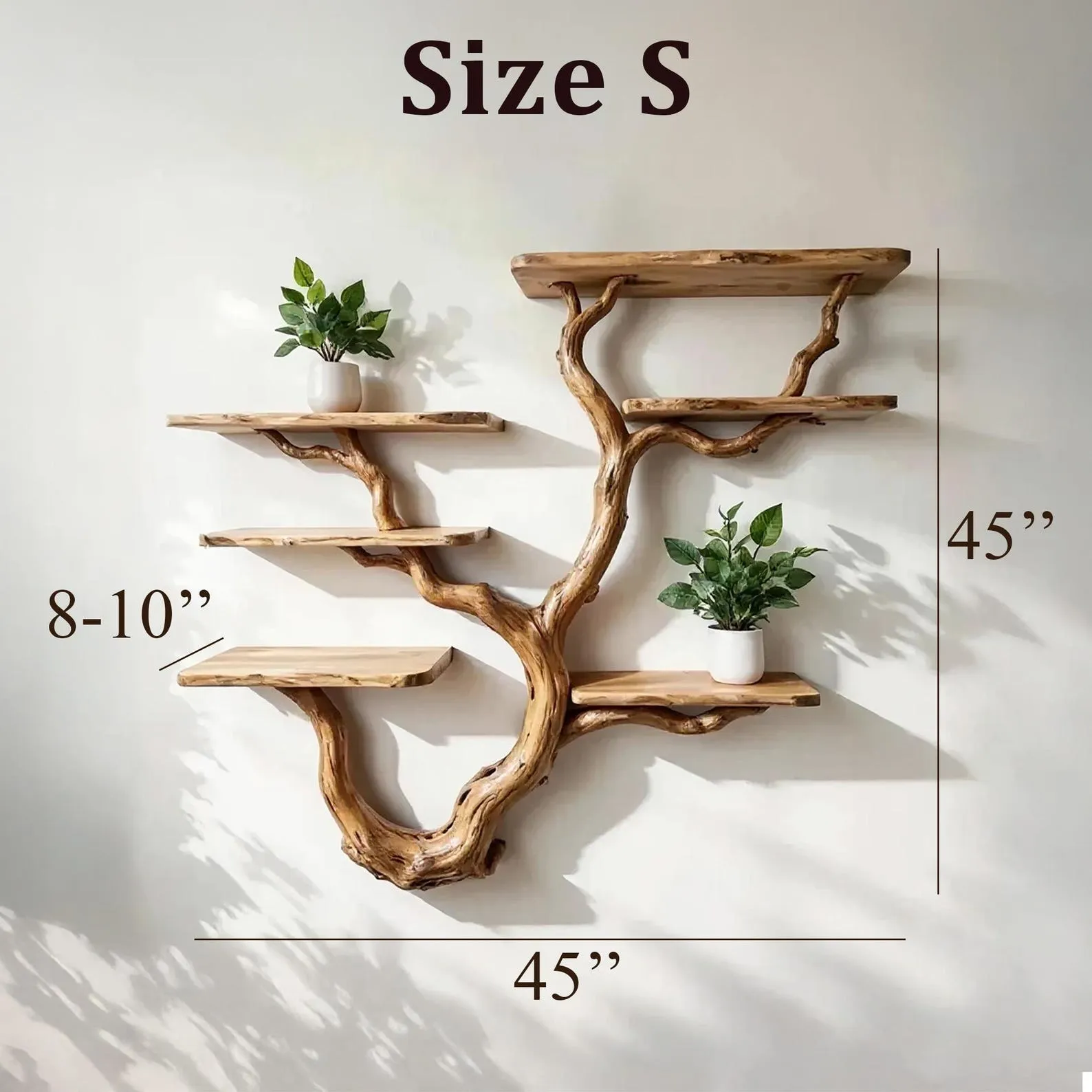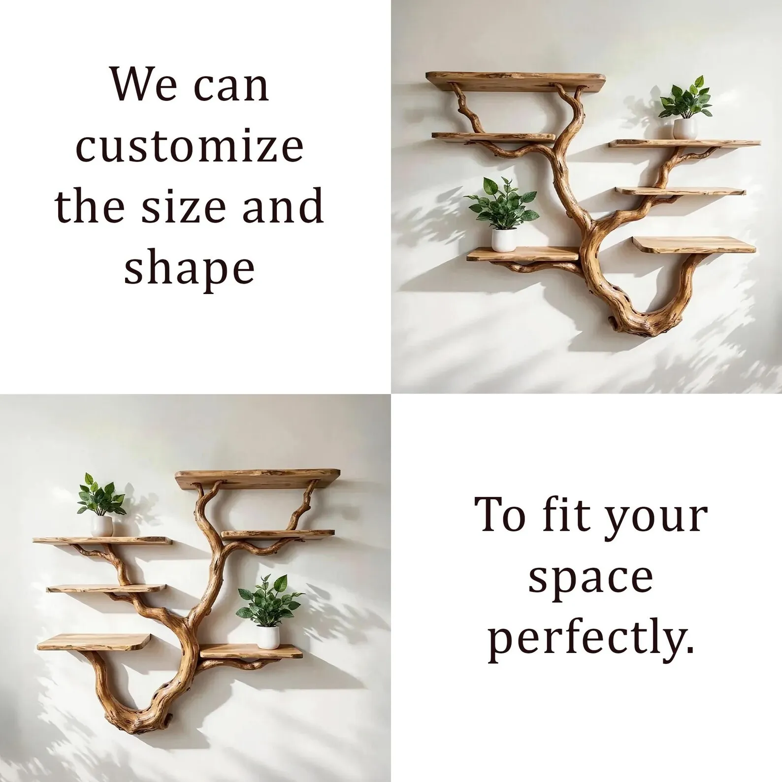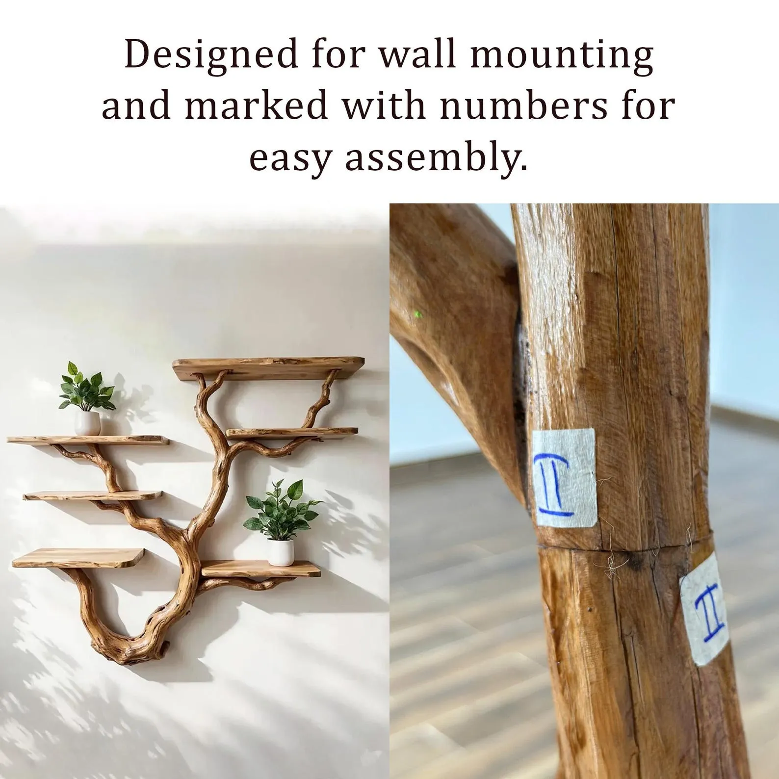 We carefully select driftwood branches from the high mountains of Vietnam to craft tree branch wall mount like this. Each branch is handcarved by skilled artisans, highlighting the natural wood grain and distinctive organic curves. Because of this meticulous craftsmanship, every shelf is truly one of a kind, bringing a rustic yet elegant accent to your home Decor.Customizable Size & Shape:We understand that every space is different. That’s why we offer customization options for the size and shape of the tree bookshelf, ensuring a perfect fit for your room and style preferences.’Easy Wall Mounting & Assembly:Designed for convenient wall mounting, each part of the shelf is marked with numbers to simplify the assembly process. Whether you’re experienced with DIY projects or prefer a straightforward setup, you’ll find installation hassle-free.Natural Variation:As this bookshelf is made from natural driftwood, please allow a size variation of 3 to 5 inches. These variations add to the authentic charm and uniqueness of your piece, making it truly special.Approval Before Shipping:We want you to be completely satisfied with your purchase. Before shipping, we will send you detailed images of your specific bookshelf for your review and confirmation. Please stay in touch so we can make any adjustments needed and ensure the final product meets your expectations.This driftwood bookshelf is more than just functional storage ‘ it’s a natural work of art that enhances any corner or wall. Perfect for displaying books, plants, or decorative accents, it brings warmth, character, and the beauty of nature into your living space.