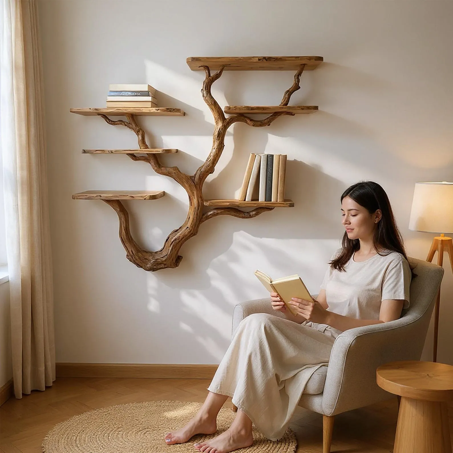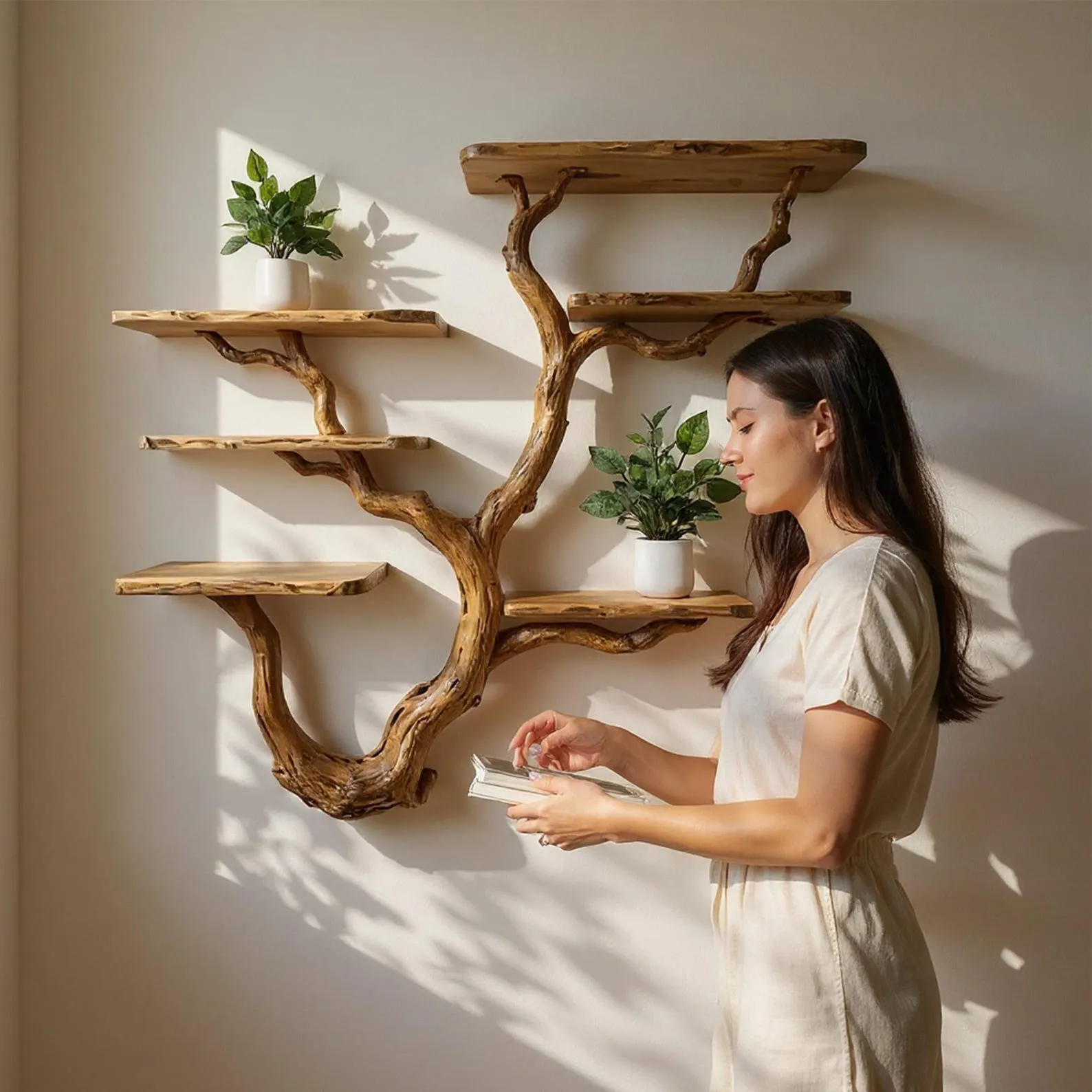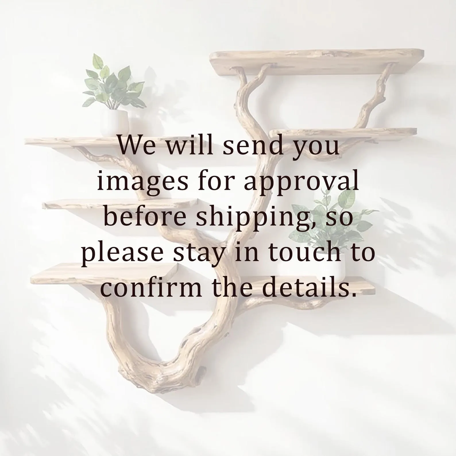 We carefully select driftwood branches from the high mountains of Vietnam to craft tree branch wall mount like this. Each branch is handcarved by skilled artisans, highlighting the natural wood grain and distinctive organic curves. Because of this meticulous craftsmanship, every shelf is truly one of a kind, bringing a rustic yet elegant accent to your home Decor.Customizable Size & Shape:We understand that every space is different. That’s why we offer customization options for the size and shape of the tree bookshelf, ensuring a perfect fit for your room and style preferences.’Easy Wall Mounting & Assembly:Designed for convenient wall mounting, each part of the shelf is marked with numbers to simplify the assembly process. Whether you’re experienced with DIY projects or prefer a straightforward setup, you’ll find installation hassle-free.Natural Variation:As this bookshelf is made from natural driftwood, please allow a size variation of 3 to 5 inches. These variations add to the authentic charm and uniqueness of your piece, making it truly special.Approval Before Shipping:We want you to be completely satisfied with your purchase. Before shipping, we will send you detailed images of your specific bookshelf for your review and confirmation. Please stay in touch so we can make any adjustments needed and ensure the final product meets your expectations.This driftwood bookshelf is more than just functional storage ‘ it’s a natural work of art that enhances any corner or wall. Perfect for displaying books, plants, or decorative accents, it brings warmth, character, and the beauty of nature into your living space.