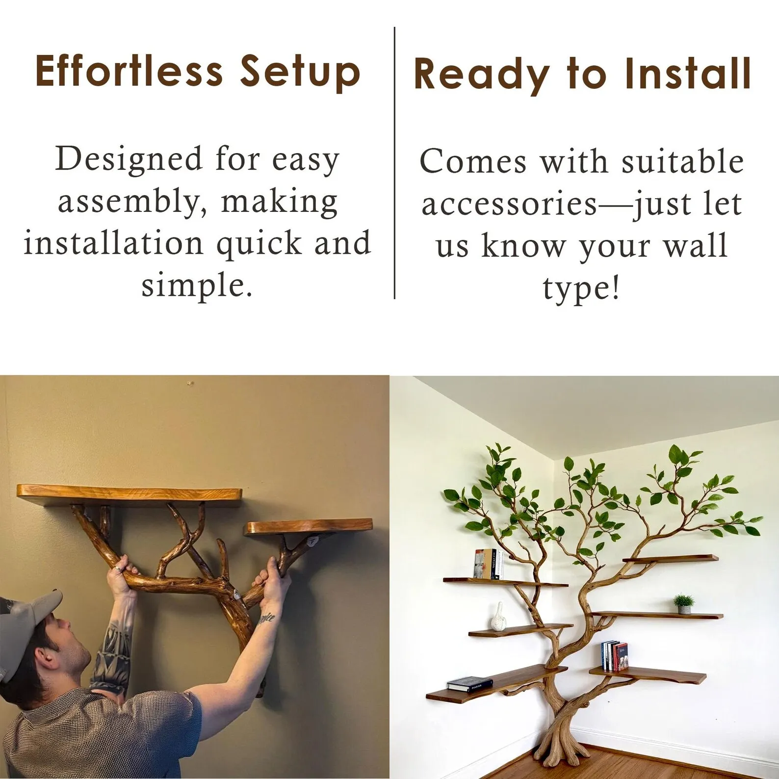 Aurenroot made this Corner Tree Floating Bookshelf from handcarved solid wood, with the branch crafted from natural driftwood branch and the shelves are made from natural solid wood. This natural wood bookshelf is a stunning example of handmade furniture, designed to bring the beauty of nature into your home.Each piece is meticulously handmade, ensuring no two bookshelves are exactly the same every tree branch shelving unit features its own unique natural characteristics.We offer customizable sizes and colors, so just share your idea with us, and we’ll bring it to life. Need help selecting the right accessories for your wall type? Message us, and we’ll guide you through the options.After your purchase, please check your email and messages, as we may send a photo of your custom piece before shipping to ensure it meets your expectations.Looking forward to serving you, we cherish the opportunity to create something as unique and special as your home.