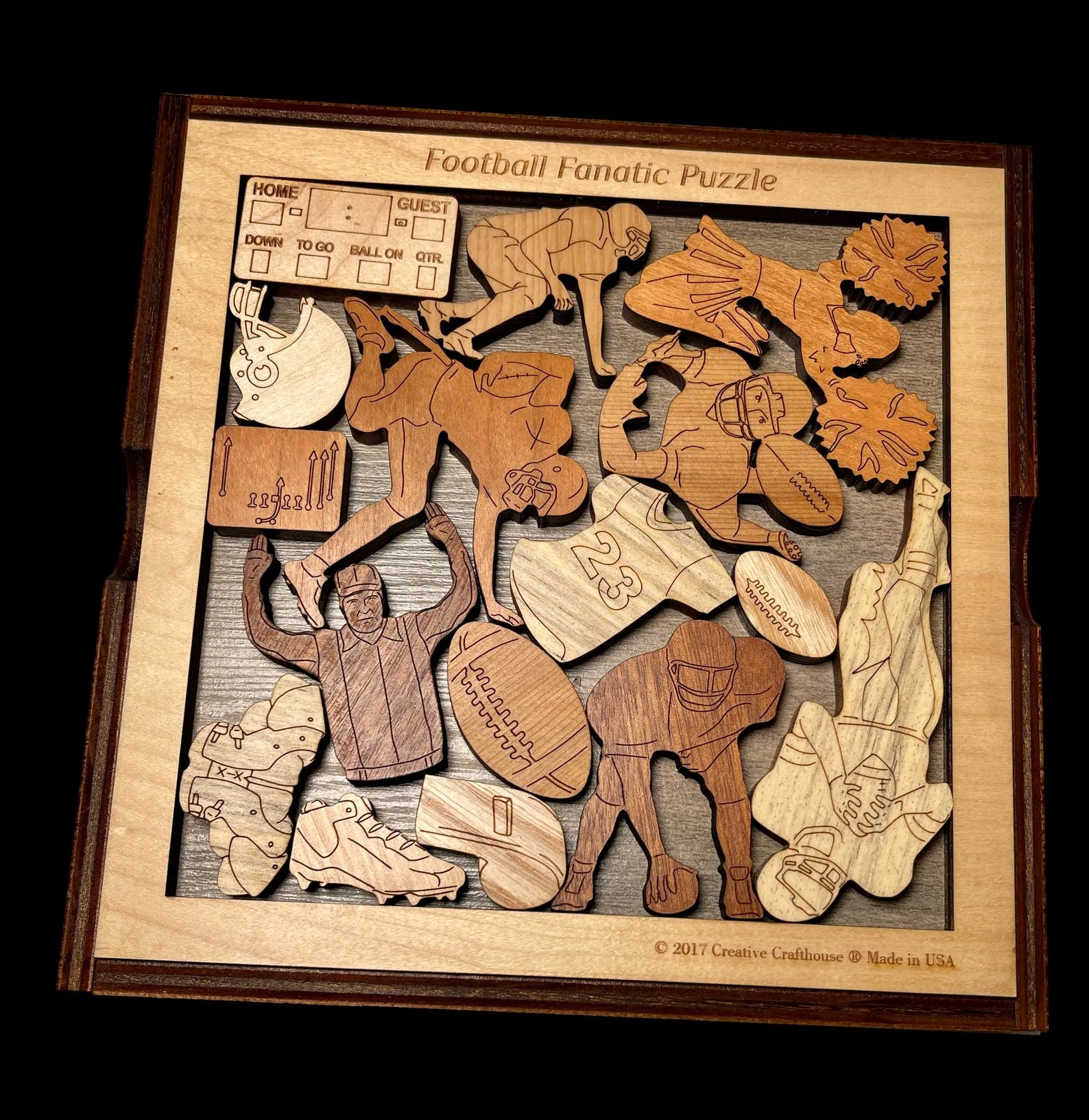 May be more difficult than a touchdown pass; can you get all the pieces into the frame? An original and challenging 16 piece puzzle created using at least 5 different types of wood. The woods are ?? thick and all precision laser cut and engraved. Each puzzle will have its own look as we mix up the wood varieties. Measures about 7? x 7? in the frame.Items included in the design include players in various positions, Referee, whistle, 2 Footballs, Cheerleader, Playboard, Shirt, Scoreboard, Helmet, Cleats, & Shoulder Pads.This puzzle can be personalized (choose the engraving option) with a name or message on the frame, cover or puzzle piece.An original Creative Crafthouse design, Made in USAartwork by Alexandra Plummer.To view a video on this puzzle, please copy and paste this link:https://www.youtube.com/watch?v=H20FzT67jWk