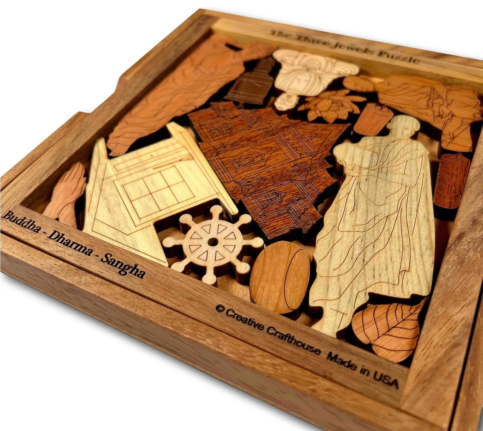 Three jewels puzzle - Buddhism picture frame wooden puzzle - 14 Buddhism-themed pieces - Adult brain teaser puzzle - Challenging wood puzzle