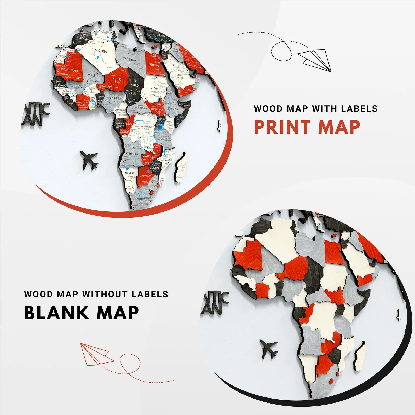 ? Print Map – unique wooden world map with printed inscriptions of countries, capitals, cities, rivers and lakes, roads