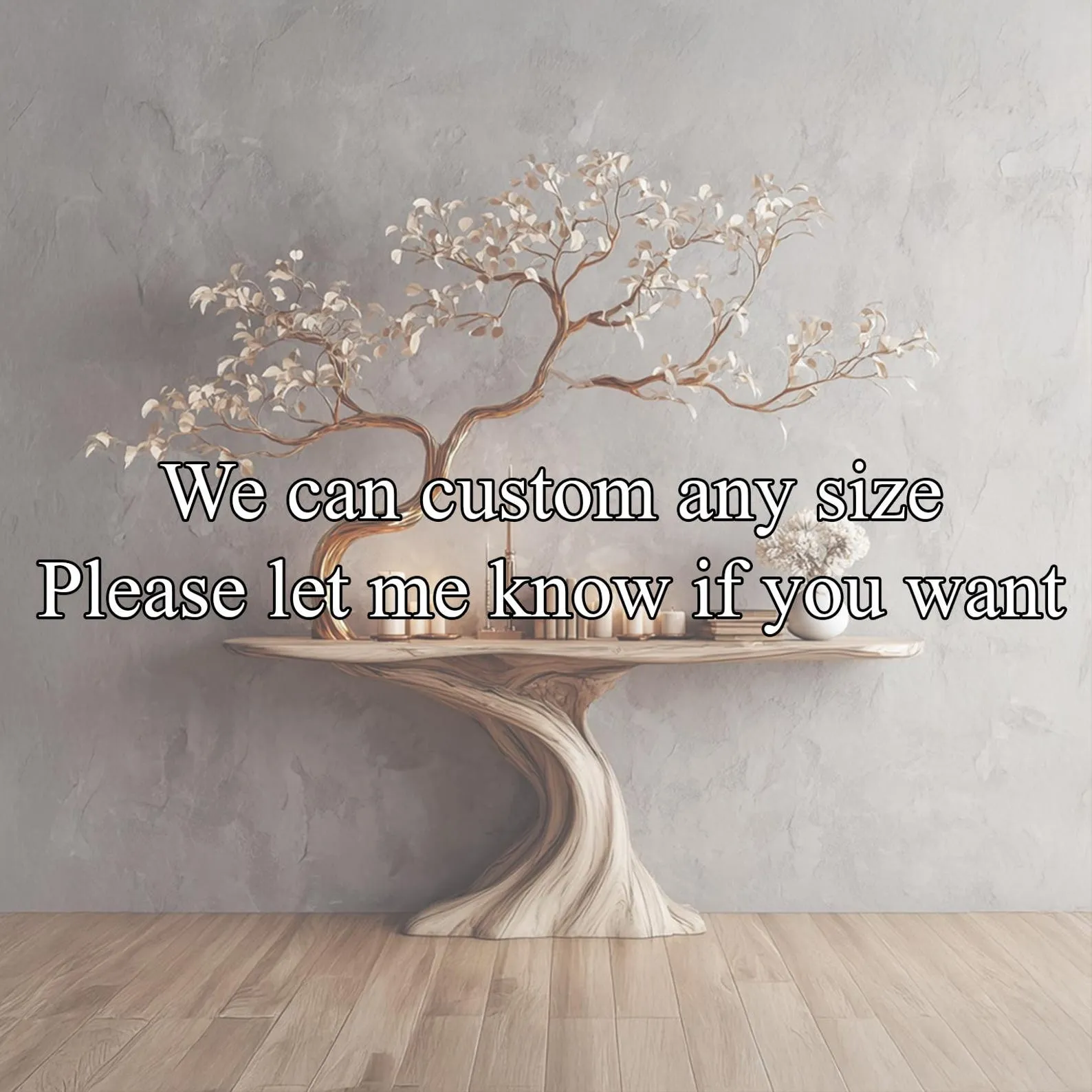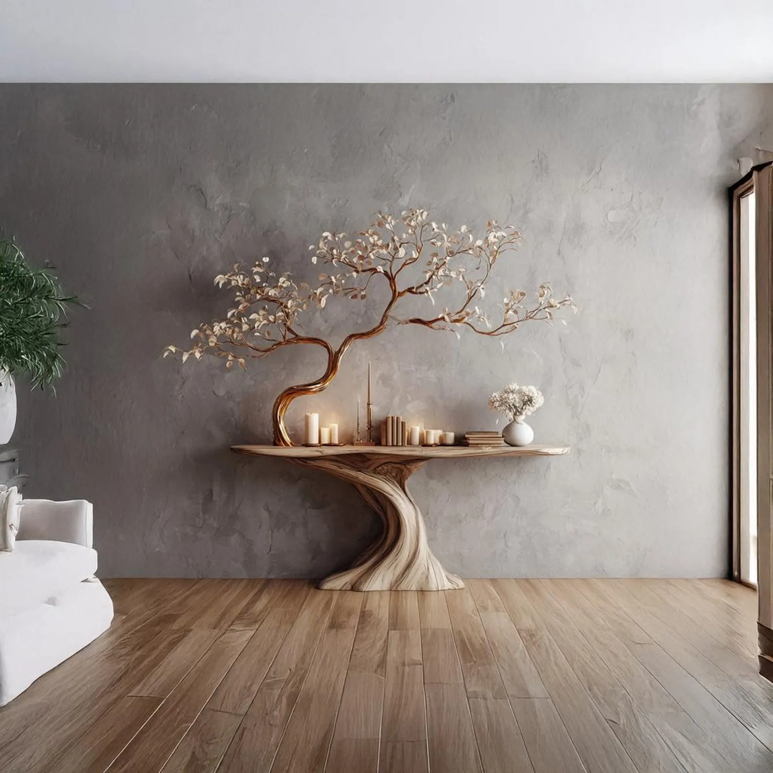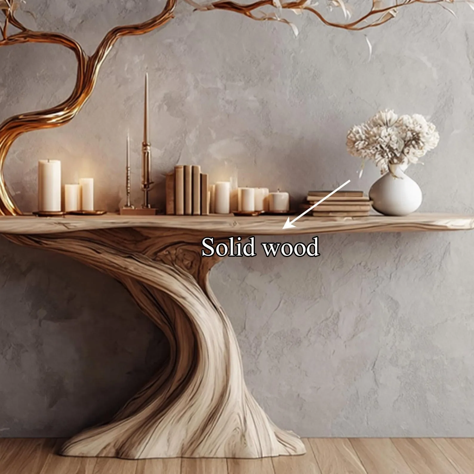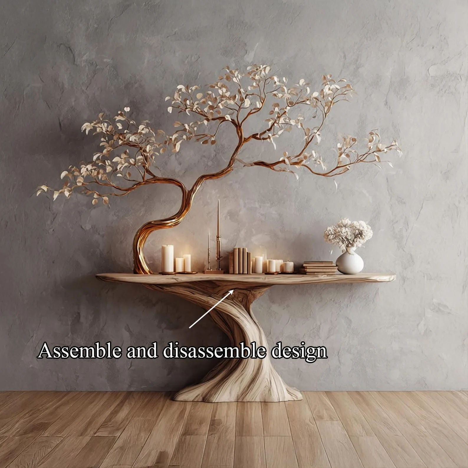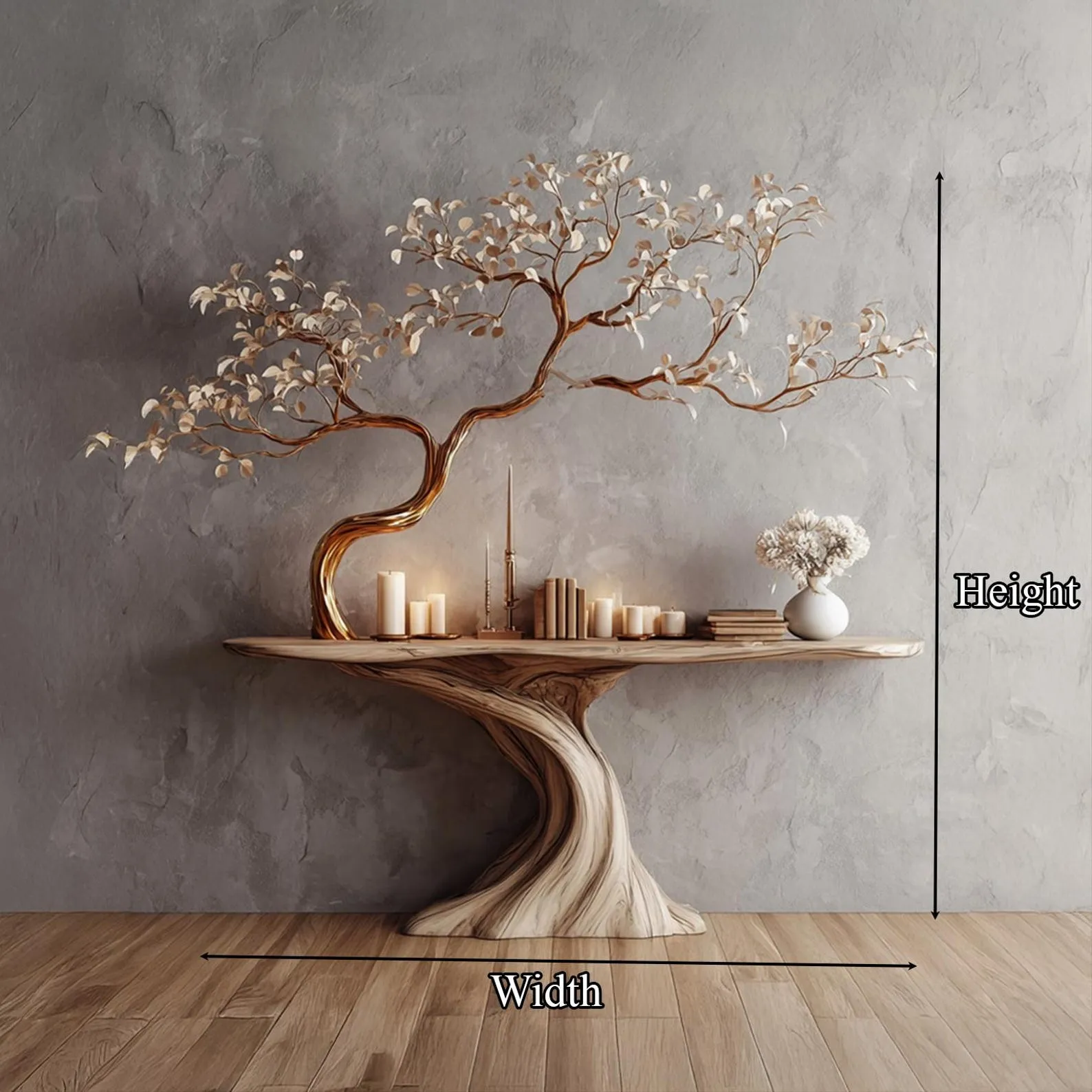 A handcrafted wooden console table paired with a distinctive tree-shaped bookshelf makes a stunning addition to any home.