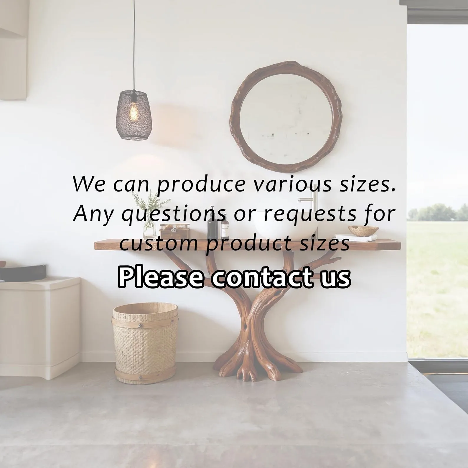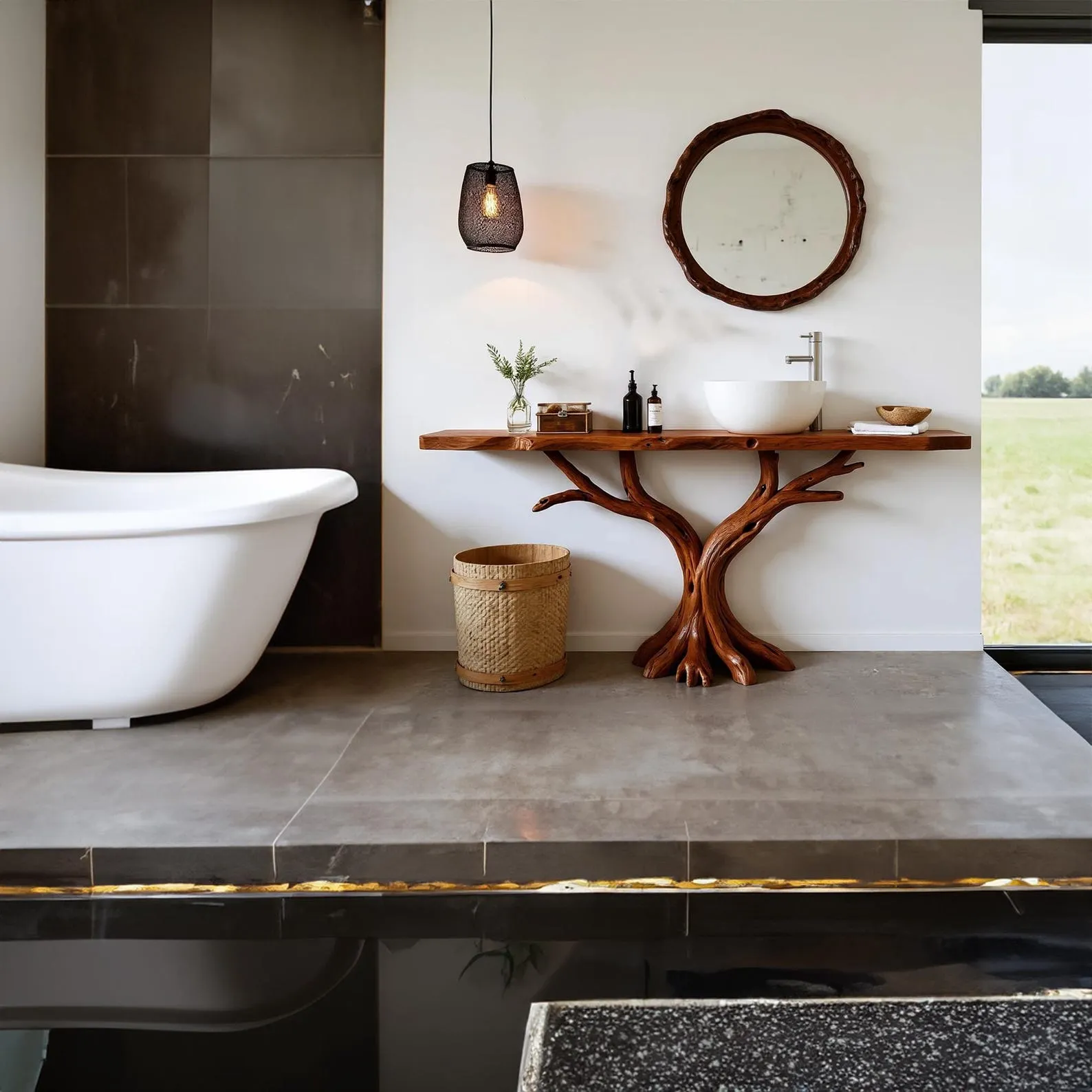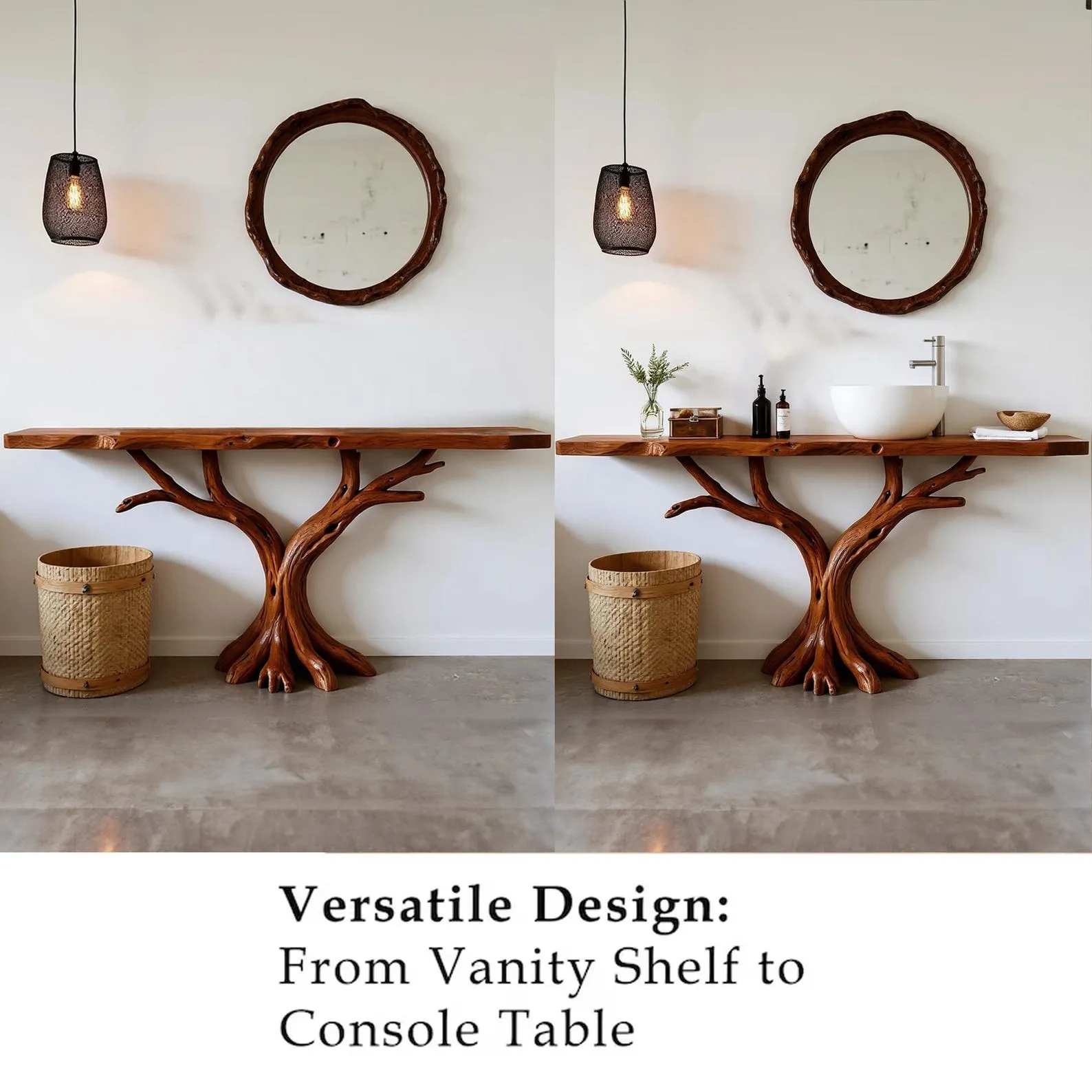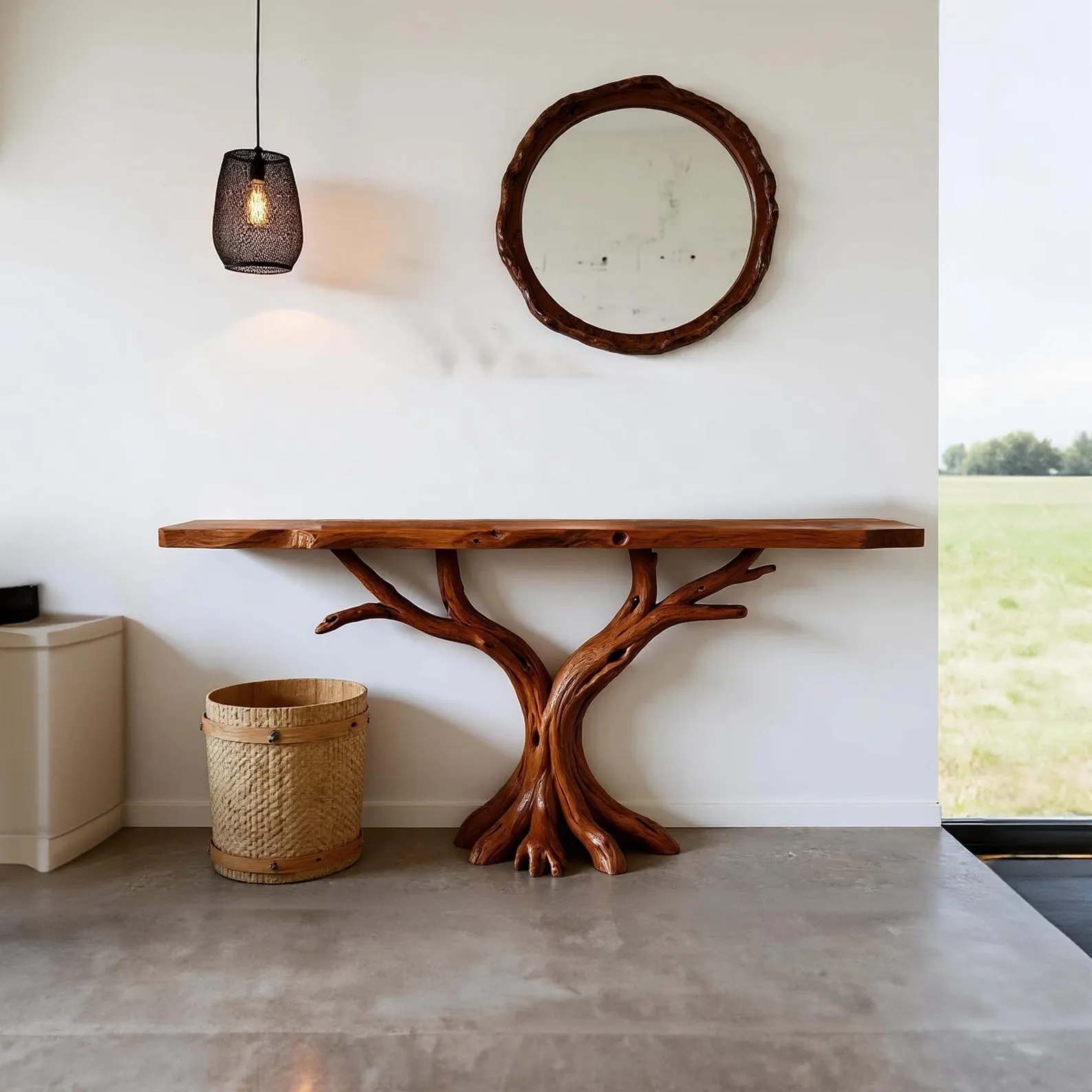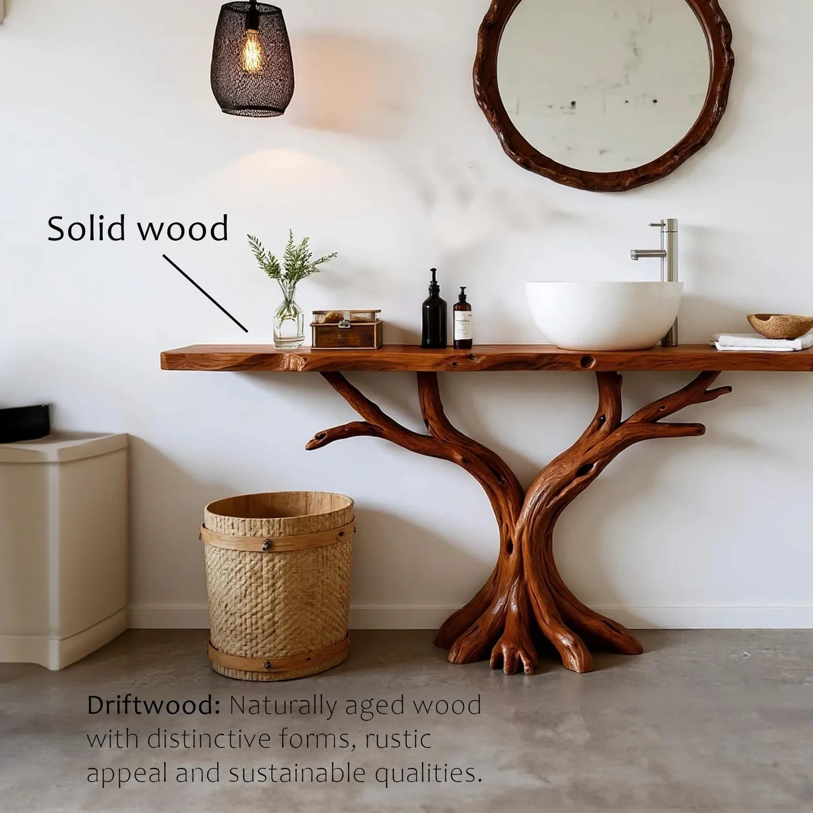 Transform your interior with this handmade wooden vanity table with tree root legs, a one-of-a-kind furniture piece that brings organic beauty and timeless design into any space. The sculptural base is carefully crafted to resemble flowing roots, making it not only functional but also a natural wood art console table for modern rustic living rooms.This piece works perfectly as a solid wood bathroom vanity with live edge top, offering strength, durability, and unique wood grain patterns that stand out in every detail. The combination of smooth surface and raw, organic lines turns it into a wabi-sabi inspired wooden furniture piece for minimalist homes.Place it in your entryway as a rustic farmhouse console table with natural wood texture, or style it as a boho hallway vanity shelf with handcrafted design. In a modern home, it doubles as a Japandi style wood console with sculptural base, blending seamlessly with contemporary, cozy, or nature-inspired interiors.Every table is made from reclaimed hardwood, ensuring sustainability and character. The wood is hand-polished to highlight its natural grain, creating a unique artisan furniture centerpiece for eco-friendly homes.Its versatile design allows you to style it as a handmade bathroom sink cabinet with root base, a luxury wood console for entryway Decor, or a solid wooden vanity shelf for rustic spa interiors. Each function highlights a different aspect of its artistry’always making it the focal point of your home.This is more than just furniture; it’s a statement piece that celebrates craftsmanship, nature, and individuality.
