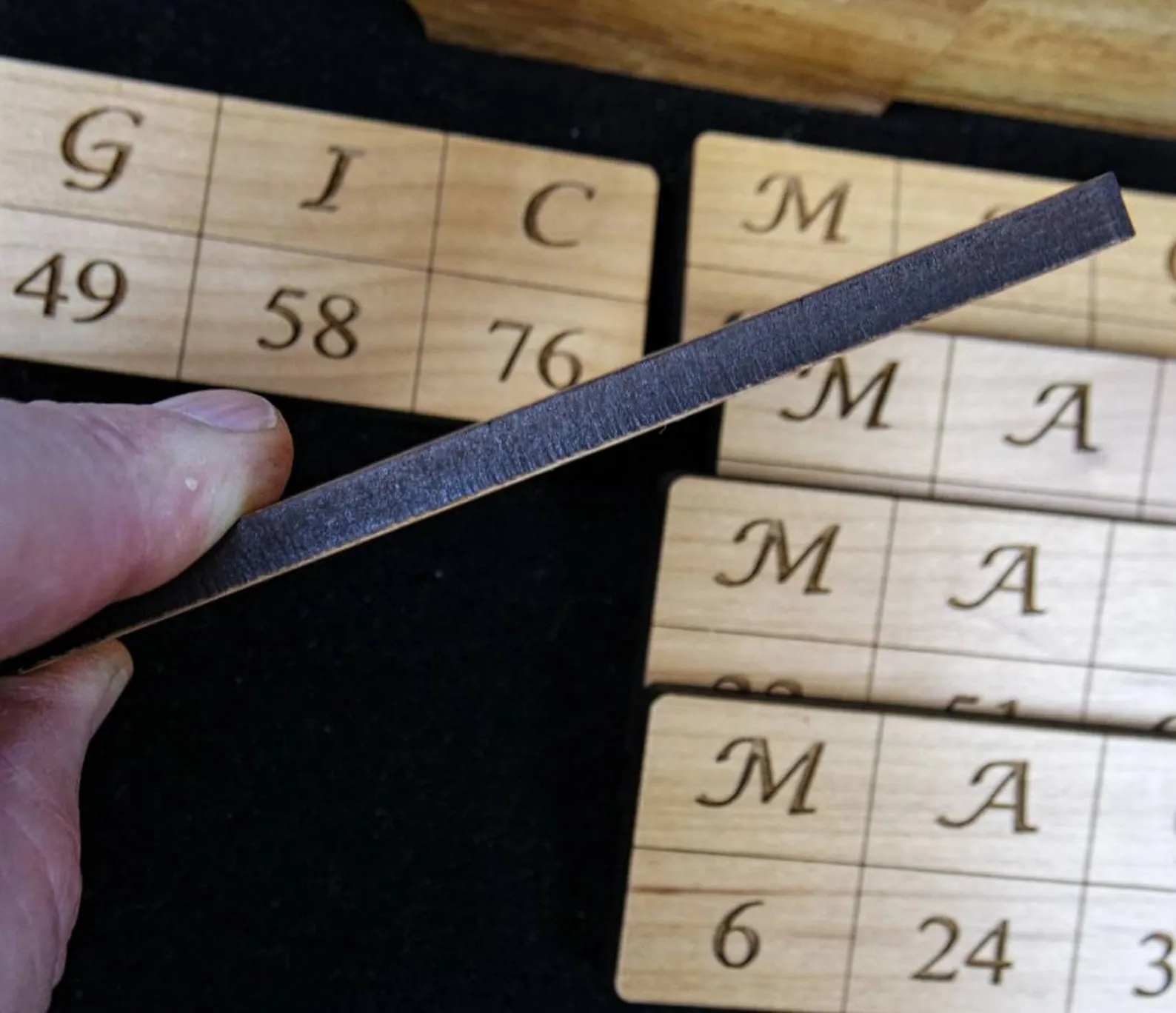 You have a box set with 6 laser engraved wood cards each about 5.4? x 1.4?and about ?? thick. Each card has the Word MAGIC written across the top. Below each of the word MAGIC letter is a number. The numbers of the 6 cards are all different. Here is the effect… Ask 5 people to each select one card, it is not necessary that you know which cards they have. There will be one remaining, so set that aside.Announce that you are going to write down a number on a piece of paper. Fold it and set it aside.Next ask one person to shout out a number below the letter M on their card. Any person can do this. Write that number down. Next, a different person gives you the number below the letter A on their card. Write down that number below the first number (as we will be adding all the numbers). Next, a third person gives you the number below G on their card. Then a fourth person gives you the number below I and the fifth person the number below C. Now everyone has contributed 1 number.Ask someone to add up all 5 numbers. Once this is done and announced, open the piece of paper that you had set aside at the beginning of the trick. You will have written down a matching number.This trick can be performed with less than 5 people of course. Just divide up the cards between whoever is there, or even give them all to one person. Just make sure that each card is only used one time when numbers are provided.Want to know how it?s done? I have put the answer on the video link below along with a variation in the presentation that you may find interesting. This trick is easy to perform when you know the secret and requires no special math skills.https://youtu.be/D2mR9Q7ZWO8Note that we can customize these cards. Instead of the word MAGIC, we could use any 5 letter word. It could be a your name, or a company name, or it could even be 5 different symbols or pictures (vector artwork needed for pictures). There would be an added charge for this, so contact me on the side if you are interested.
