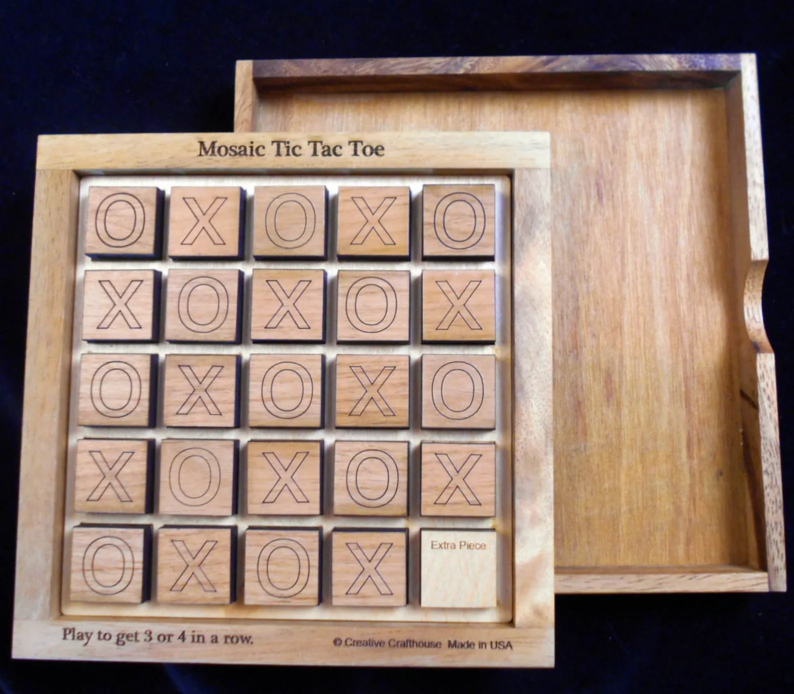 2 players alternate turns to be the first to get 3 or 4 in a row. (Define ahead of time whether 3 or 4 is the goal). Has all the fun elements with a greater level of complexity. Also has elements of Connect 4 when played to get 4 in a row. Comes with base and cover to hold all pieces in place and an internal grid which securely holds pieces in location while playing the game.X?s and O?s are laser etch for both beauty and durability.Made in USA by Creative CrafthouseRules:Each player has 12 pieces; note there is an extra blank piece to fill in the 25 available spaces on the 5×5 gridDecide who will go first. In follow up games, loser always goes first.Decide whether the goal is to be the first to achieve either 3 or 4 in a row.Player 1 may place a piece anywhere on an open spot within the gridPlayer 2 follows to do the same thing and turns continue to alternate.To win the game you must have 3 (or 4 as agreed at the start of the game) pieces in a row or column or diagonal. The pieces must be contiguous or adjacent; gaps do not count.To view a video of this family game cut and paste this link:https://youtu.be/NY_XYtItwAA