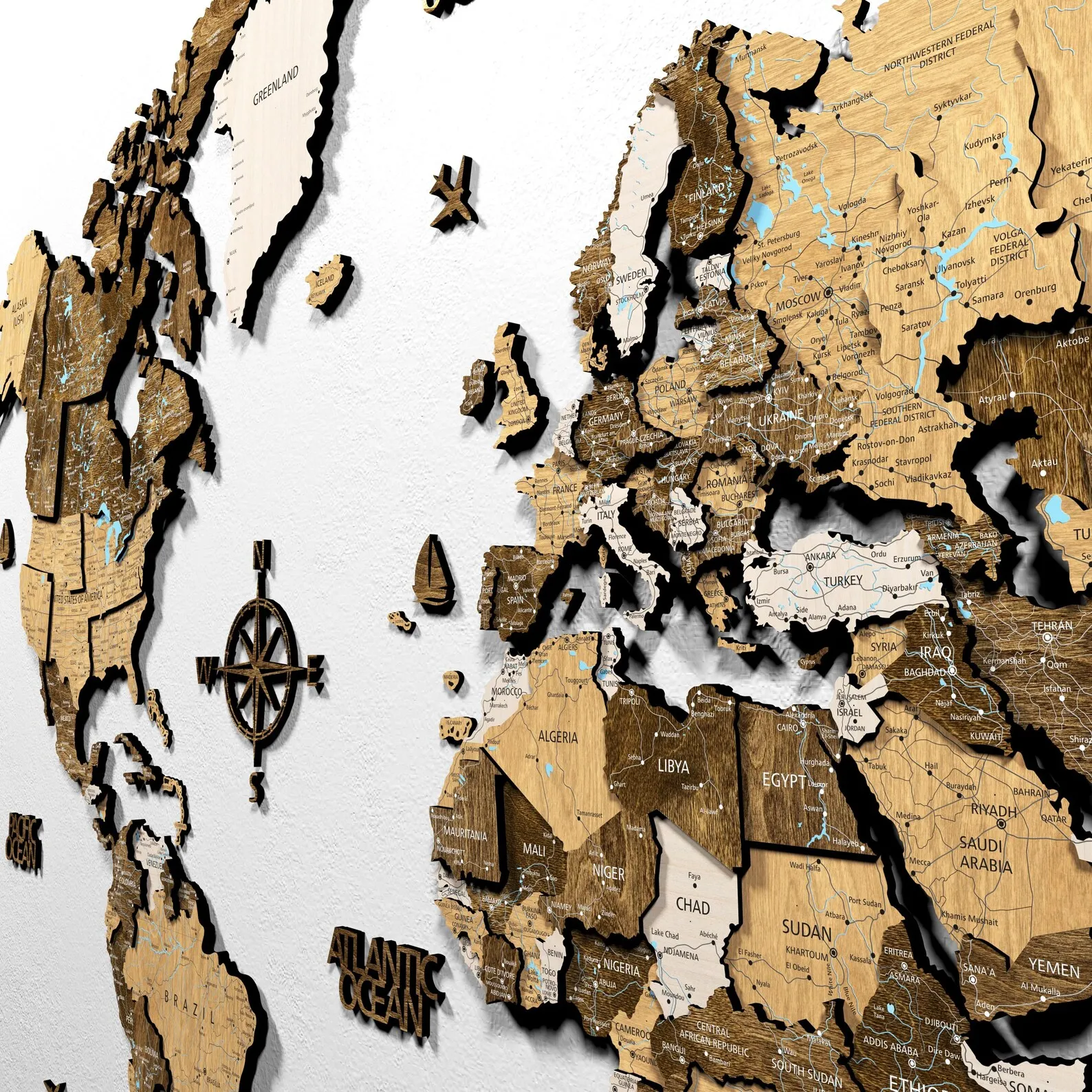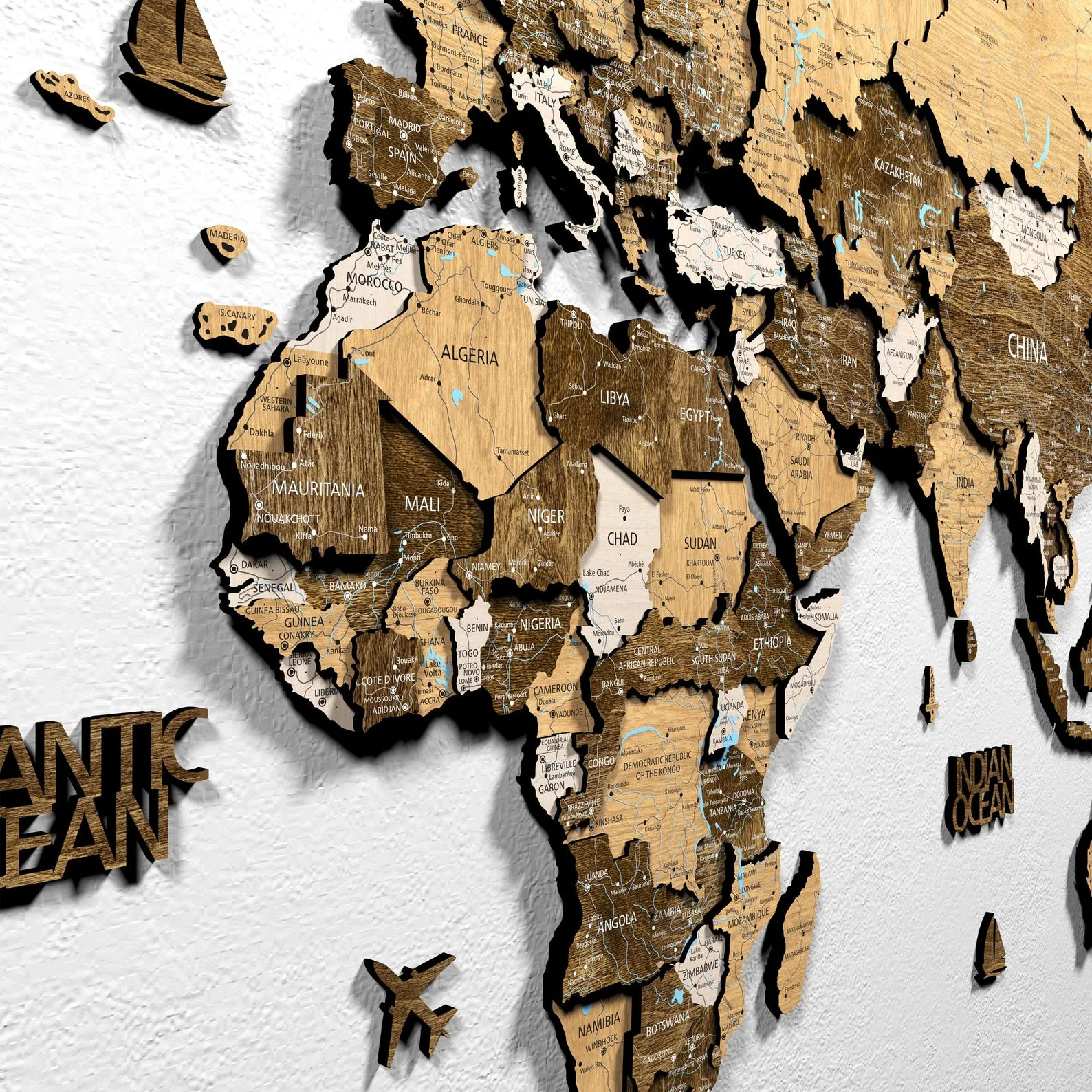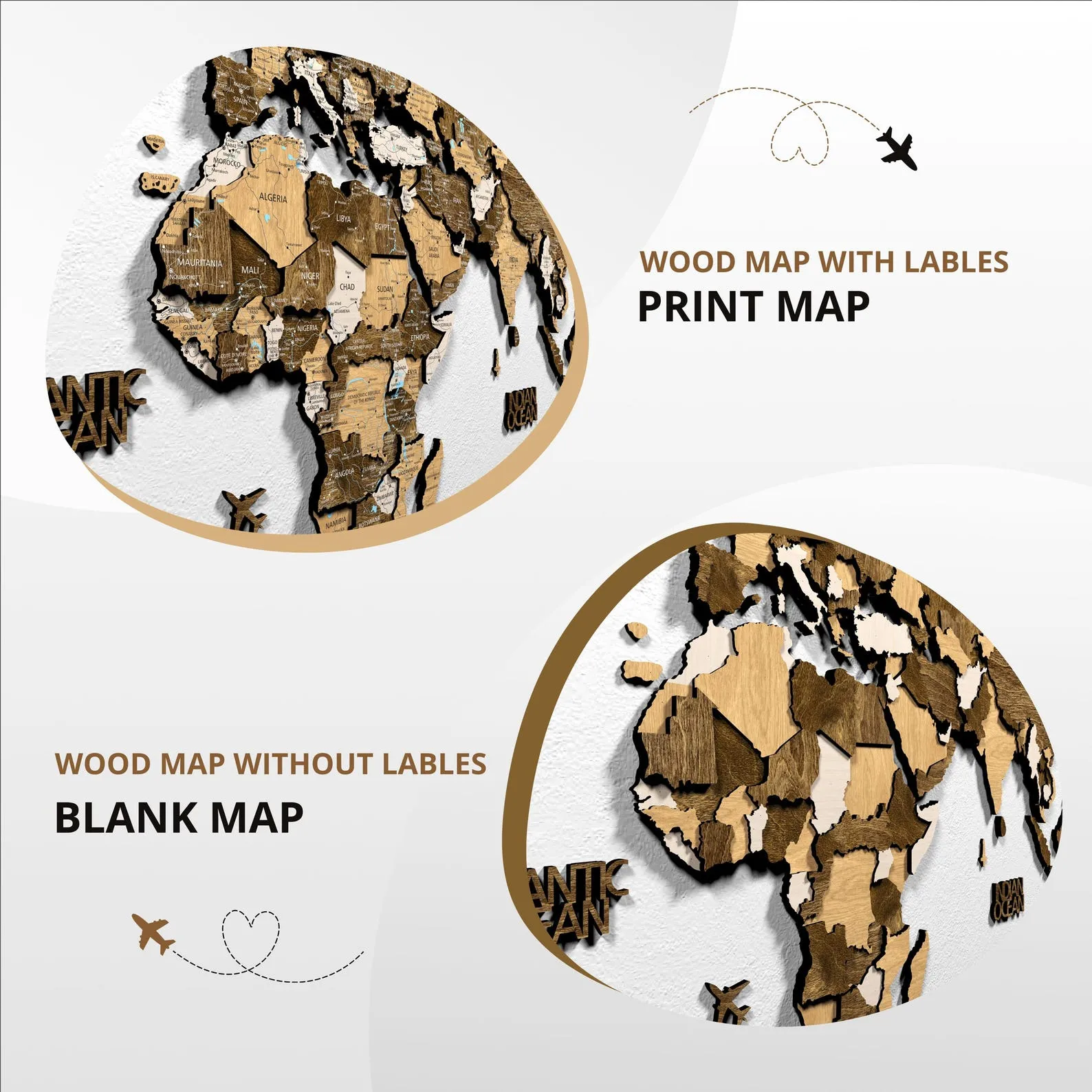 Multi-Layered Wood World Map Wall Art ? Detailed Print Map with hidden base