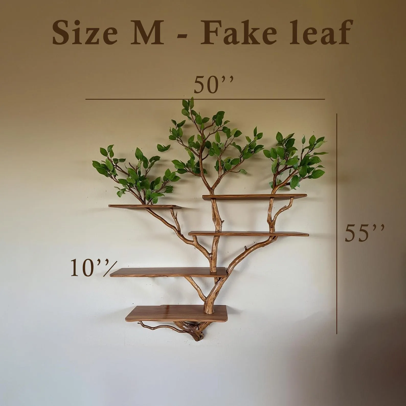 Natural driftwood tree branch floating bookshelf wall mount solid wood bookcase with fake leaf decor for home