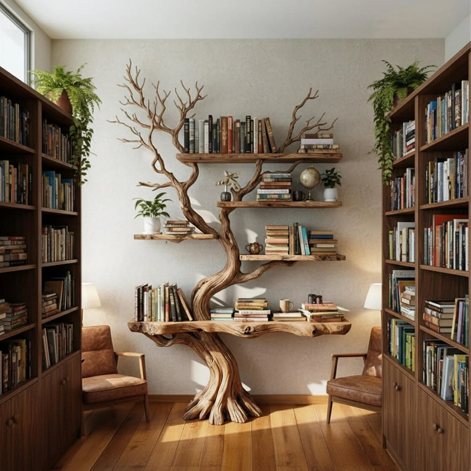 Handcrafted Tree Branch Bookshelf Nature-Inspired Wall Mounted Wooden Shelf