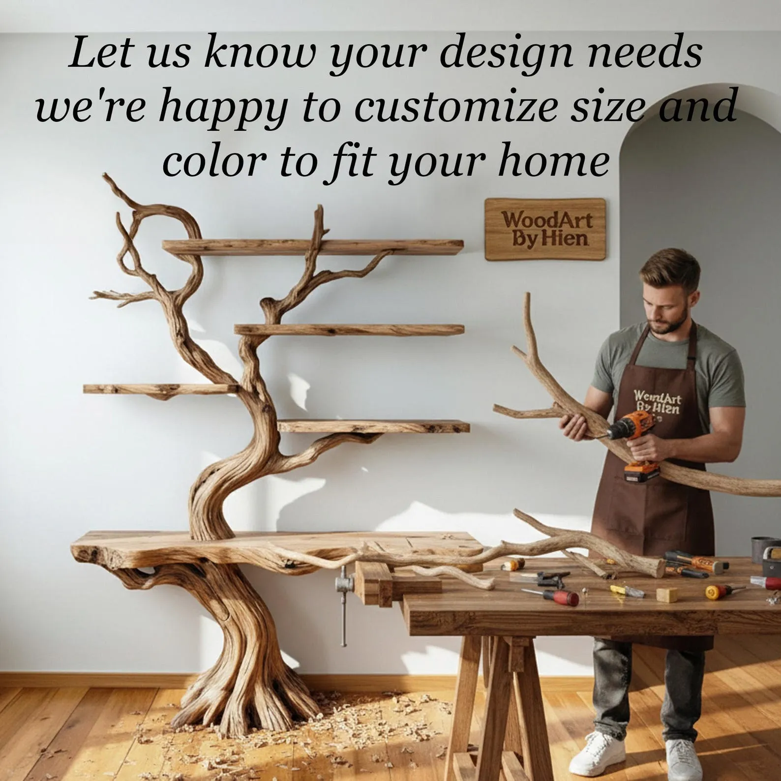 Each branch is cleaned, dried, and sanded by hand to preserve its natural texture and grain. The combination of driftwood and solid hardwood creates a rustic tree bookshelf for living room that???s both artistic and functional. The natural surface highlights beautiful wood patterns, making it a statement piece for your wall.