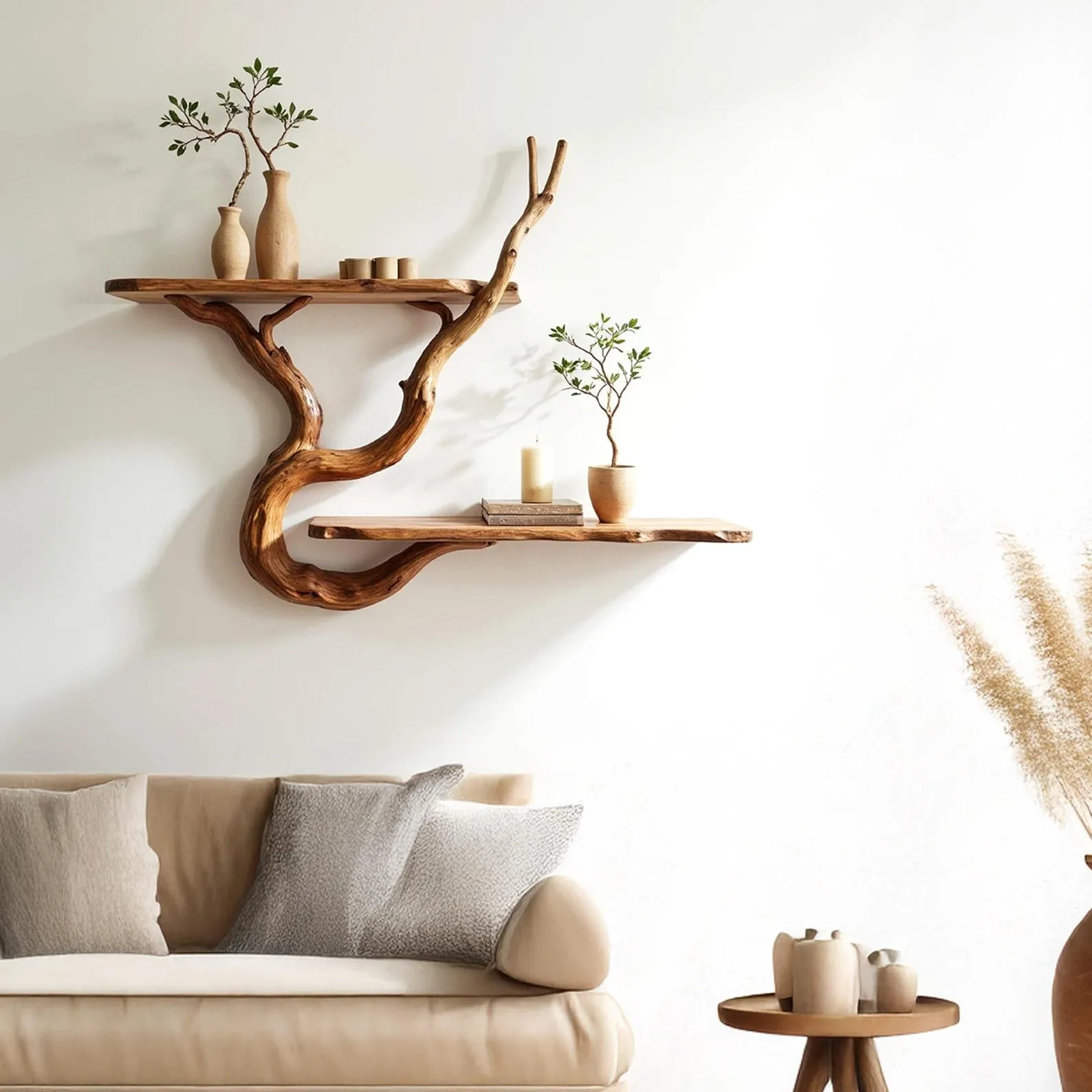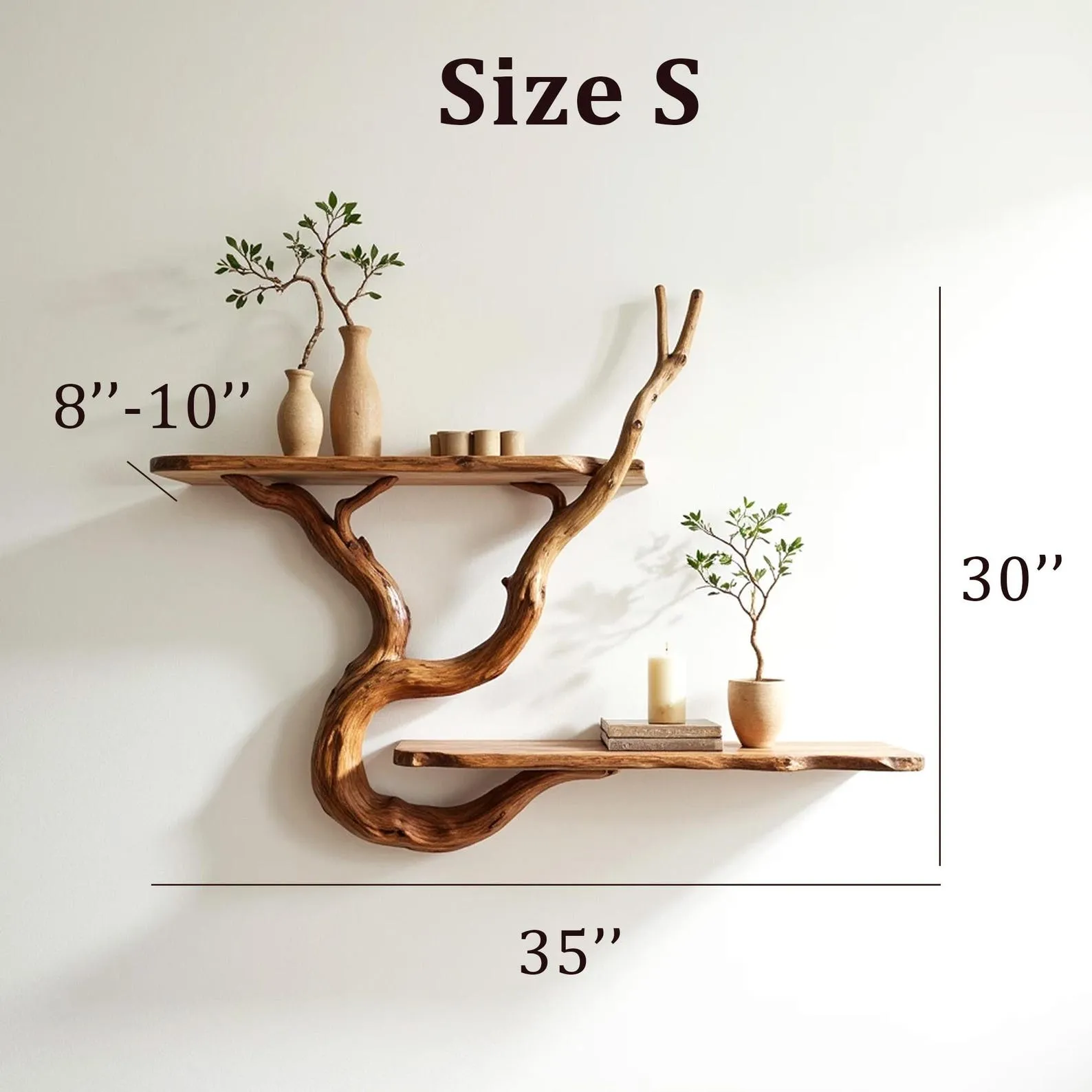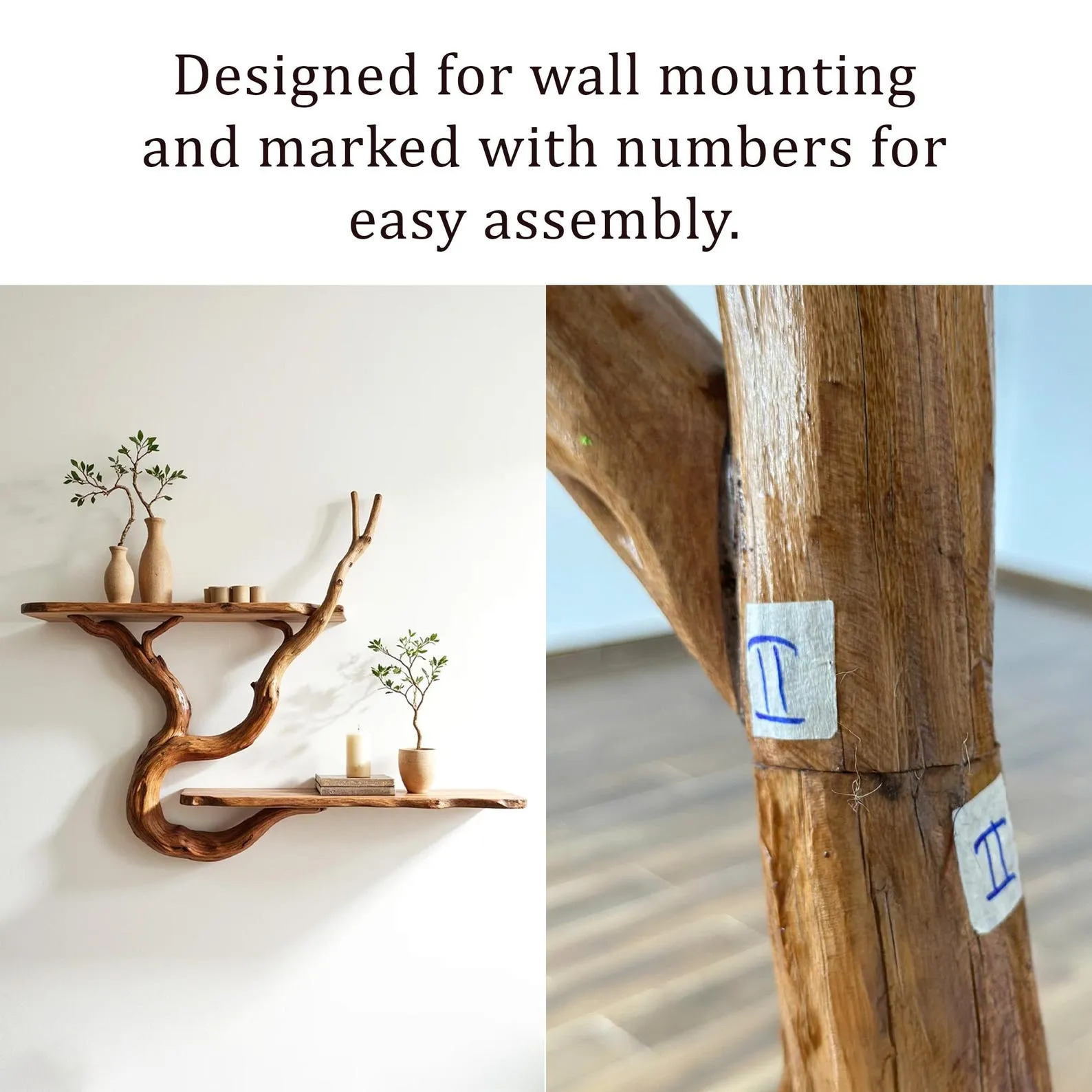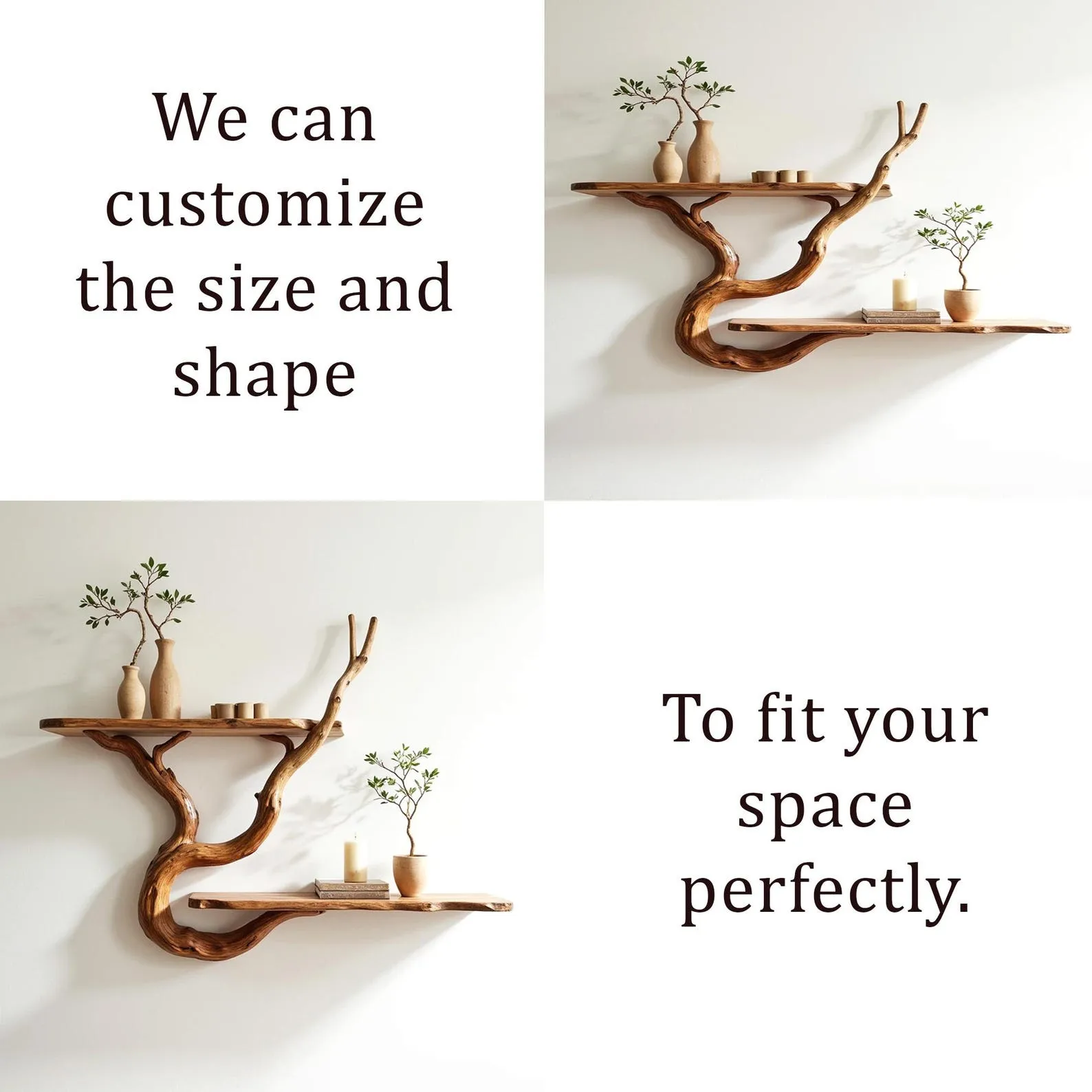 We carefully select driftwood tree branches from the high mountains of Vietnam to craft unique Natural wood bookshelf like this. Each tree shelf is handcarved by skilled artisans, highlighting the natural wood grain and distinctive organic curves. Because of this meticulous craftsmanship, every tree shelf is truly one of a kind, bringing a rustic yet elegant accent to your home Decor.Customizable Size & Shape:We understand that every space is different. That’s why we offer customization options for the size and shape of the live edge shelf, ensuring a perfect fit for your room and style preferences.’Easy Wall Mounting & Assembly:Designed for convenient wall mounting, each part of the corner tree shelf is marked with numbers to simplify the assembly process. Whether you’re experienced with DIY projects or prefer a straightforward setup, you’ll find installation hassle-free.Natural Variation:As this bookshelf is made from natural driftwood, please allow a size variation of 3 to 5 inches. These variations add to the authentic charm and uniqueness of your piece, making it truly special.Approval Before Shipping:We want you to be completely satisfied with your purchase. Before shipping, we will send you detailed images of your specific bookshelf for your review and confirmation. Please stay in touch so we can make any adjustments needed and ensure the final product meets your expectations.This driftwood bookshelf is more than just functional storage ‘ it’s a natural work of art that enhances any corner or wall. Perfect for displaying books, plants, or decorative accents, it brings warmth, character, and the beauty of nature into your living space.