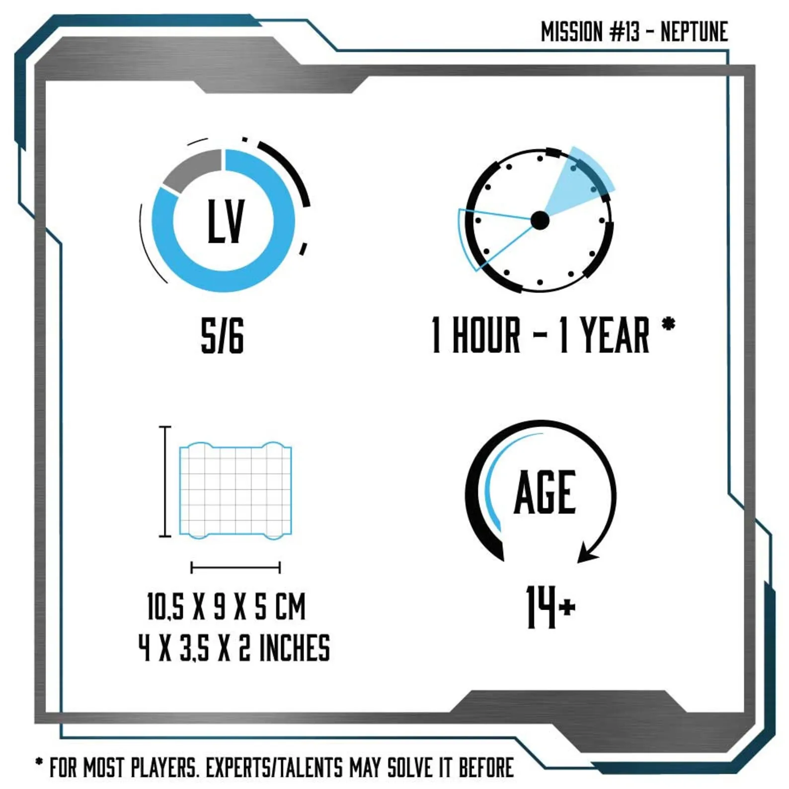 STAR ADVENTURES SERIESNew explorations with the puzzle series of Logica Giochi Italia Star AdventuresMission #13 – NeptuneCHALLENGE: Open the box and discover the secret hidden insideDifficulty: 5/6 INCREDIBLE. Average solution time: 1 day – 1 yearDimensions: 10,5 x 9 x 5 cm / 4 x 3,5 x 2 inchesInside: a booklet with curious information about the planet / celestial body you have purchased – history, exploration, curiosities, imagesPacked with box and personalized label of the Logica Giochi from the Star Adventures Series 11.3 x 9.9 x 6.3 cm / 4.5 x 3.9 x 2.5 inches