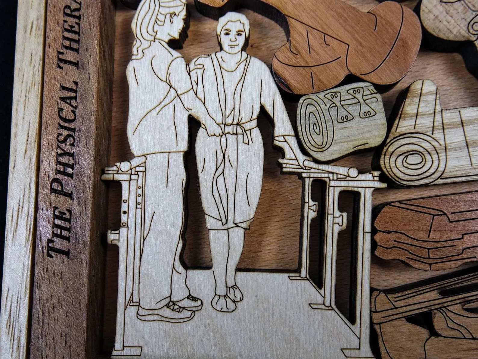 Dedicated to honor Physical Therapists.Can you fit all the pieces into the base? An attractive and fun wood puzzle yet quite difficult. You may need a Physical Therapist to treat the pain in your neck after attempting it?. The pieces show scenes or items associated with this profession. They are finely detailed and laser cut from ?? thick wood. There will be at least 4 different woods used in each puzzle and each puzzle will be a little different as we will mix up the woods. Pieces include 2 Therapist/Patient scenes, fitness ball, Nerve Stimulation device, rubber glove, hand grip exercise, medicine ball, workout mat, man using exercise bands, exercise steps, ace bandage, & weight..For a modest fee, this therapist gift can be personalized (choose the engraving option) with a name or short message on the inner frame or on the cover. Might make a great gift for your care giver.Measures about 7.5? square in the base and cover.Original artwork by Alexandra Plummer.Made in our Hudson, FL shop. Not intended for children under 8 as it has small pieces and it is also very difficult to solve. Comes with a written solution.? 2016 Creative Crafthouse ?cut and paste this link to watch video:https://youtu.be/3kSksfhnrvE