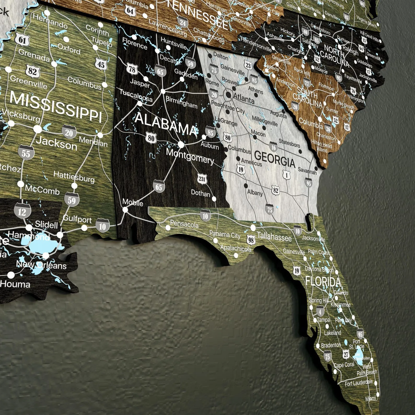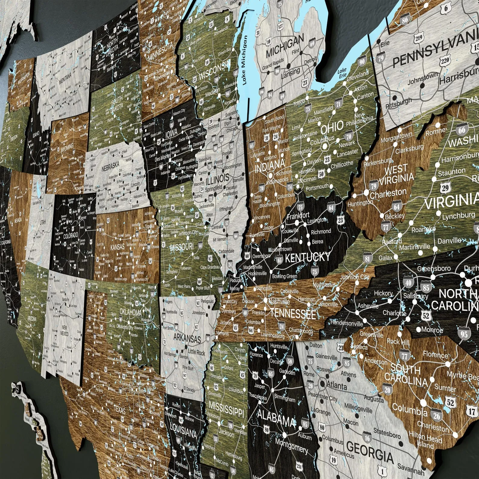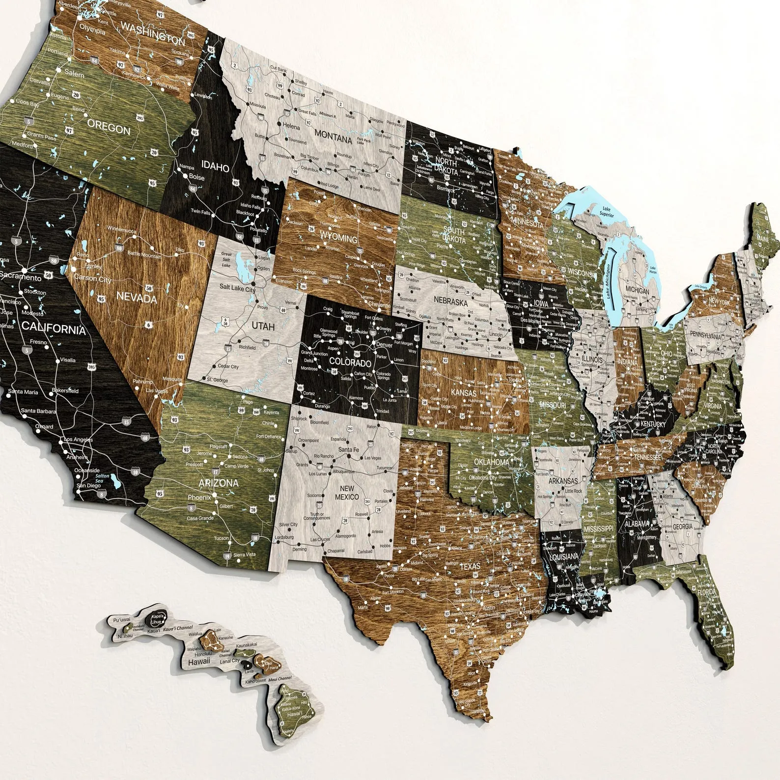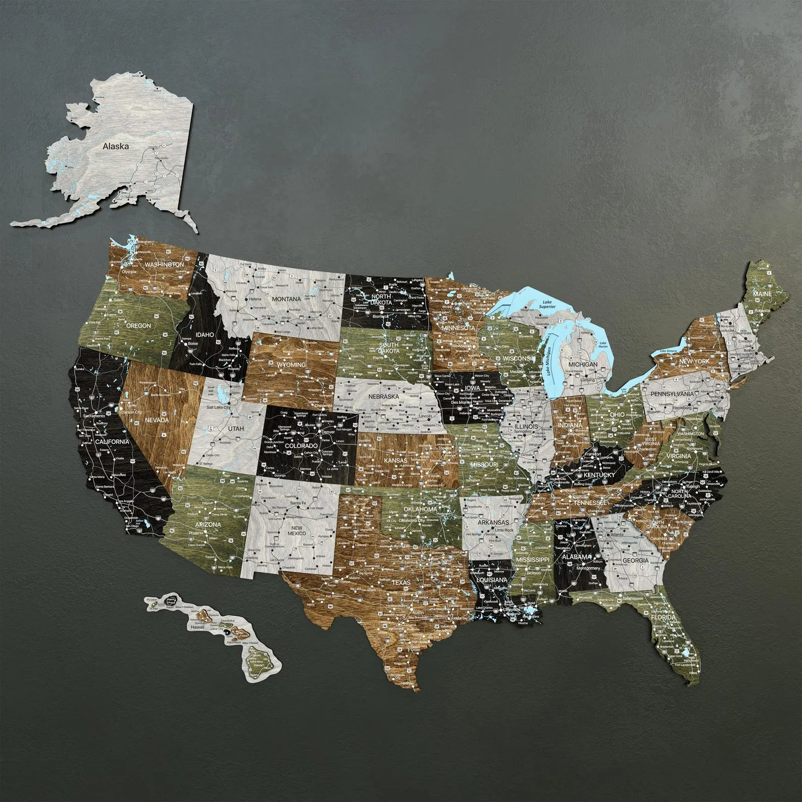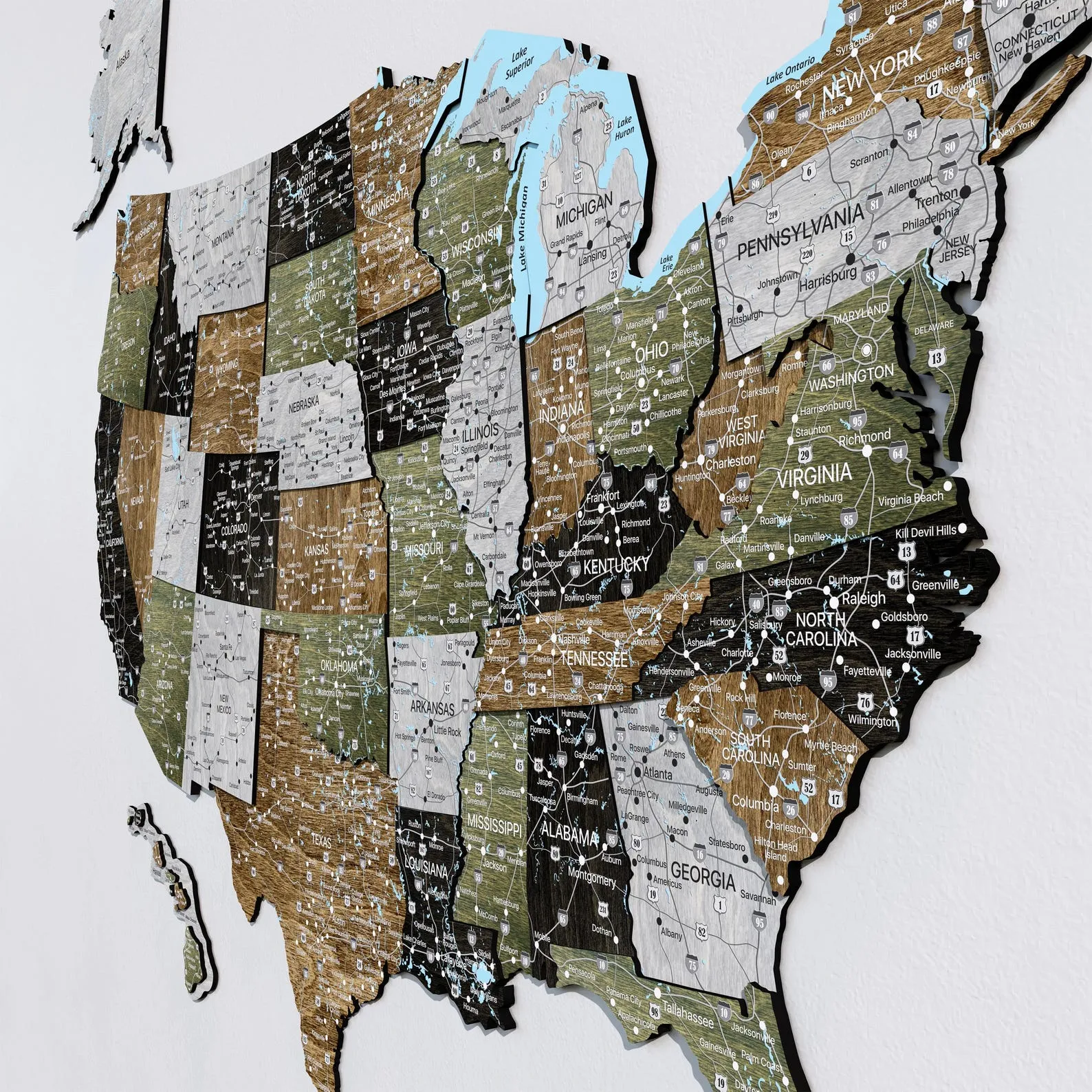 Crafted from the finest birch plywood, our USA map is finished with premium oil from Osmo (Germany) and printed with Nazdar UF Ink (USA), ensuring durability and detail. The map features colored inscriptions marking state names, natural landmarks, and more. It?s not just decor?it’s a visual representation of your travels. You can customize the map further with push pin state flags or transport pins to mark each place you’ve visited.
