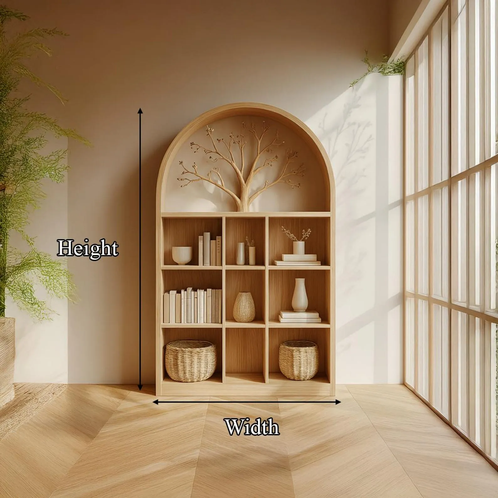 Bring natural beauty and rustic elegance into your space with this Storage Cabinet where handcrafted charm meets everyday practicality. Made from 100% solid natural wood, this arched-top cabinet features four spacious levels with three cubbies on each tier, offering a versatile way to store and display your books, plants, or treasured Decor pieces. Its warm wooden tones and graceful arch design create a cozy focal point for any room.Features Youll Love: Solid Natural Wood Crafted from durable solid wood with unique natural grain for lasting beauty and strength. Elegant Arched Top Design Adds a soft architectural detail that makes this piece stand out in your home. Four Levels with Twelve Open Cubbies Provides generous storage and display space for a variety of items. Rustic and Warm Style Brings cozy character to bedrooms, living rooms, or reading corners. Handcrafted & Unique Each cabinet is individually handmade, celebrating authentic craftsmanship and natural charm.? Perfect For: Organizing books, toys, or decorative items in bedrooms or living spaces. Creating a warm rustic statement piece that blends function and style. Giving as a thoughtful and practical housewarming gift.? Eco-Friendly & Sustainable: Crafted from responsibly sourced solid wood and finished with non-toxic protective oils, making it safe for your home and gentle on the environment.