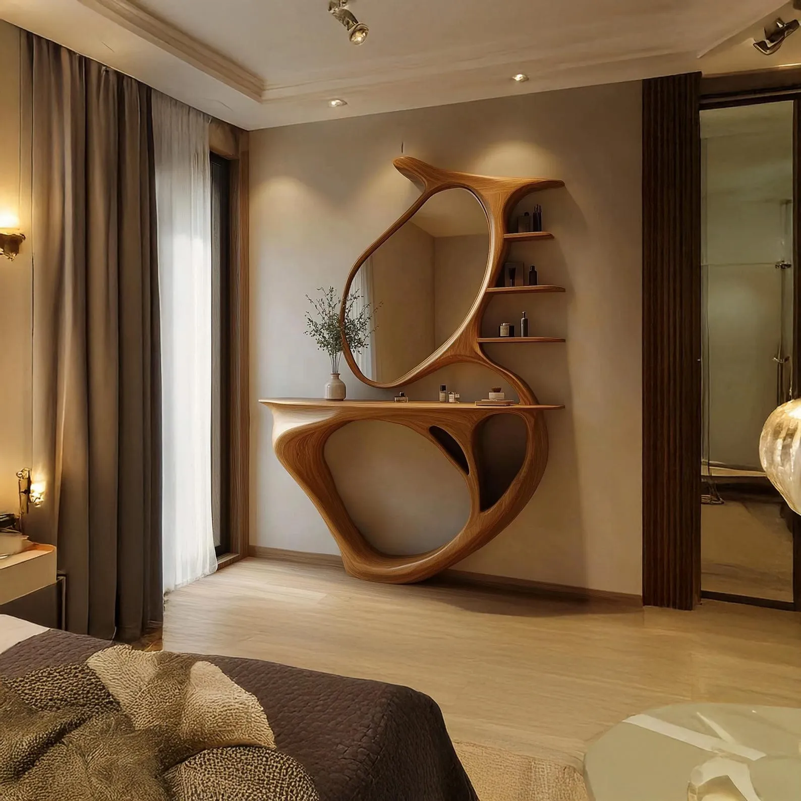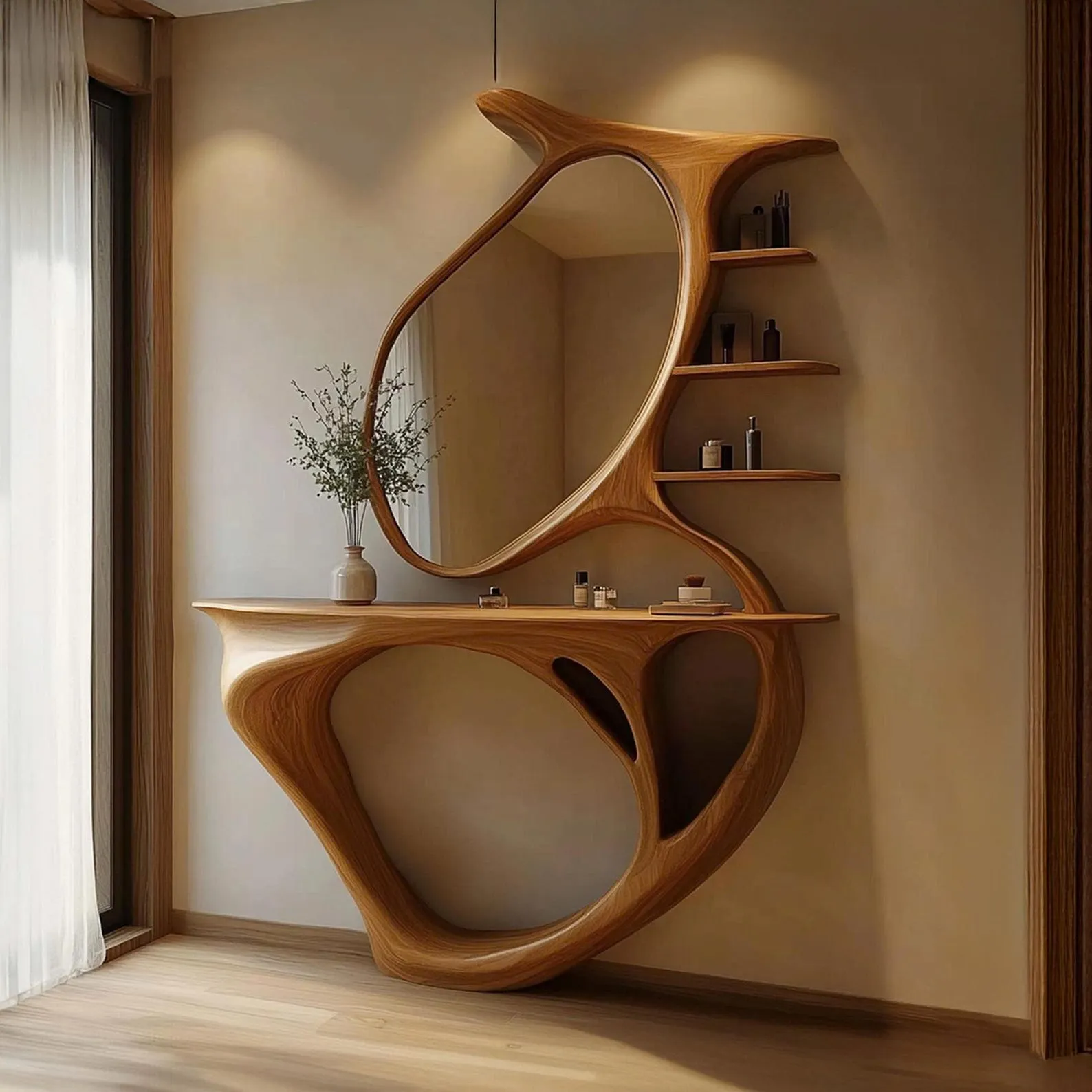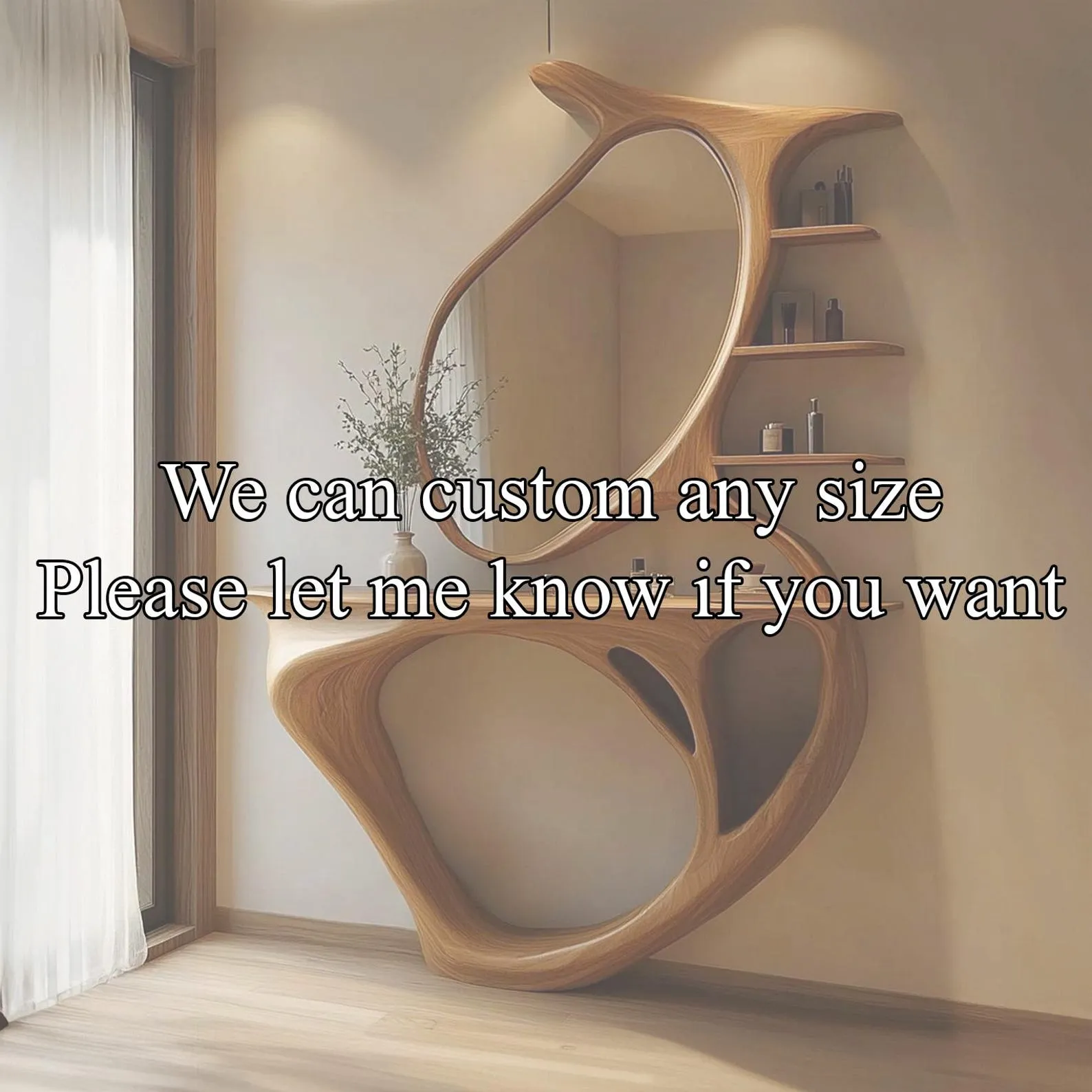 Bring timeless warmth and artistic beauty into your space with this Rustic Wooden Vanity Set, meticulously handcrafted from solid wood with a live edge design that celebrates the raw elegance of nature. This bespoke set features an organically shaped mirror, spacious tabletop, and built-in shelvesperfect for storing everyday essentials or displaying your favorite decorative items.
