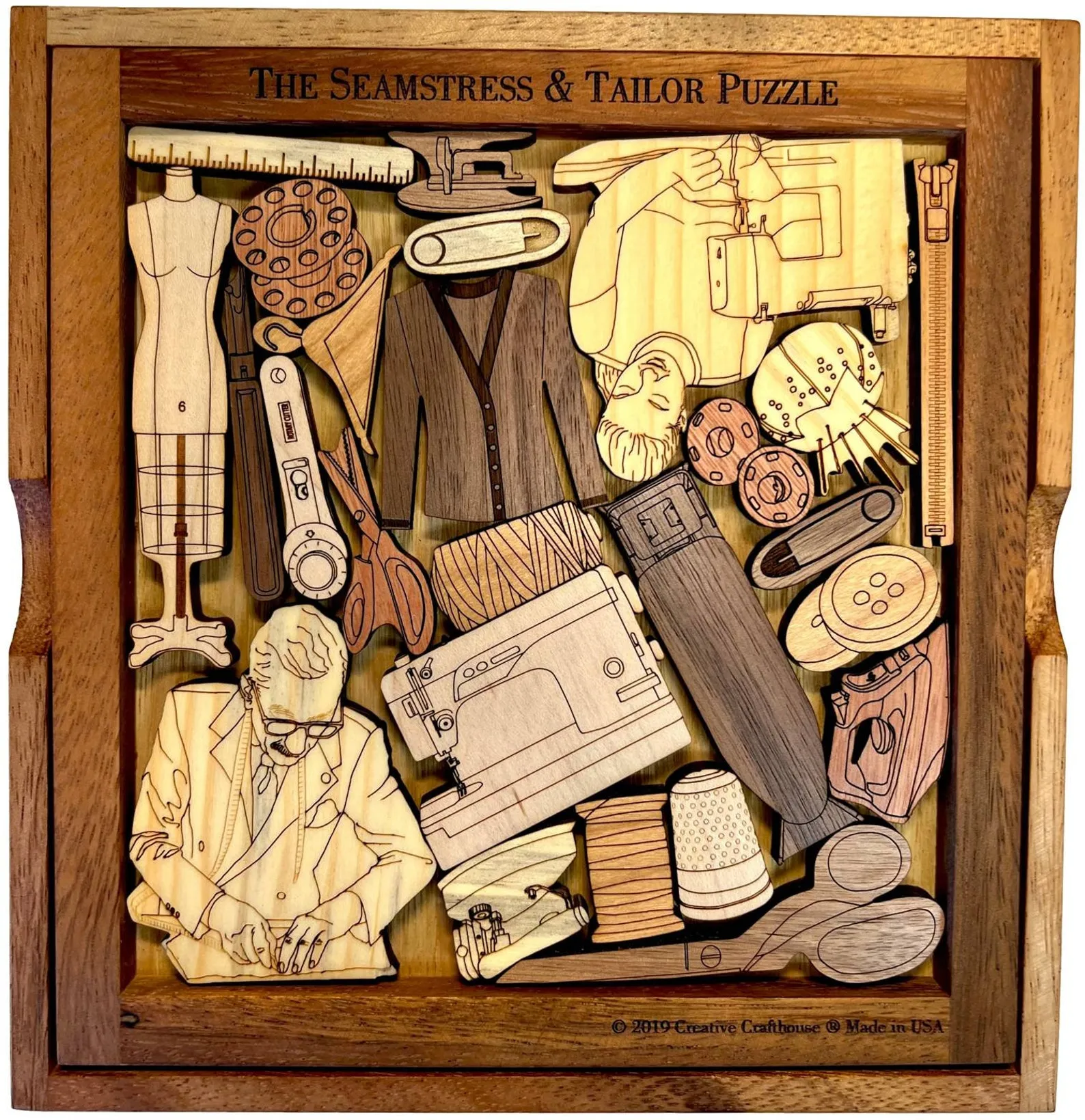 A challenging and artistic tailor puzzle for the couturier or sewing expert. Not quite as difficult as creating a fashion masterpiece, but maybe close:) 25 items associated with the clothes making profession are to be inserted in the frame. Pieces are precision laser etched and cut. This is one of our most detailed puzzles in the picture frame series of puzzles. This brain teaser puzzle can be personalized (choose the engraving option) with a name or message. Base frame is about 7? square and comes with full cover to protect all the pieces. Made from at least 4 different hardwoods at 1/4? thick ? 2019 Creative Crafthouse ? orignal artwork by Lynn Meuller. Made in our Hudson, FL woodshopTo View a video of the puzzle cut and paste this link: https://youtu.be/cdP-1u8OWlM