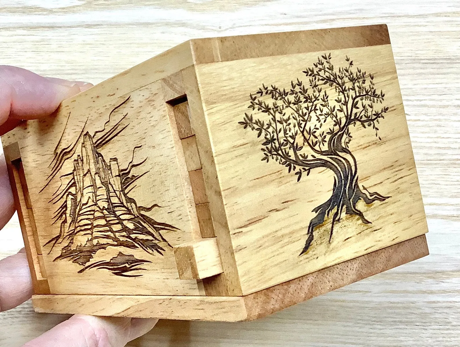 Secret Lock Box I Premium Wood Puzzle Box – Laser Engraved Nature Scenes on Each Side