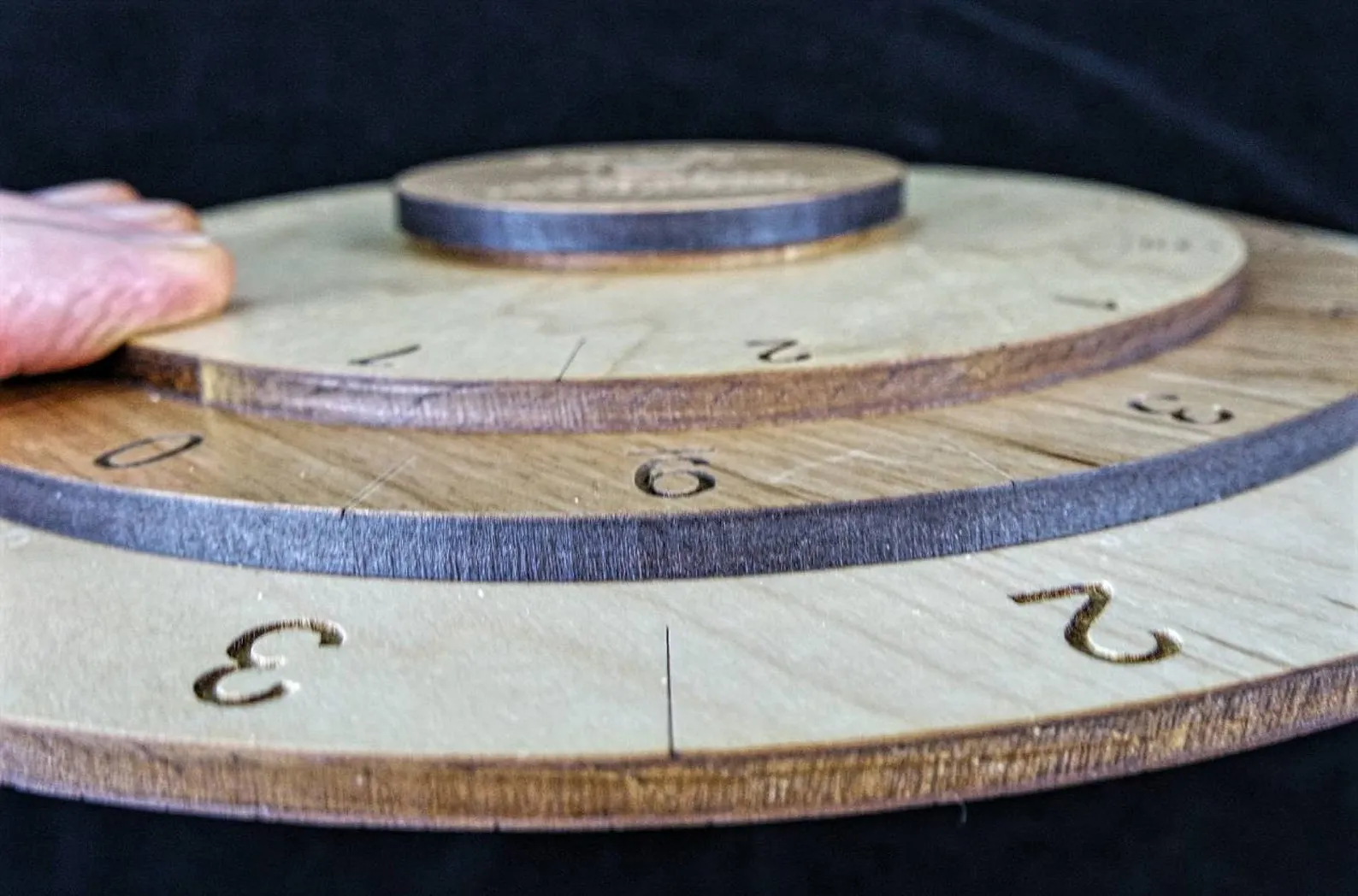 Your goal is to arrange the 3 wheels such that each column adds to the same number. Part of the challenge is that you don?t know what that number should be. We designed this puzzles with Escape Rooms in mind and it is also something that many grade schools may find useful. It may look difficult, but is actually achievable in a 5 to 10 minute time frame by a reasonably capable adult and perhaps 15+ minutes for a child 10 and up. It meets time constraints of Escape Rooms and is something that might be done by a child with basic addition skills. There is only 1 possible solution.For Escape Rooms, the secret sum answer may be useful as part of a combination or clue. Also, when solved the numbers associated with the any one column are unique and could be useful as part of a combination or clue. The outer disk is 10 inch diameter and the inner shaft has a 2.5 inch core, so it is very strong. Each disk is about ? inch thick. Text is all deeply laser engraved.Comes with a written solution.Designed and made in our Hudson, FL shop. Copyright 2016 Creative Crafthouse.to see a Video, cut and paste this link:https://www.youtube.com/watch?v=TcYytJOleAM