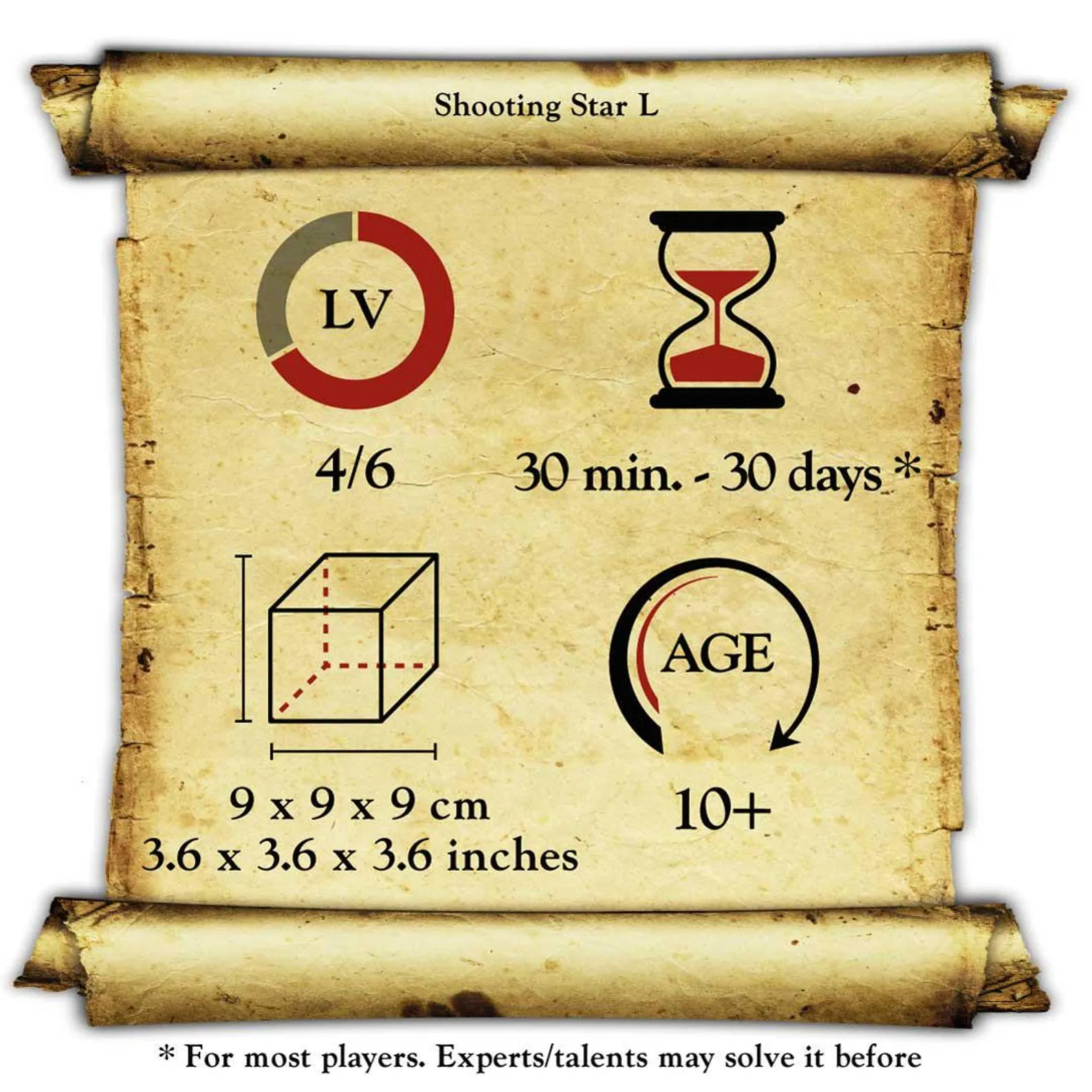 CHALLENGE: disassemble and assemble back this shooting star.An extremely tricky wooden puzzle, one of the most difficult classics made of 19 different shaped wooden pieces.Wonderful classic for Advanced players!Difficulty: EXTREME 4/6. Average solution time: 30 min. – 30 days.Dimensions: 9 x 9 x 9 cm / 3.6 x 3.6 x 3.6 inches.PACKAGING: LEONARDO DA VINCI CARTON BOX 10 x 10 x 10 cm / 4 x 4 x 4 inches.Teak/Samena wood.Handmade in Thailand