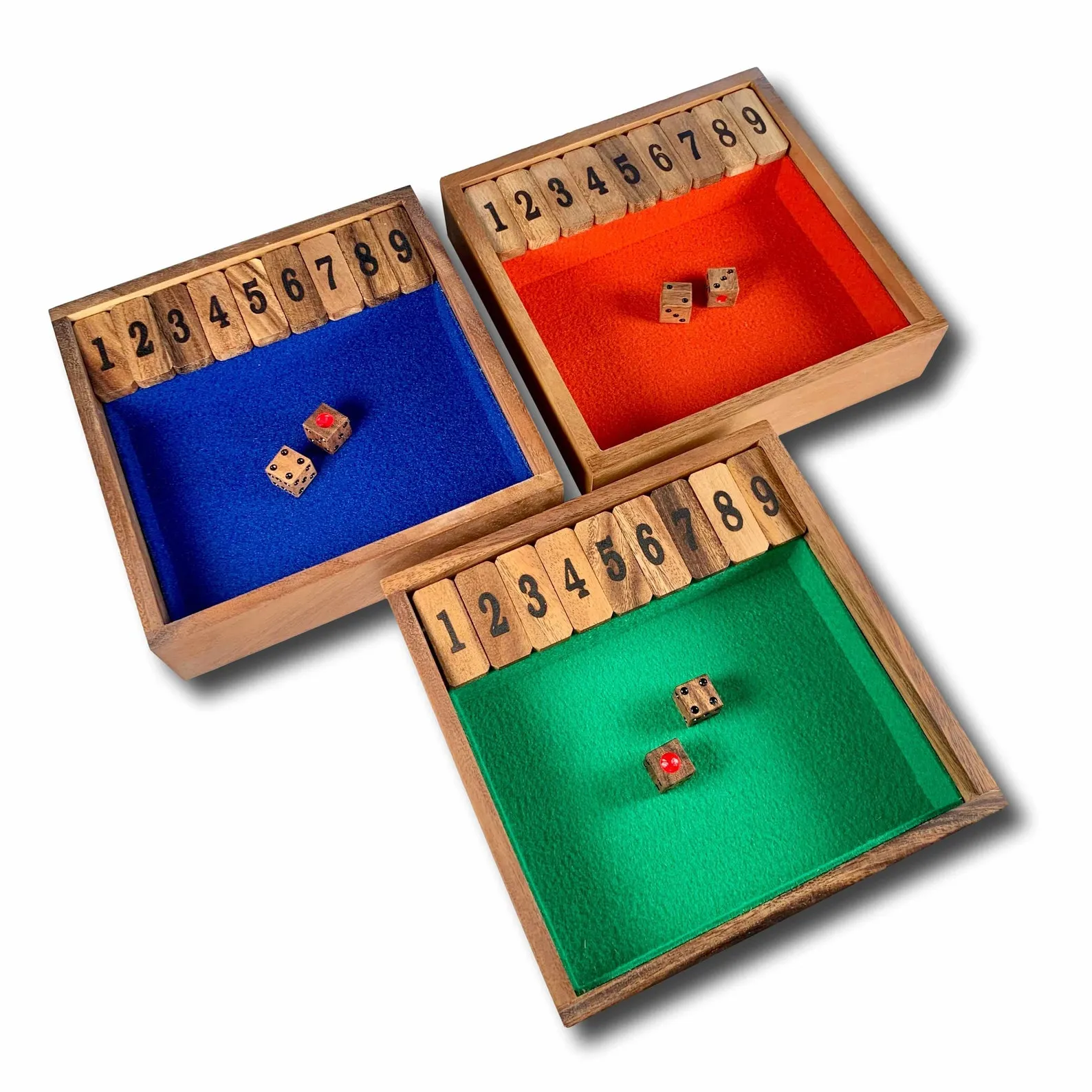 Originated in 14th century England and is played worldwide. Historically, this was a gambling and drinking game played by seafarers on the old sailing ships. Still is one of the most popular bar/pub games in the world, but has become a great family and school game. Roll the dice and try to eliminate all the numbers Easy fun game for the whole family and highly educational for the younger ones! This fast paced game appeals to a wide variety of folks. We sell these to schools, bars, nursing homes, waiting rooms, and more; but mostly to families as kids love this game and it develops both math and social skills. . This model is 9″ x 9″ and uses numbers #1-#9. Available in red, green, or blue felt. This is our new upgraded model with thicker wood, high grade felt and wood burned numbers.