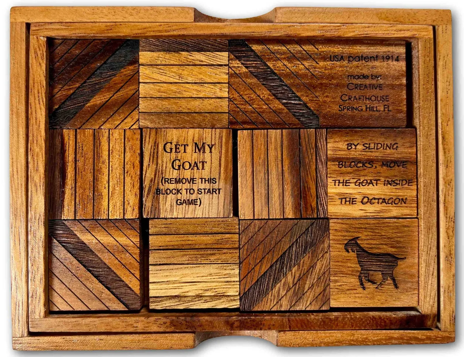 This is a sliding block puzzle where the object is to move the piece with the Goat on it to the position inside the cage. The cage must be intact with the Goat inside. It is moderately difficult with a minimum of 36 moves required if no mistakes are made. It took Gym about an hour and a half to solve this one. The puzzle dates from 1914. We saw a picture of the original puzzle in Jerry Slocums “Puzzles Old and New” from 1987 and I just loved the look and the concept. This is all hardwood construction and the patterns are all deeply laser engraved. Its a beautiful puzzle to look at and should last forever:) Comes with base and cover so you can keep all the pieces protected and even pickup a game later on where you left off. We also laser engraved the starting position of the puzzle into the cover so that you can put it back to the original starting orientation any time you want to start over. Something unique and special from our shop.Please copy and paste the following link in your browser for a video explaining this entertaining wood puzzle!http://vzaar.tv/775702