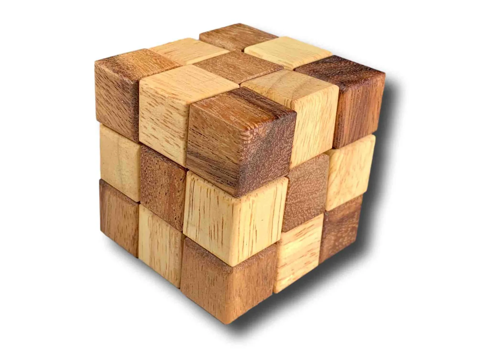 The cube unravels, staying in 1 piece like a snake. Can you get it back to the cube? A Great puzzle that stays in one piece so there are no pieces to lose.Good initial solution time is about 1 hour, but with practice this can be done very fast (under 10 secs) and made to look deceptively easy – thus has a high “showoff” factor:)These premium models have beveled edges on each of the 27 cubes that make up the snake. This gives an attractive and comfortable feel in the hand.This size is about 2.4″ square.Level of Difficulty: Level 3